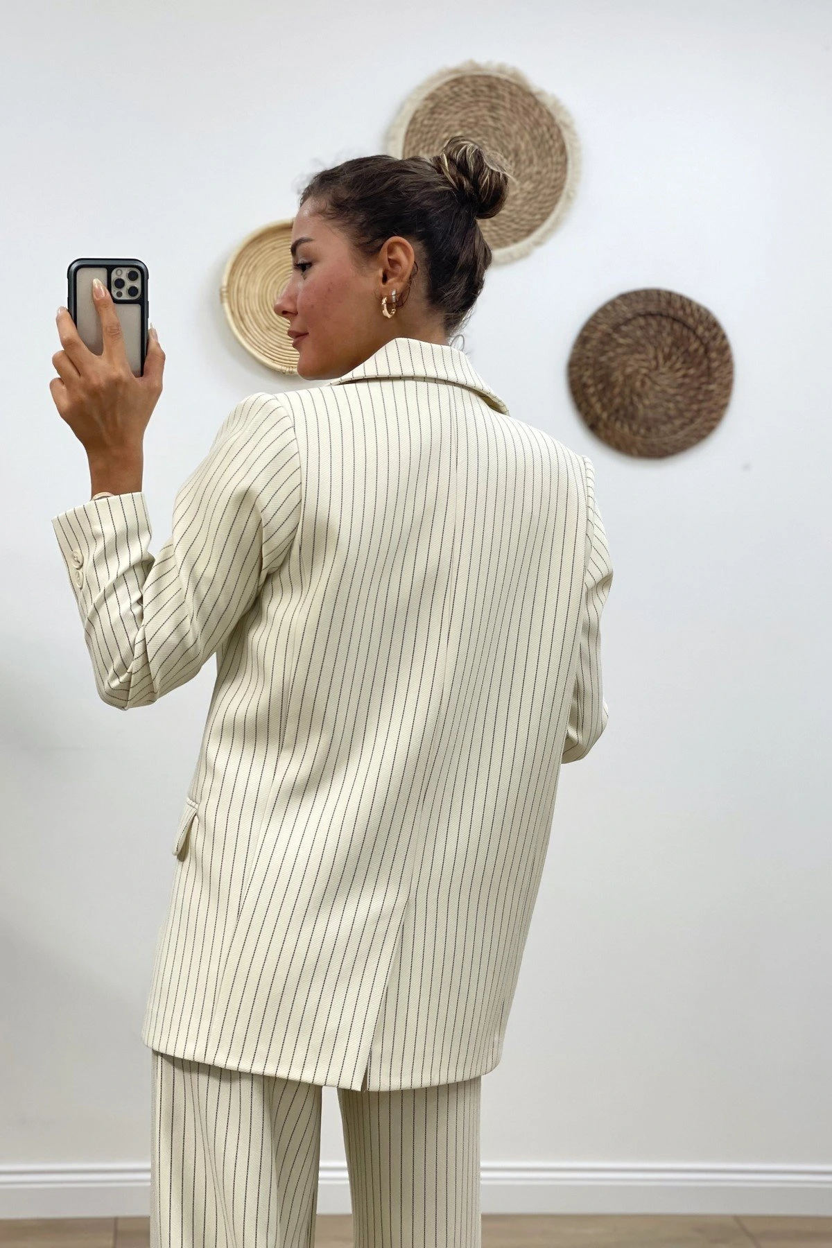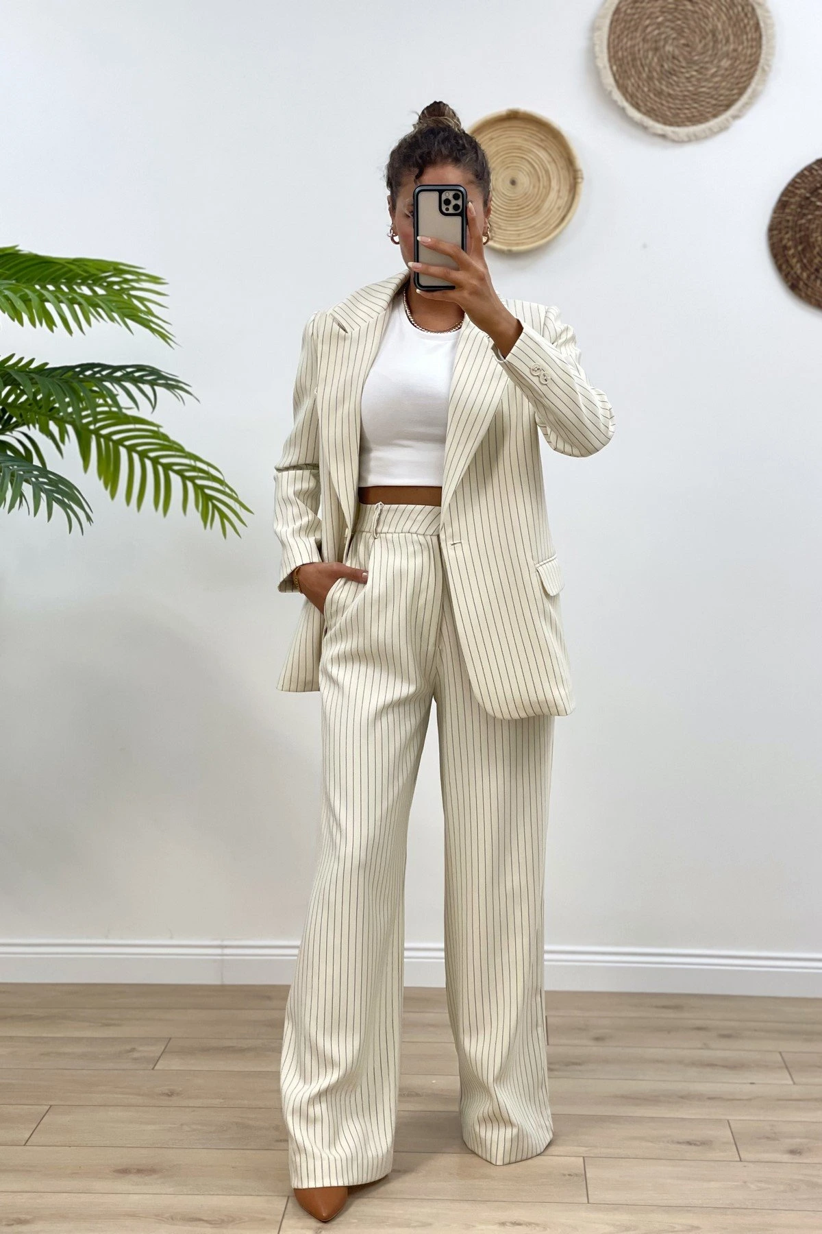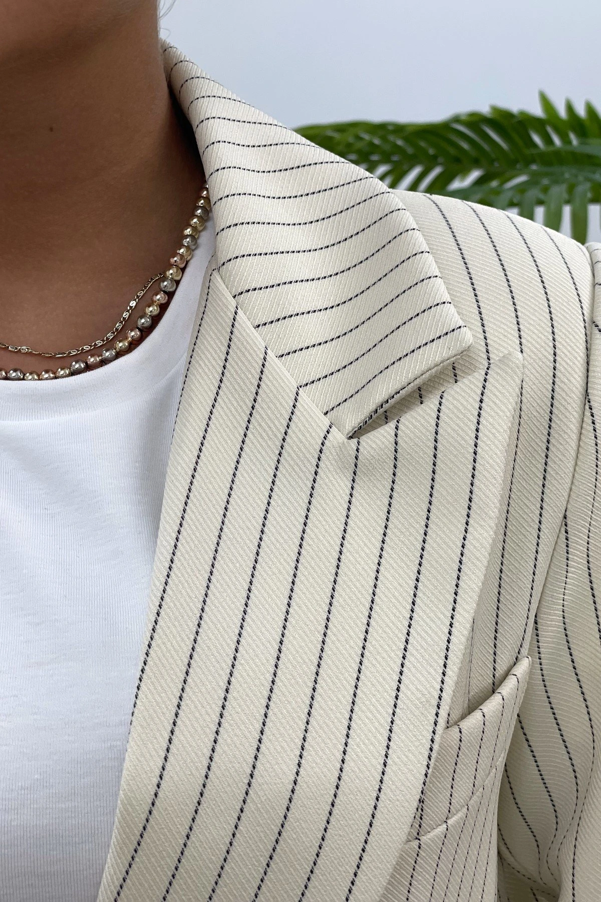 ÇİZGİLİ TEK DÜĞME BLAZER CEKET – EKRU