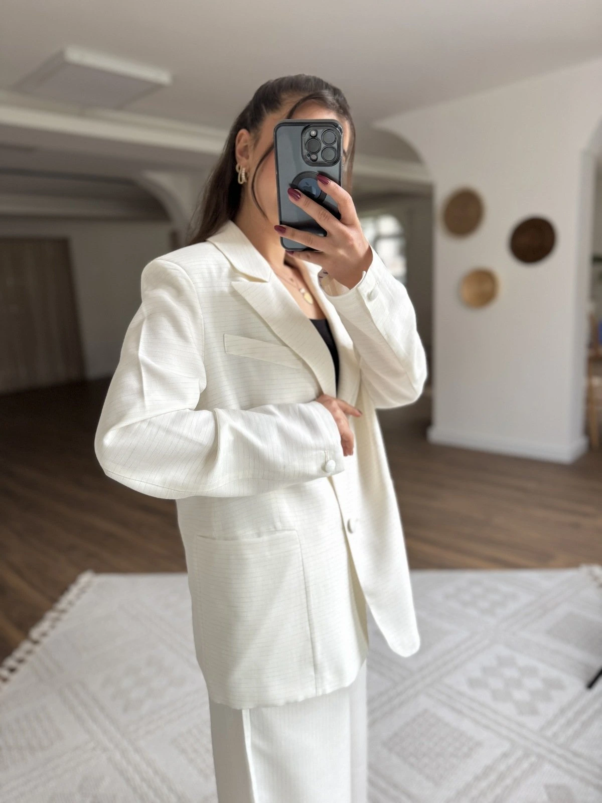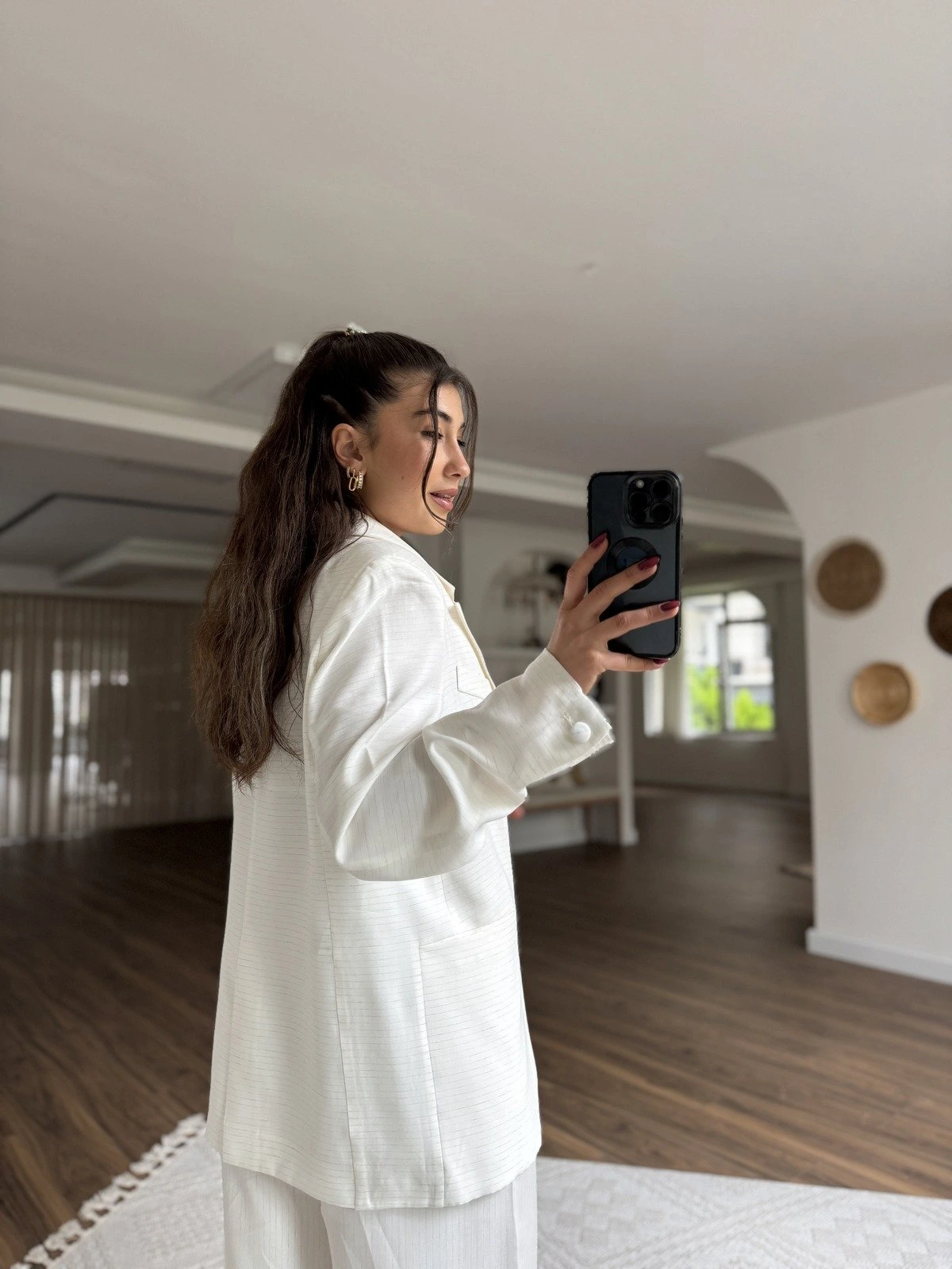 DÜĞME AKSESUAR DETAY TORBA CEP ÇİZGİLİ VİSKON KETEN CEKET – EKRU