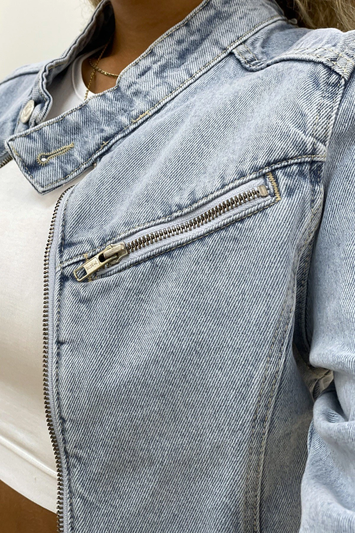 FERMUARLI DİK YAKA CROP JEAN CEKET – MAVİ