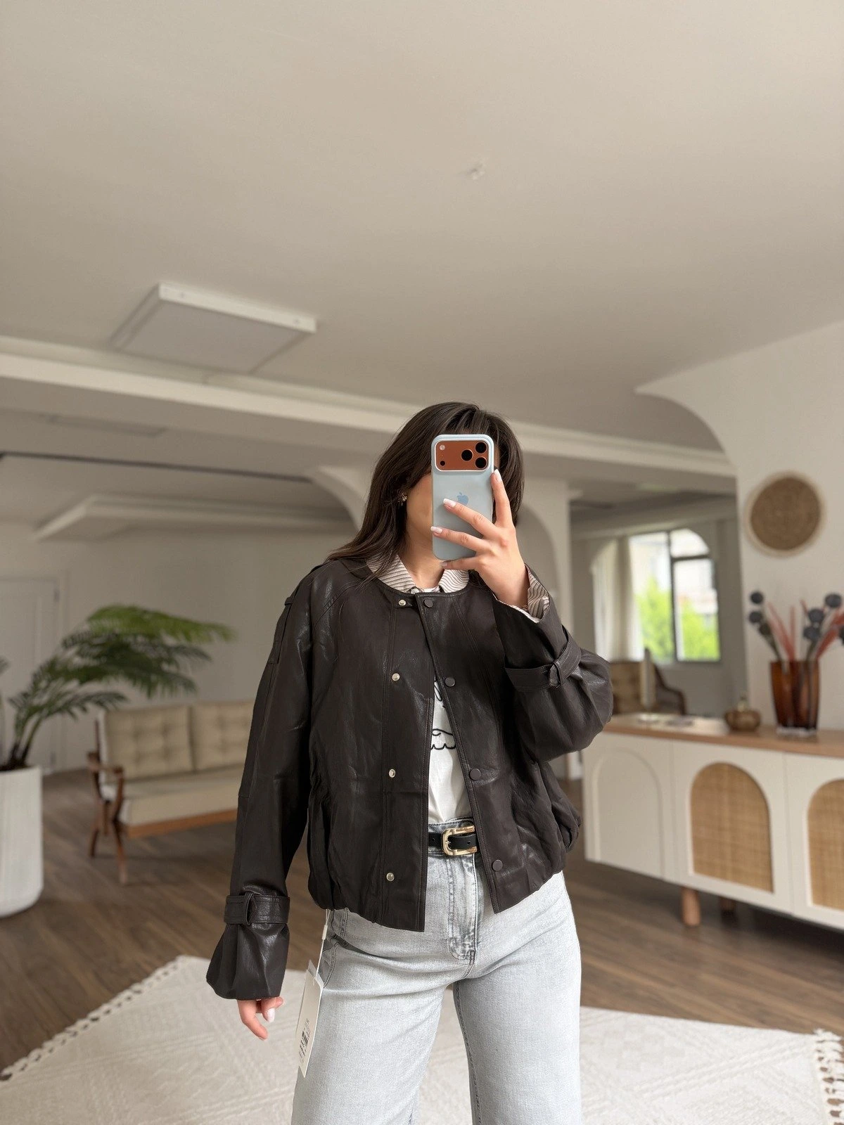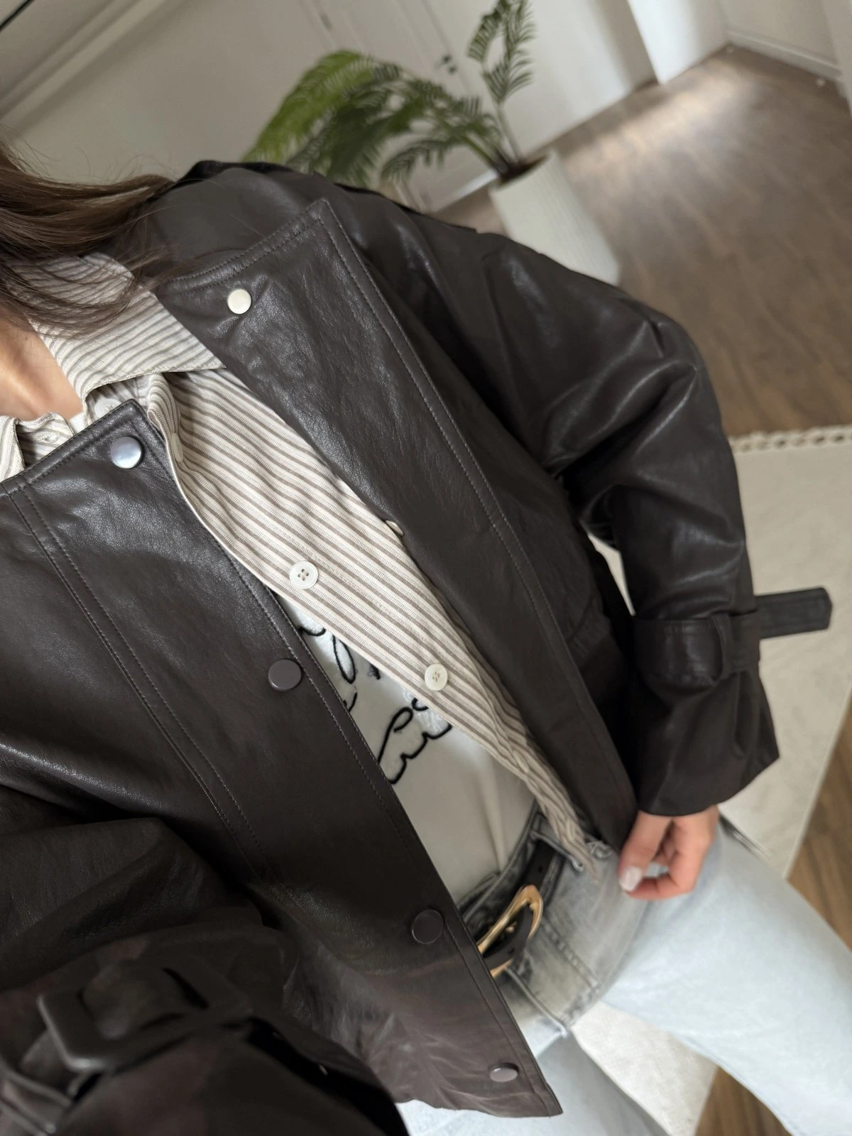 GÖMLEK YAKA DETAY BRİTLİ BEL LASTİK SUNİ DERİ CEKET – KAHVE