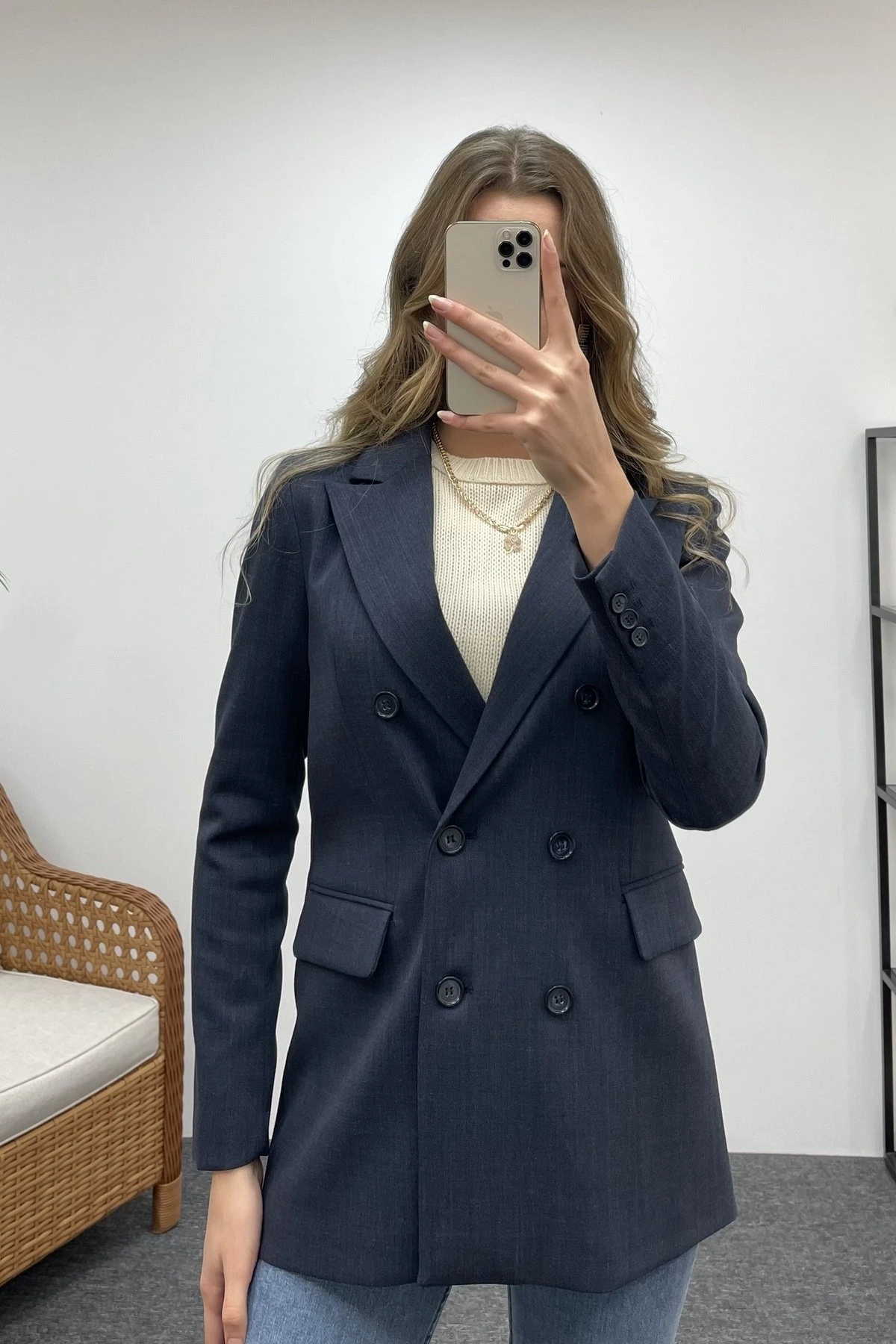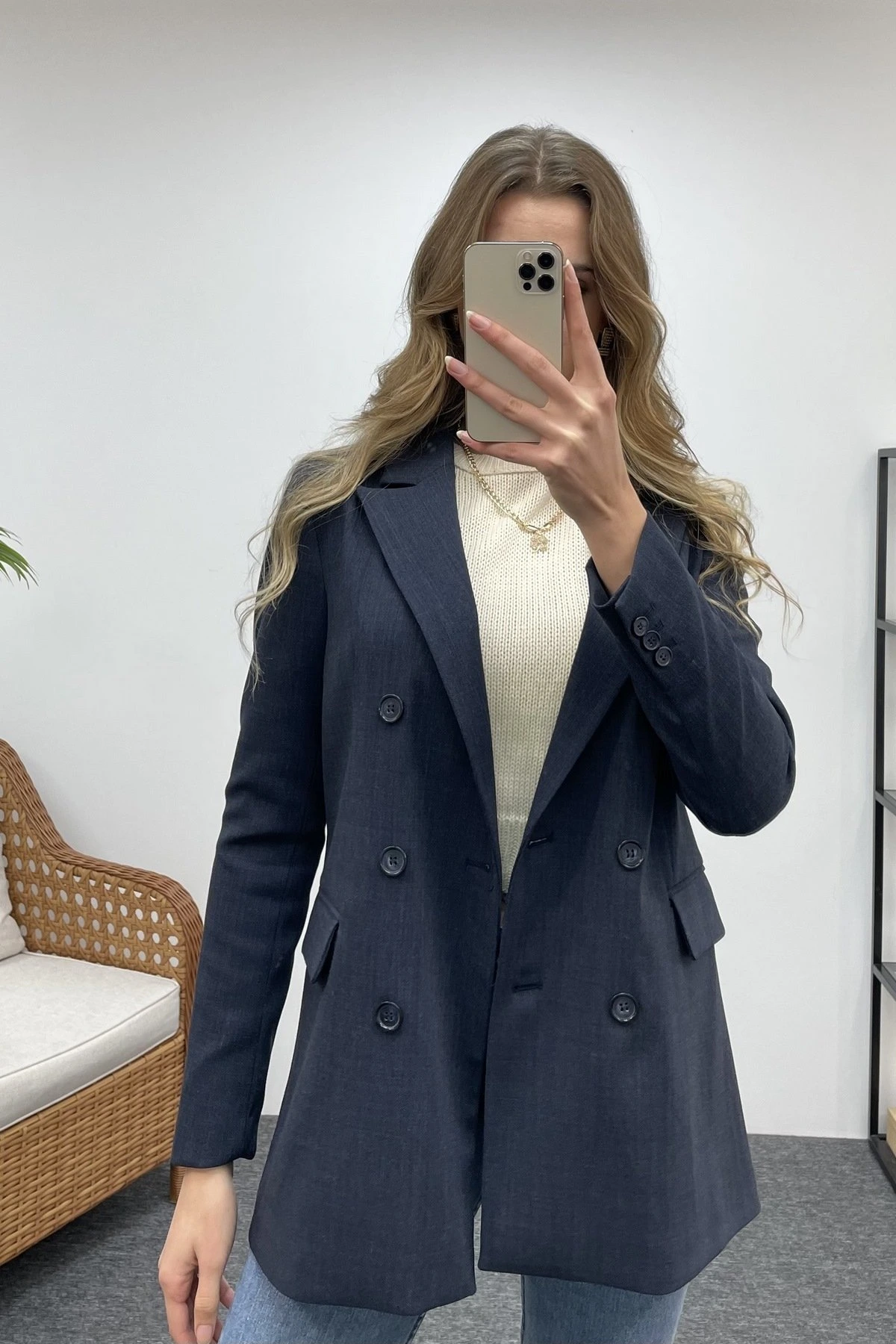 İTHAL KRUVAZE YAKA DÜĞMELİ CEKET – LACİVERT