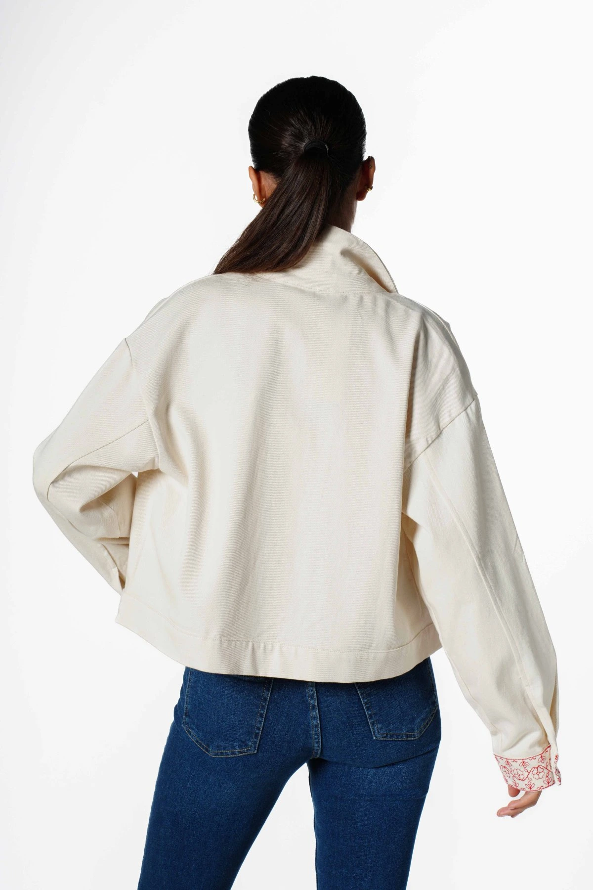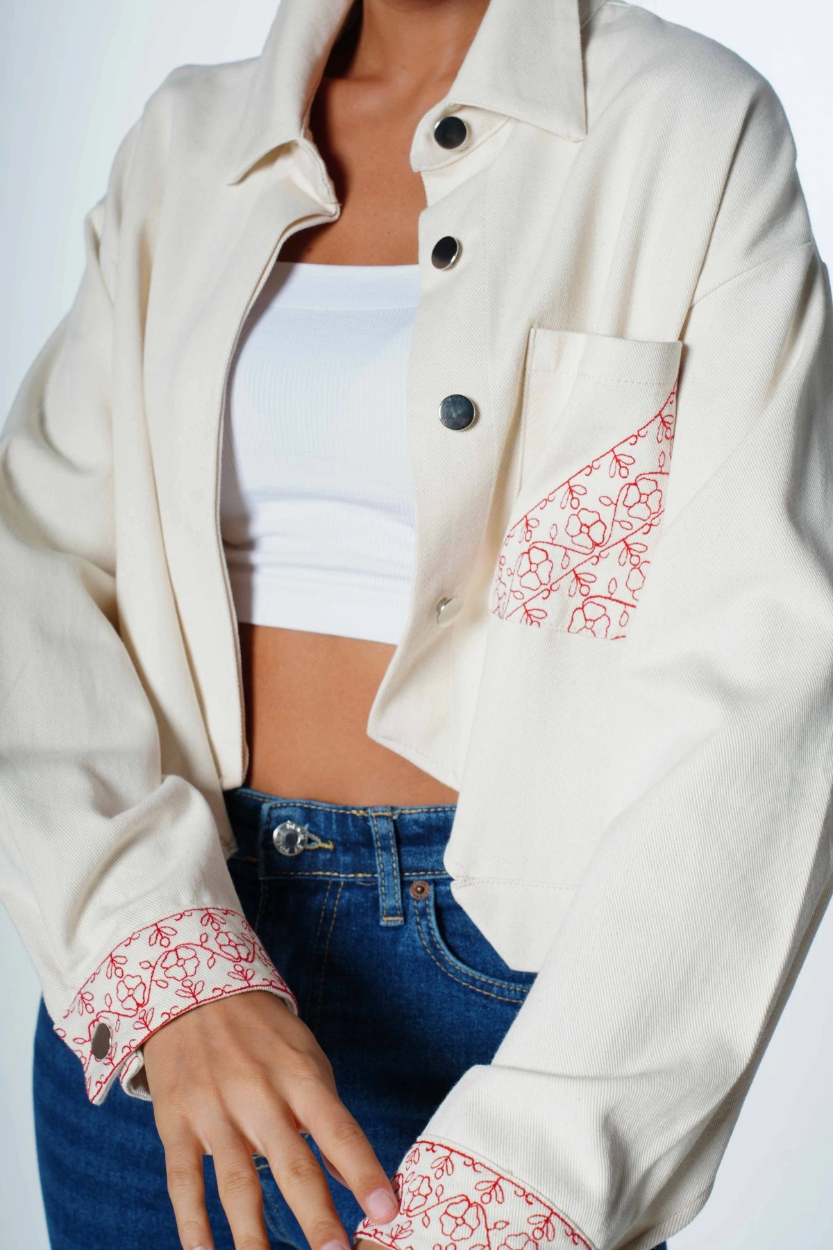 KOL VE CEP NAKIŞ İŞLEME ÖN ASİMETRİK KISA CEKET – KREM