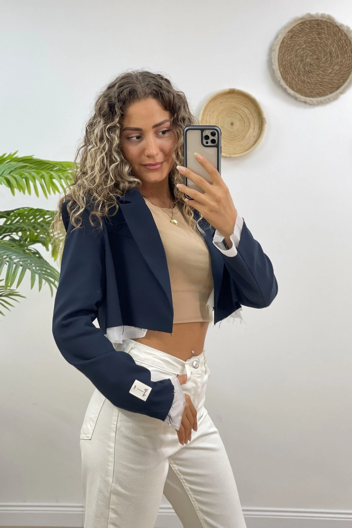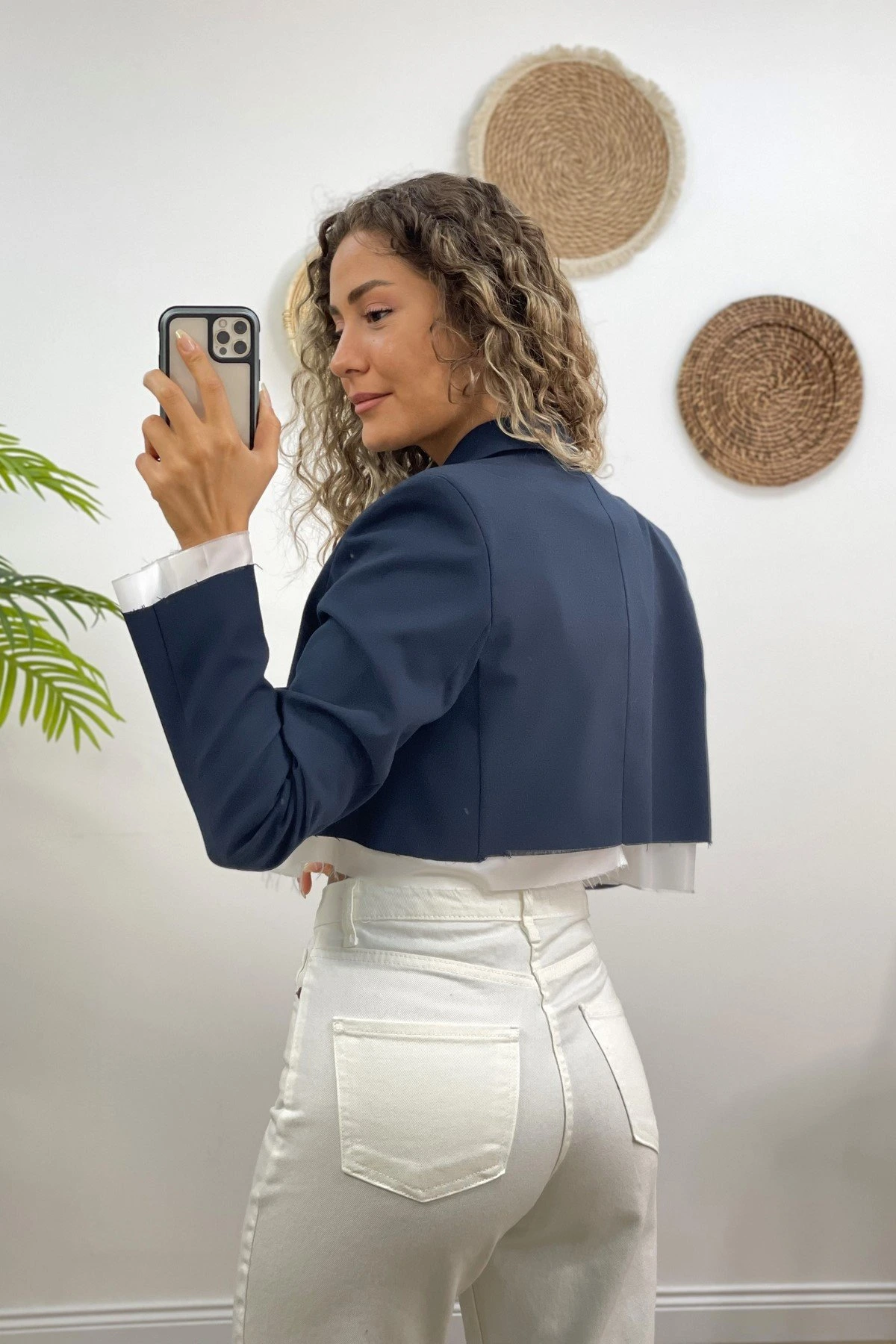 KOL VE TEK UCU KESİK CROP CEKET – LACİVERT