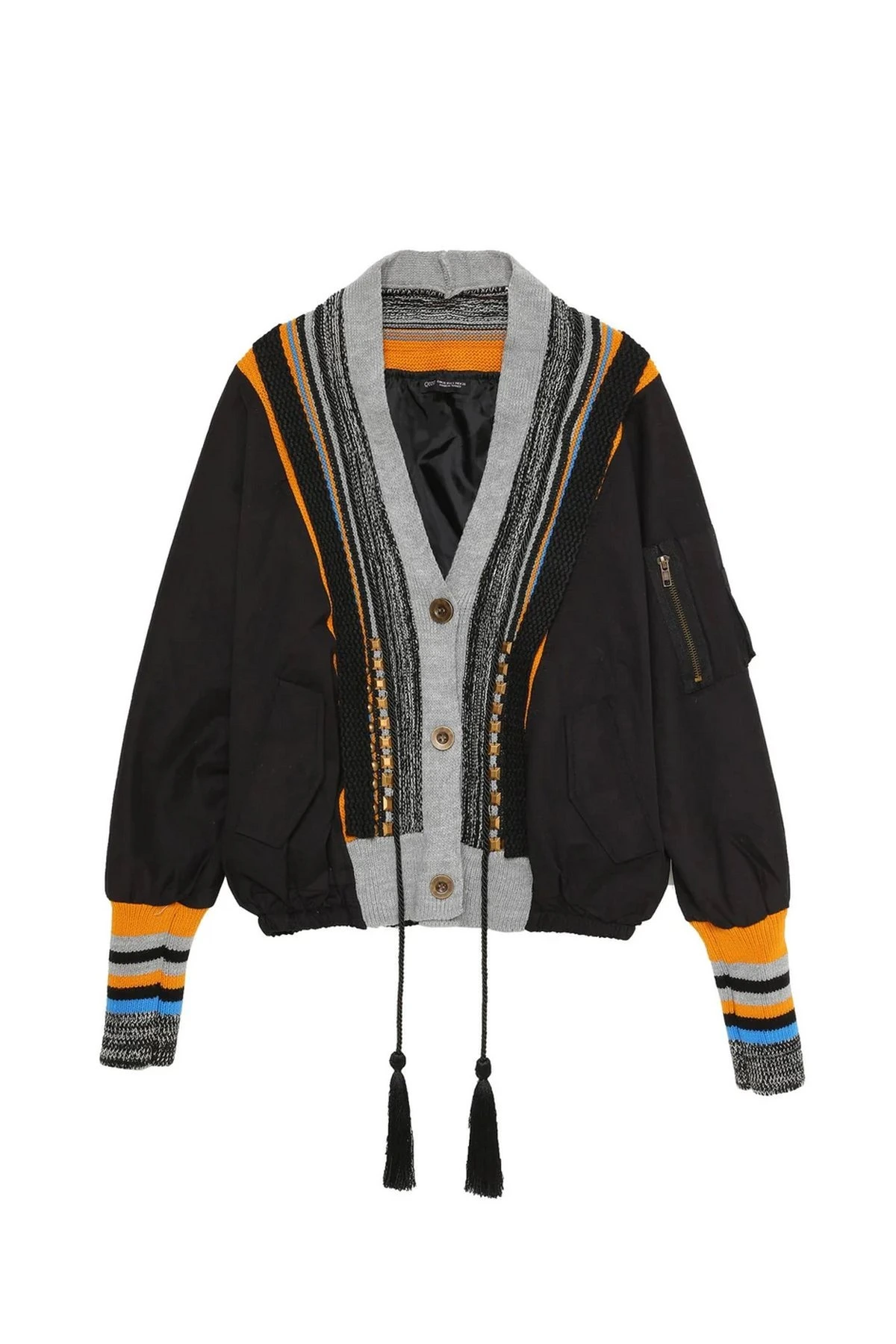 KOL VE YAKA RENKLİ TRİKO İP PÜSKÜL DÜĞMELİ İNCE CEKET – SİYAH