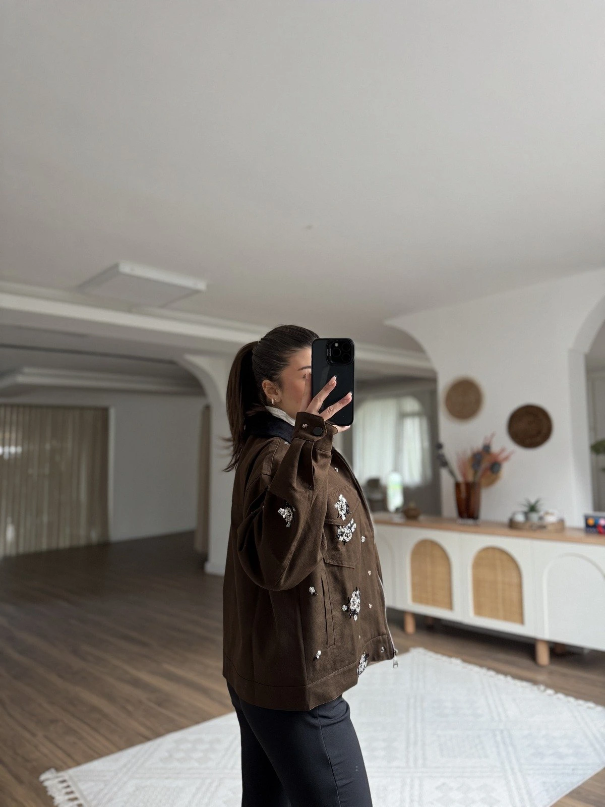 KONTRAST YAKA BONCUK İŞLEME ASTARLI PAMUK CEKET – KAHVE