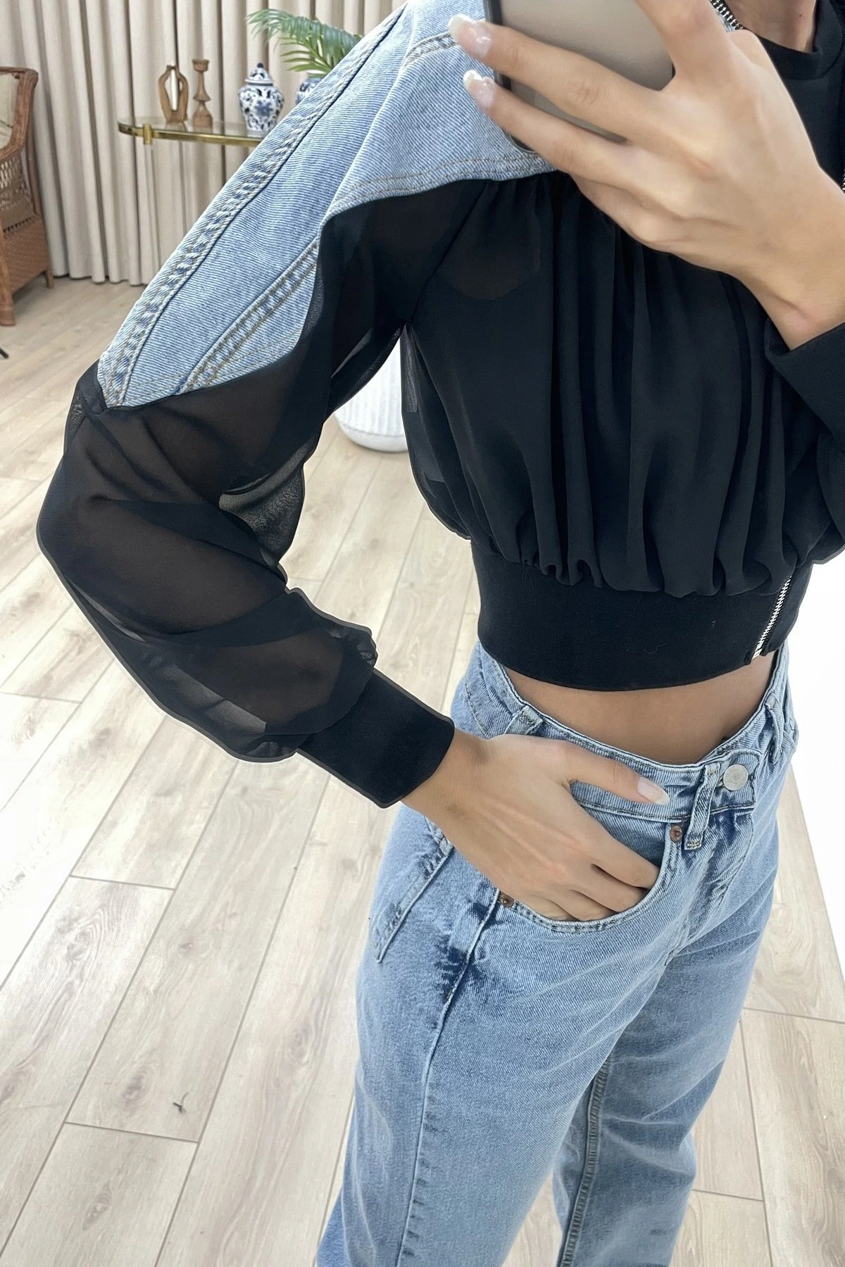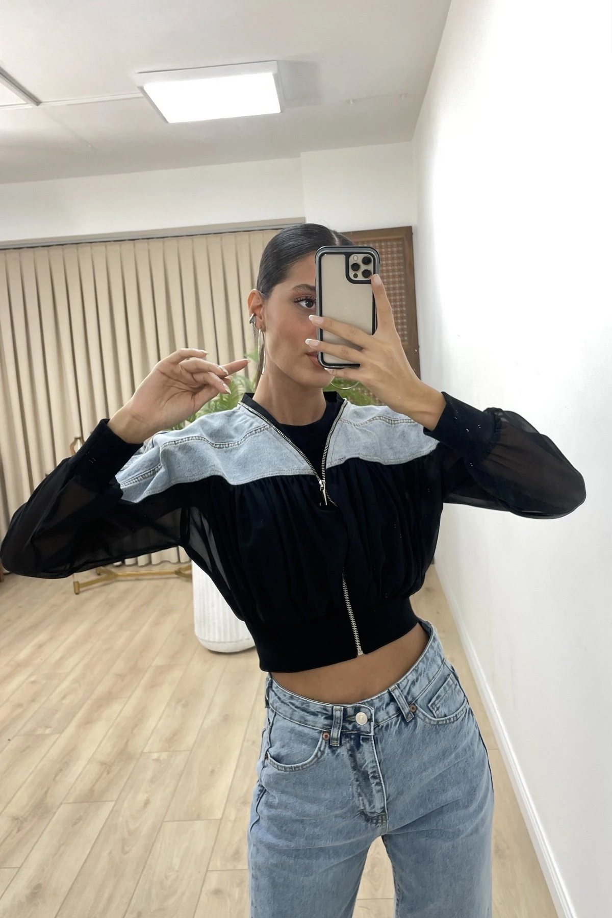 OMUZ JEAN DETAY ŞİFON FERMUARLI CROP CEKET – MAVİ