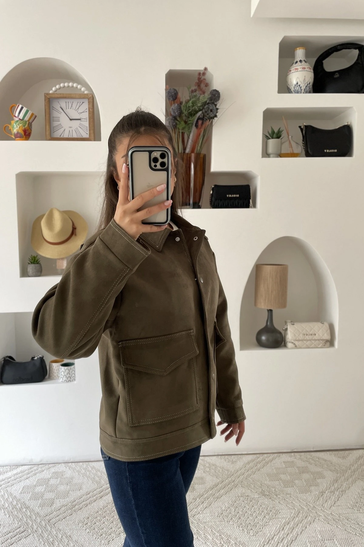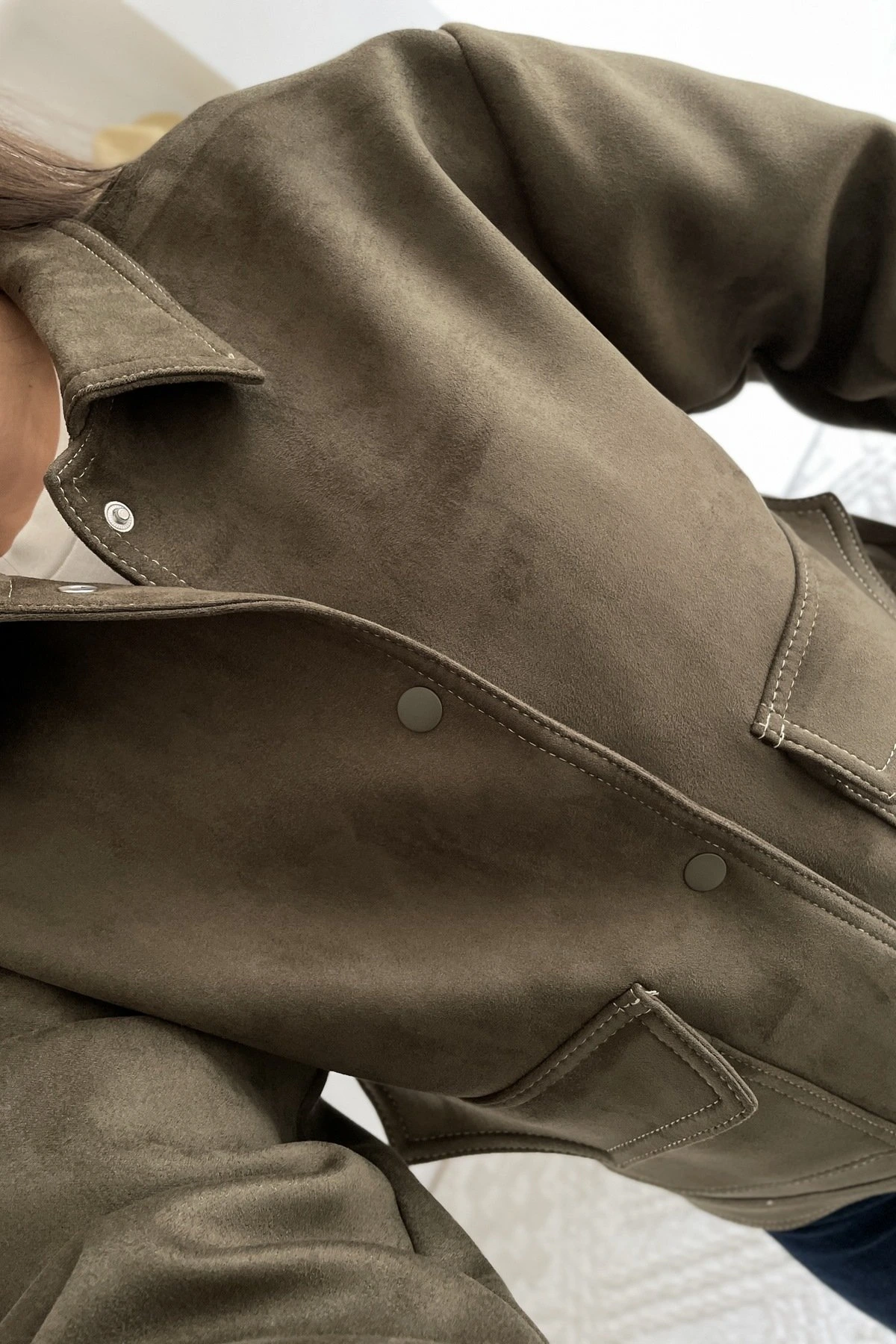 OVERSİZE ÇITÇITLI ÇİFT CEP SPOR DİKİŞ SÜET CEKET – HAKİ