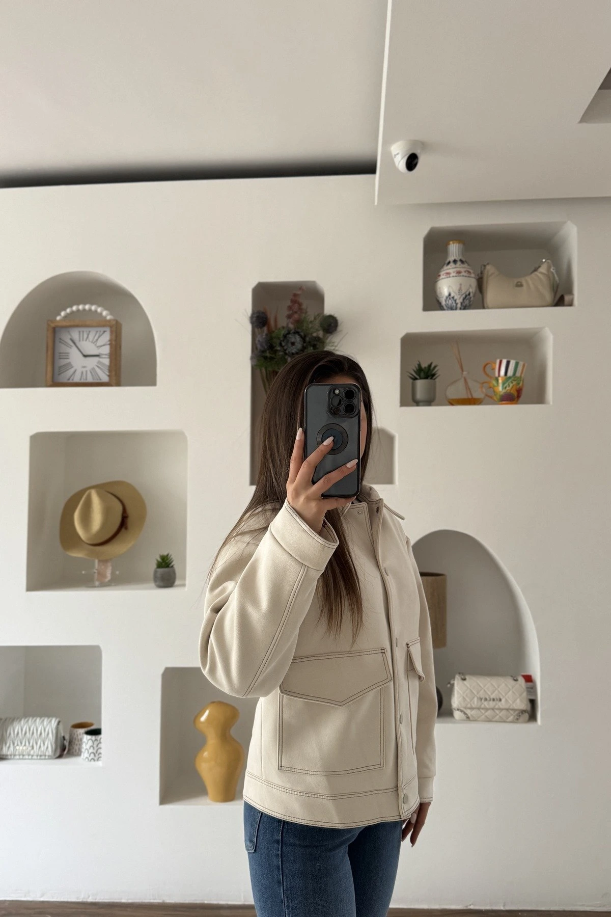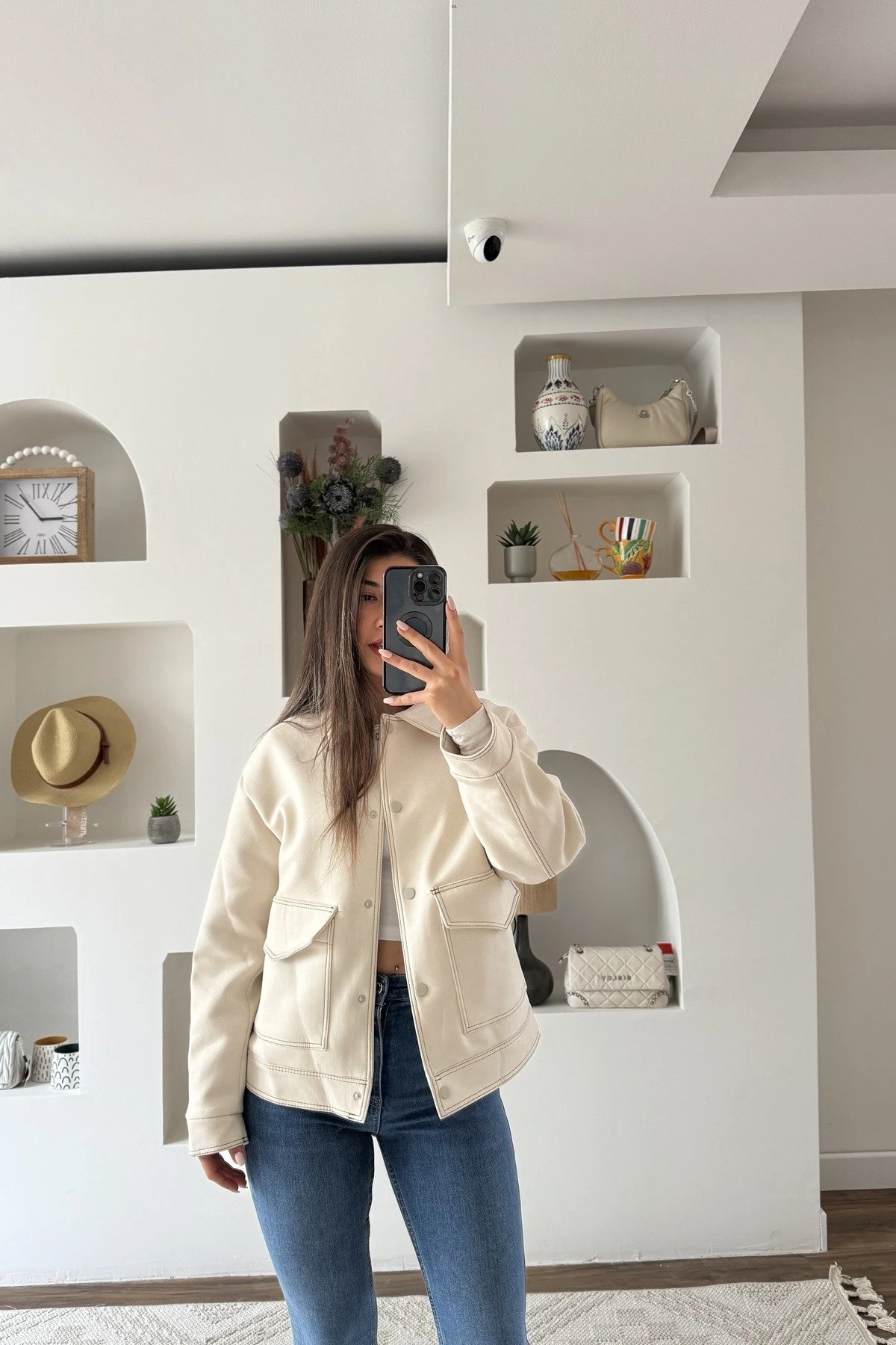 OVERSİZE ÇITÇITLI ÇİFT CEP SPOR DİKİŞ SÜET CEKET – TAŞ