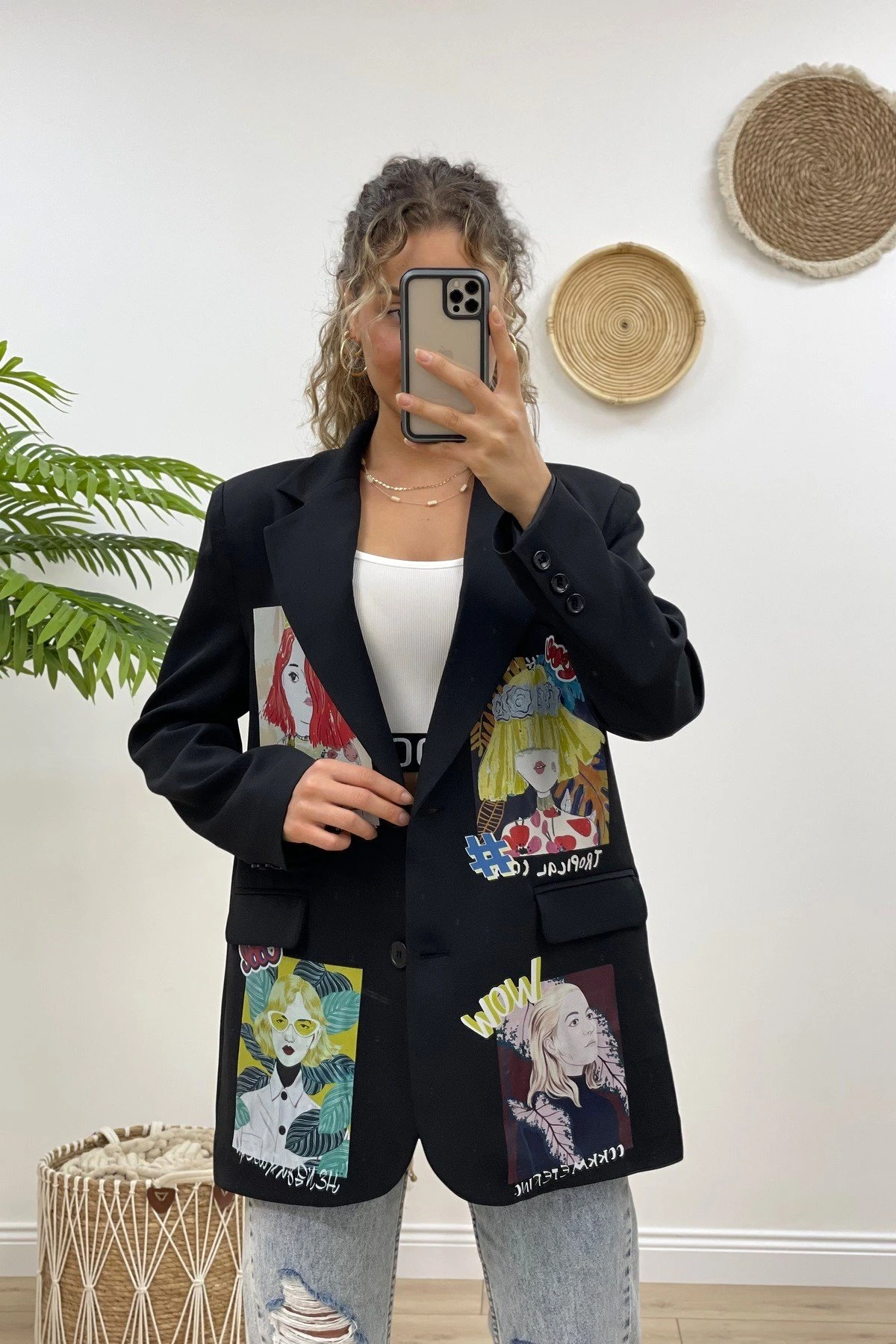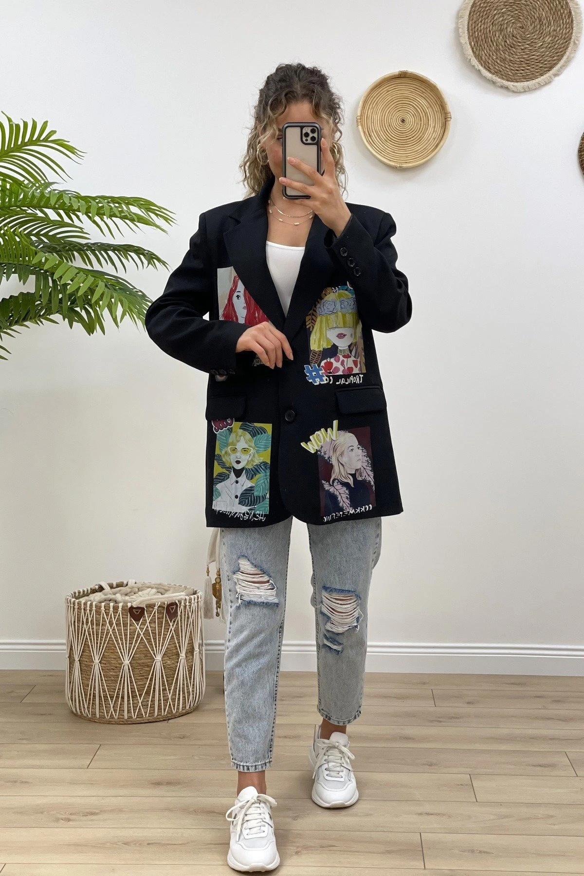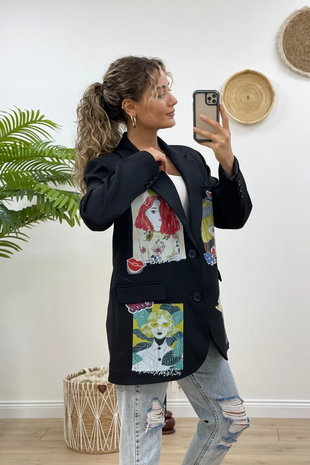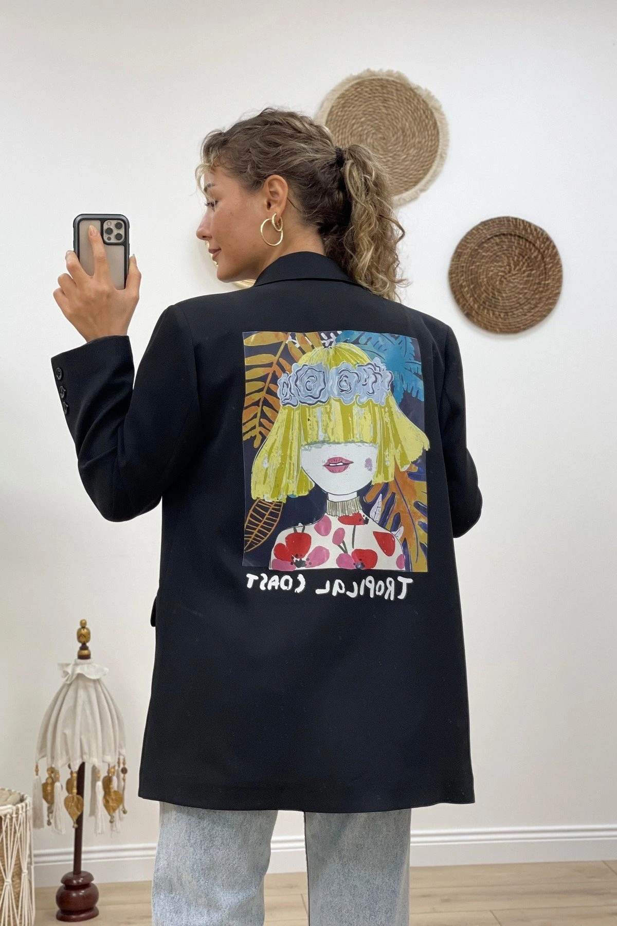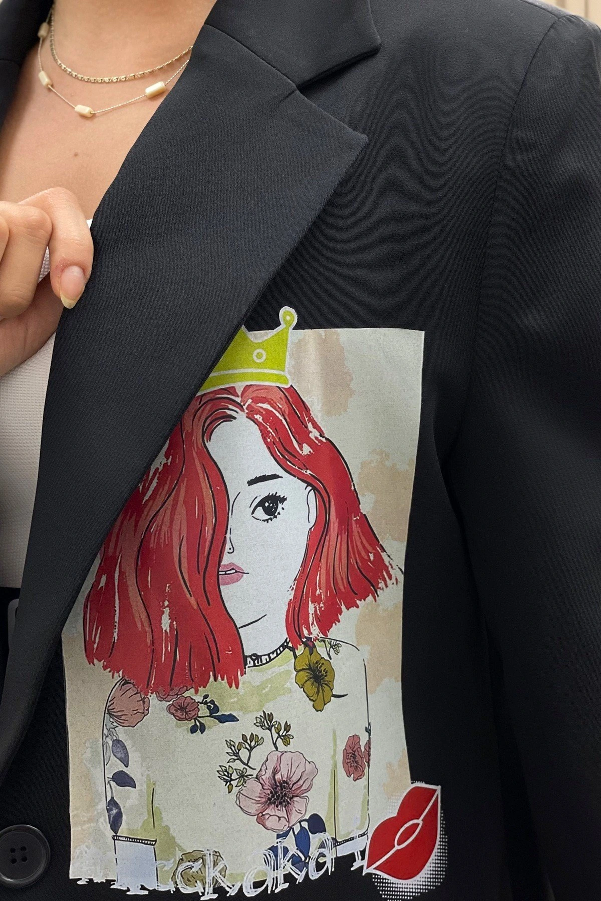 RENKLİ ARKA ÖN KIZ BASKI CEKET – SİYAH