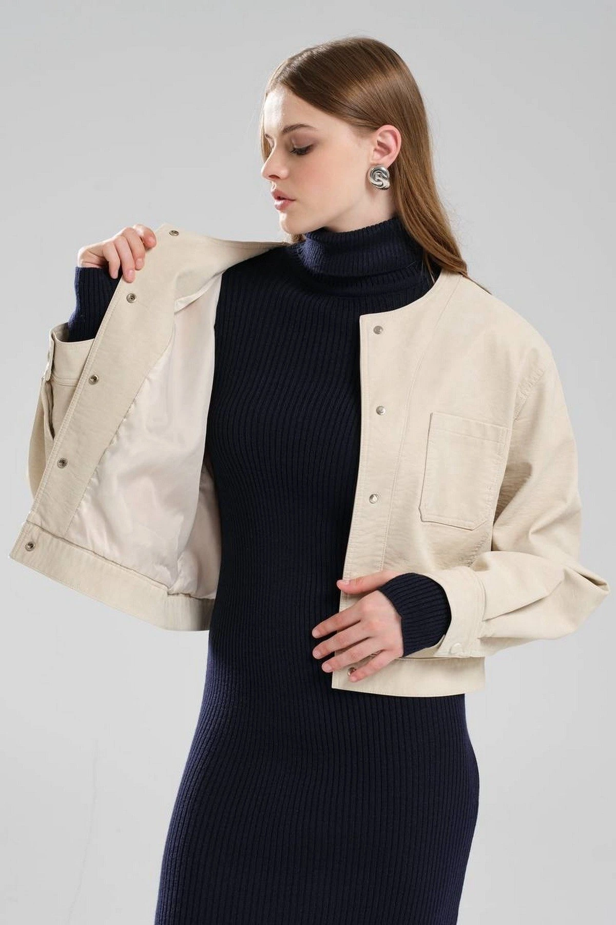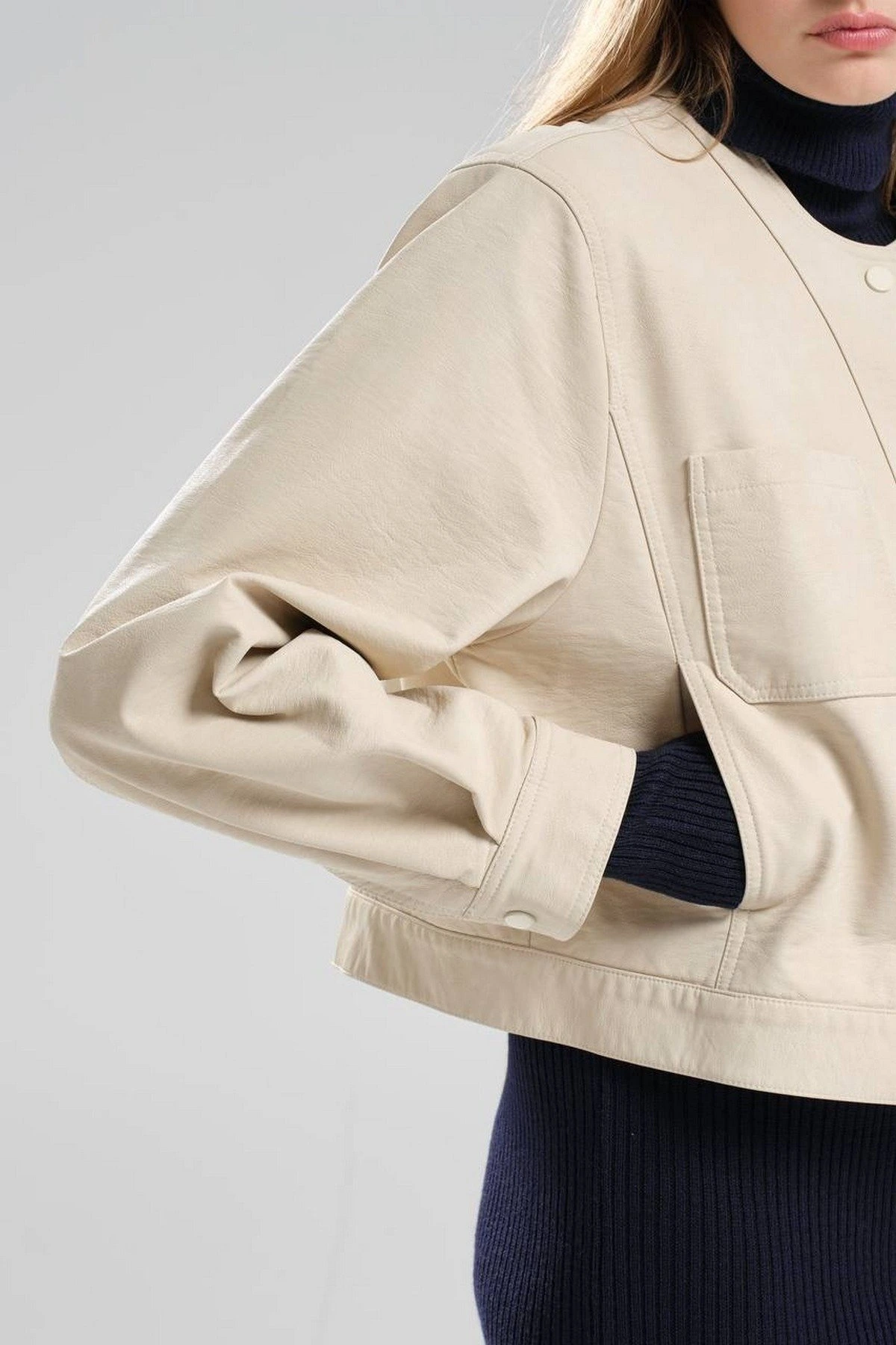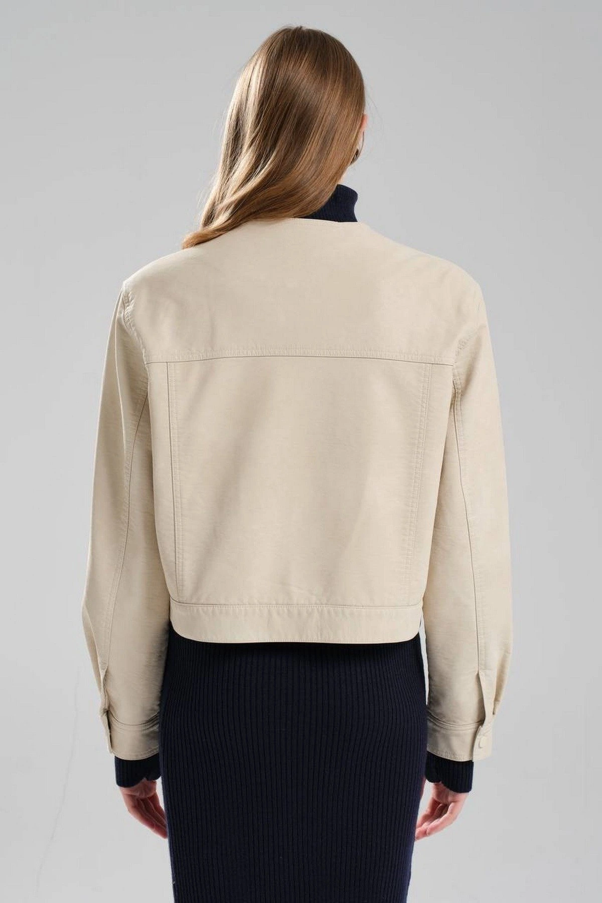 SIFIR YAKA DİKİŞ DETAY ASTARLI SUNİ DERİ CEKET – TAŞ