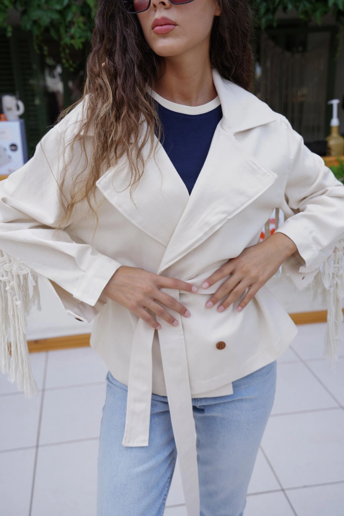 SIRT VE KOL SAÇAKLI KRUVAZE GABARDİN CEKET – KREM