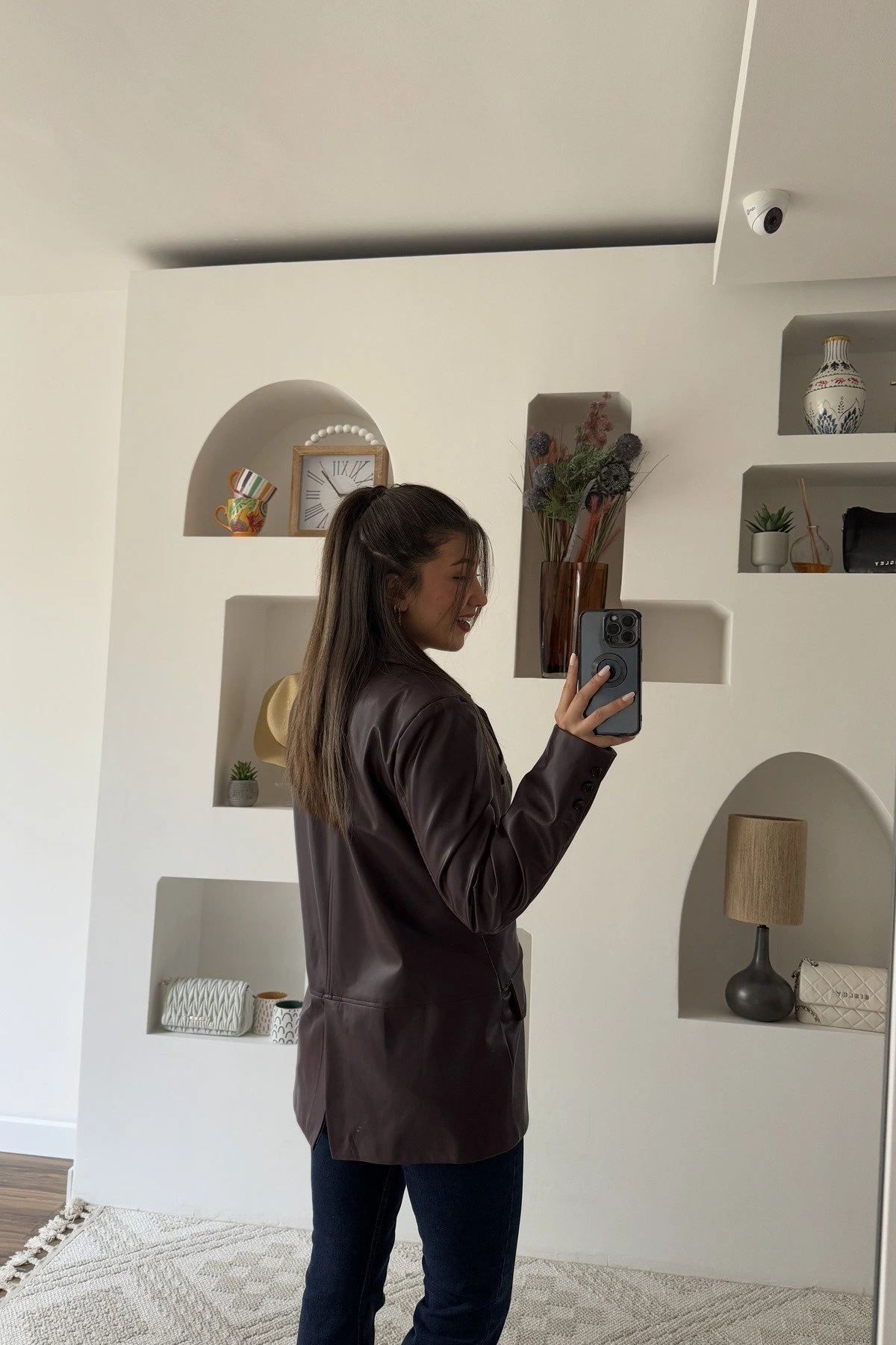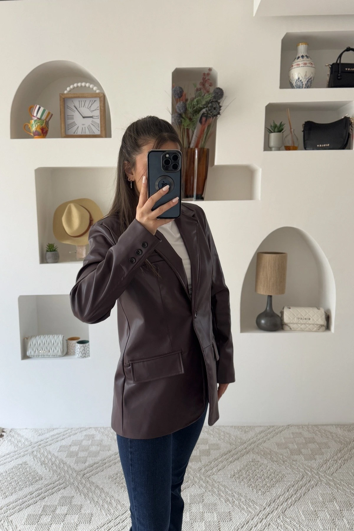 TEK DÜĞME ARKA MİNİ YIRTMAÇ SUNİ DERİ CEKET – BORDO