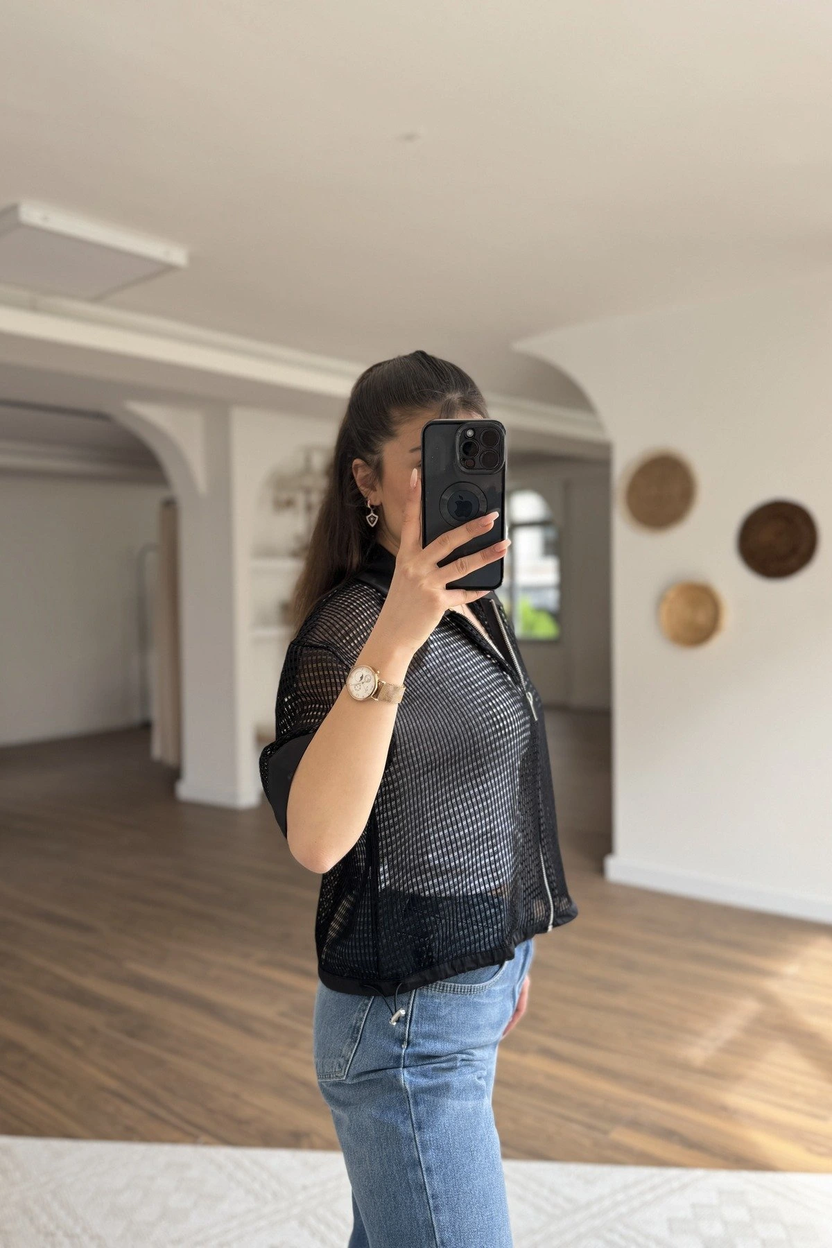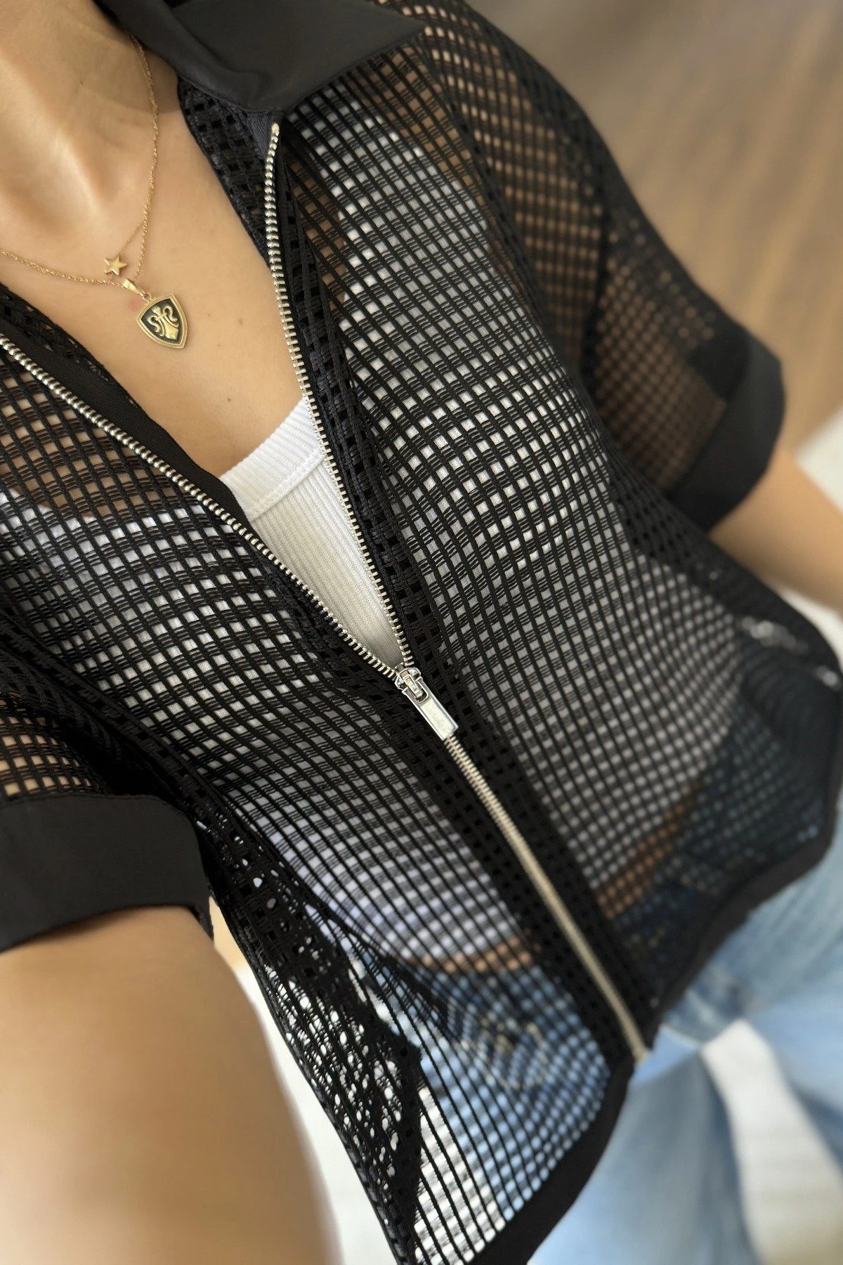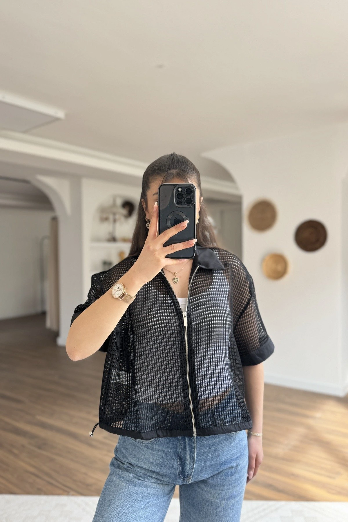 YAKA KOL PARLAK KUMAŞ FERMUARLI FİLE CEKET – SİYAH
