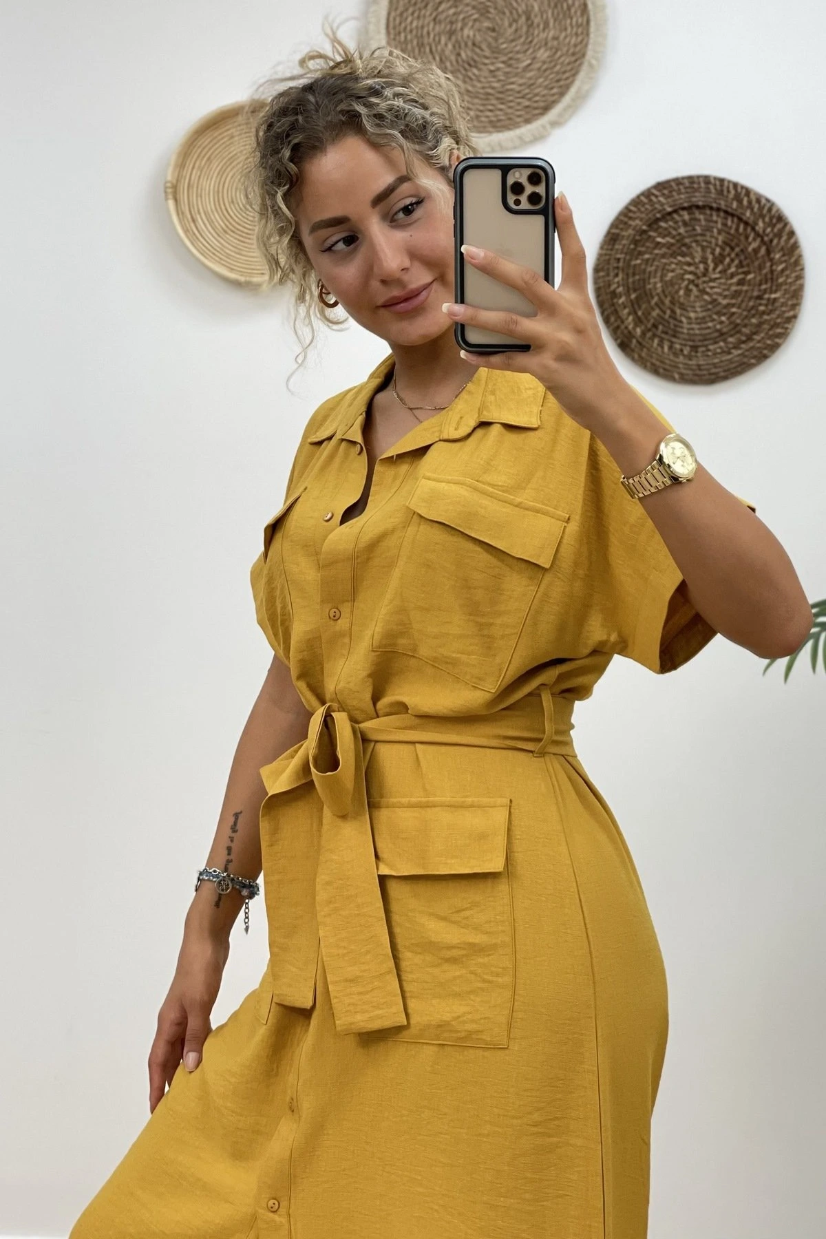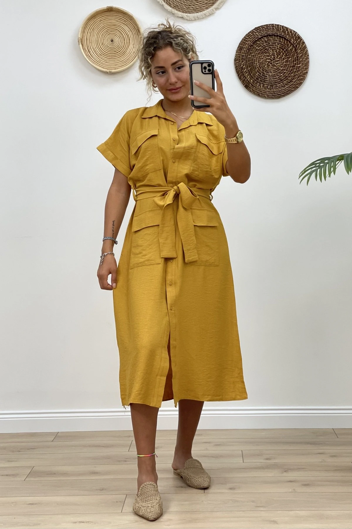 4 CEP BEL KUŞAKLI KATLI KOL VİSKON GÖMLEK ELBİSE – HARDAL