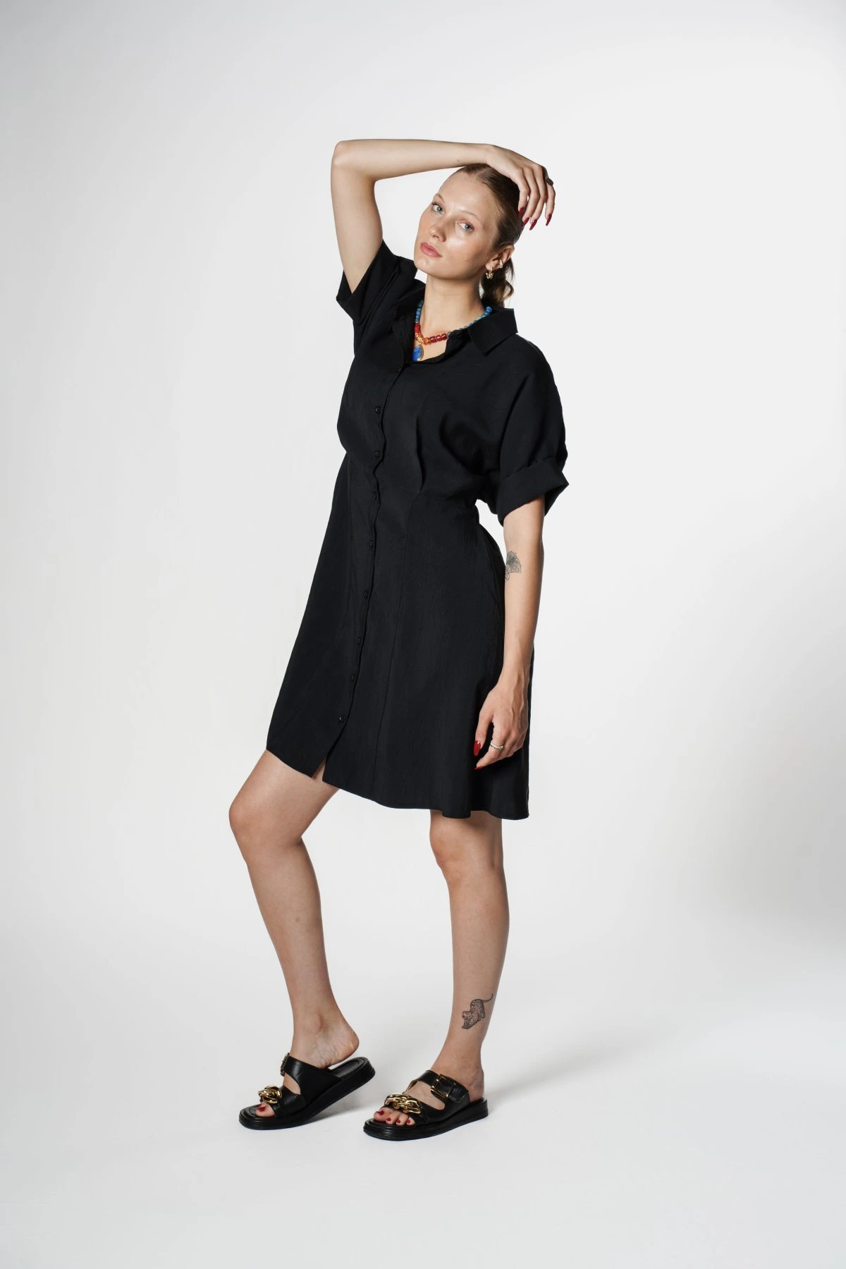 ARKA BEL LASTİK GÖMLEK YAKA MODAL ELBİSE – SİYAH
