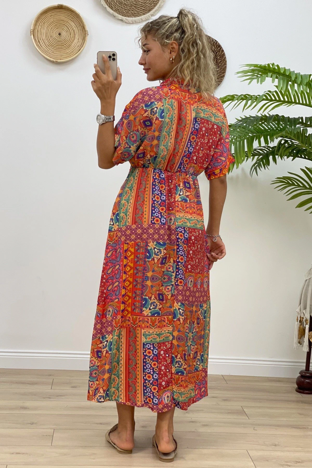 ARKA BEL LASTİK ÖN PİLİ KISA KOL ELBİSE – ORANGE