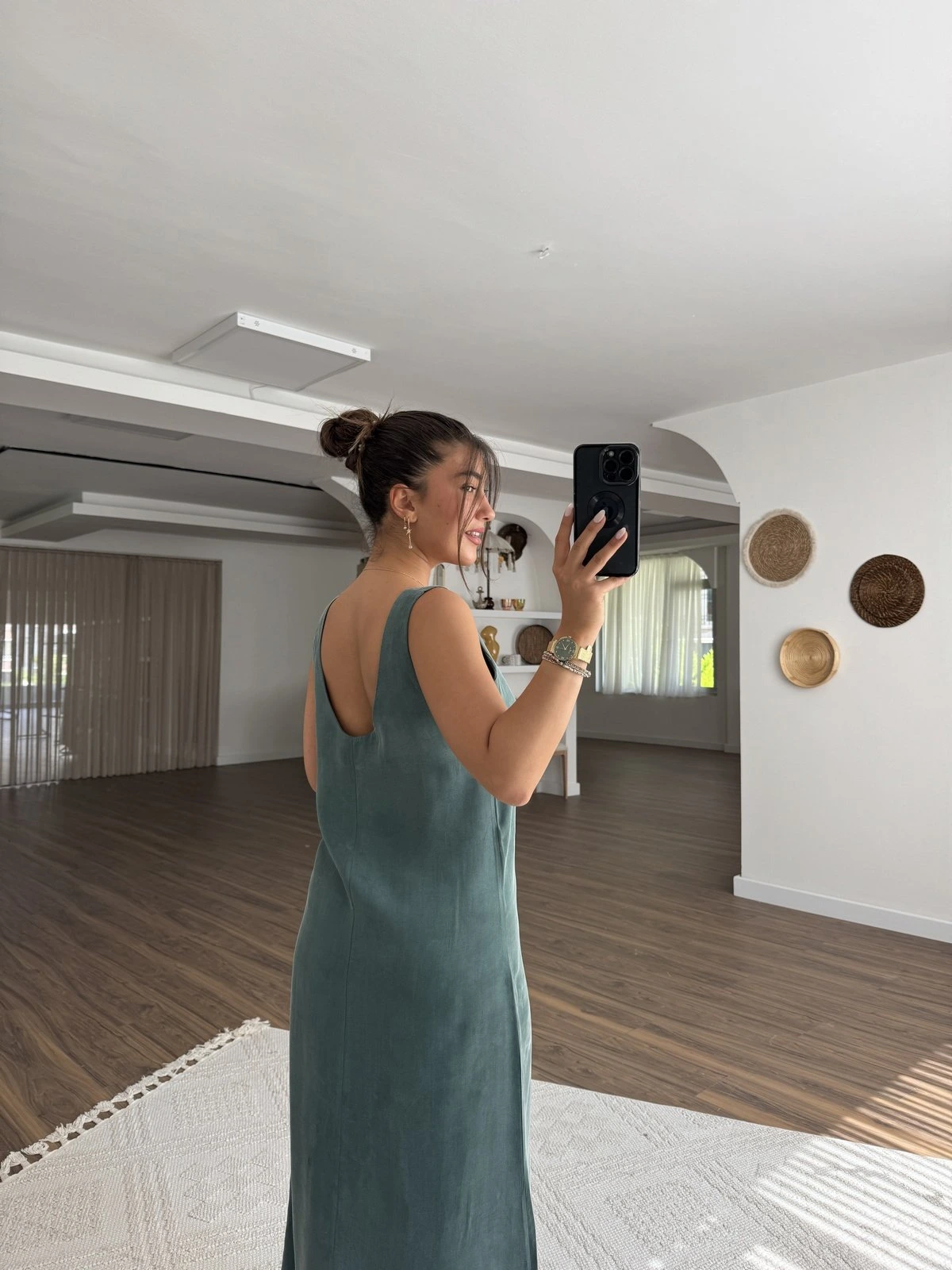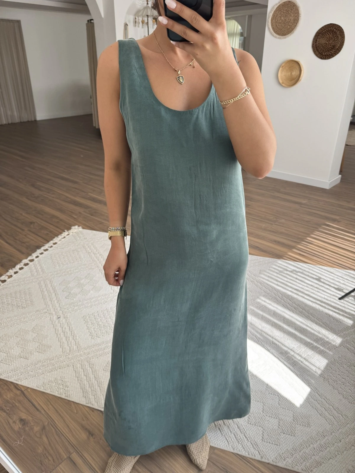 ARKA ÖN U YAKA VİSKON KARIŞIM UZUN KOLSUZ ELBİSE – ZÜMRÜT YEŞİL