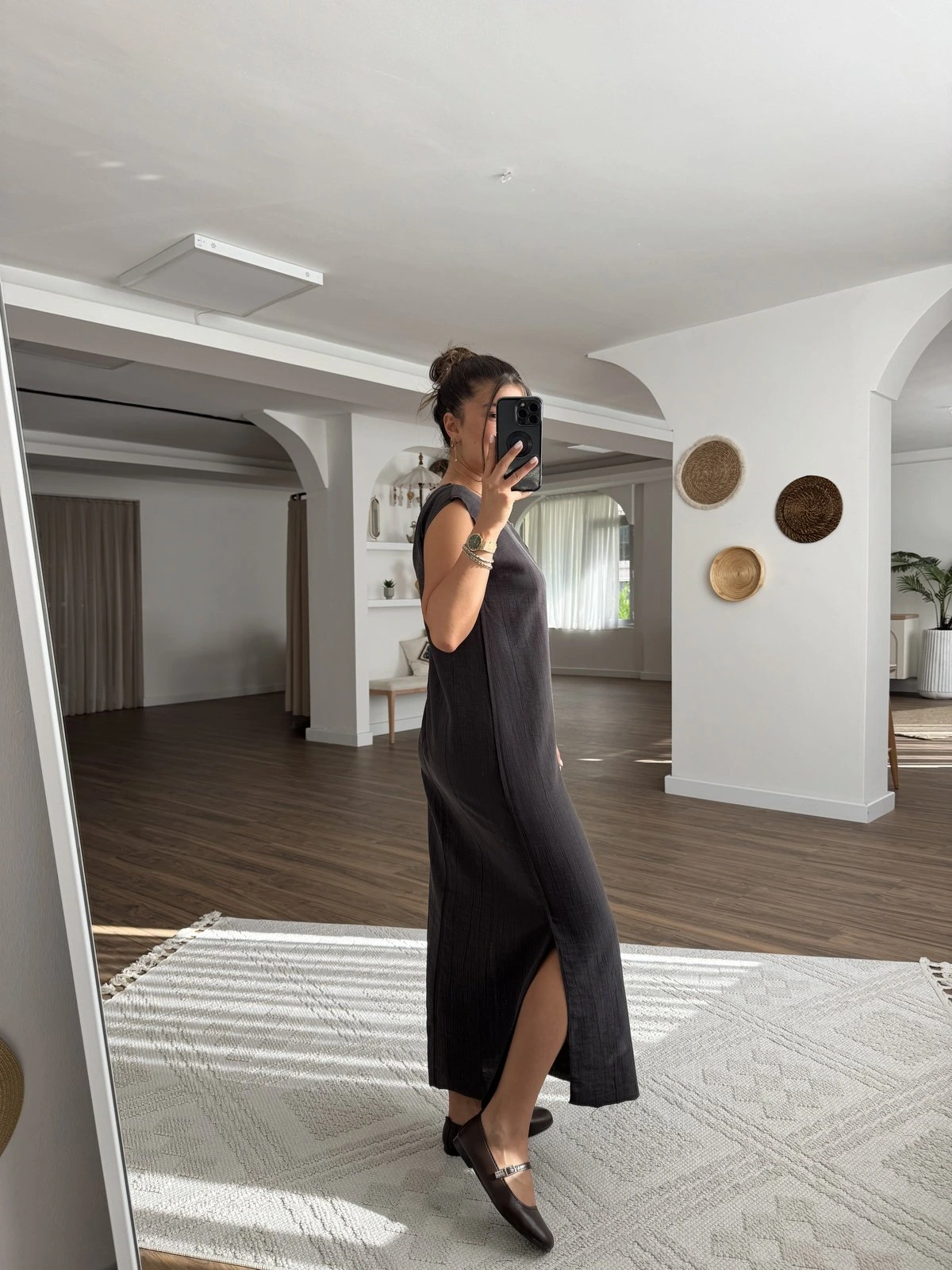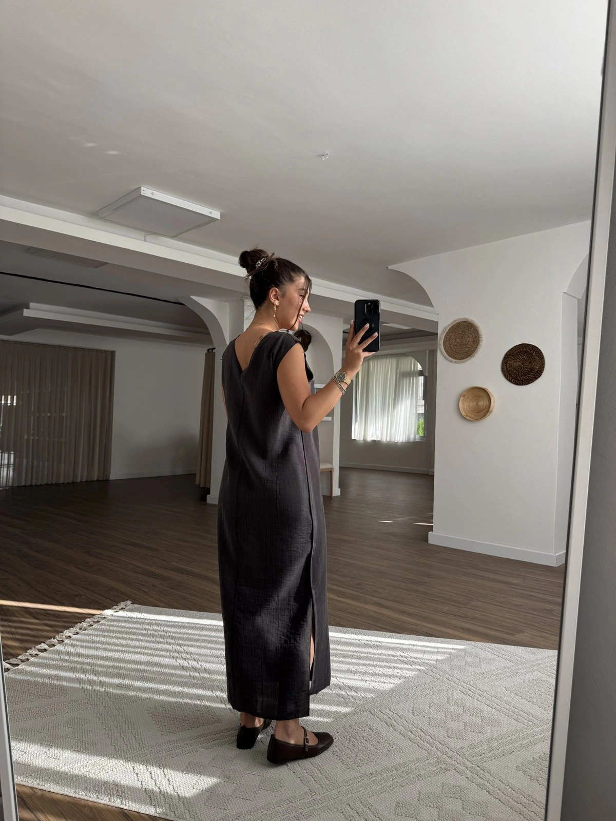 ARKA ÖN V TENCEL YAN YIRTMAÇLI ELBİSE - ANTRASİT