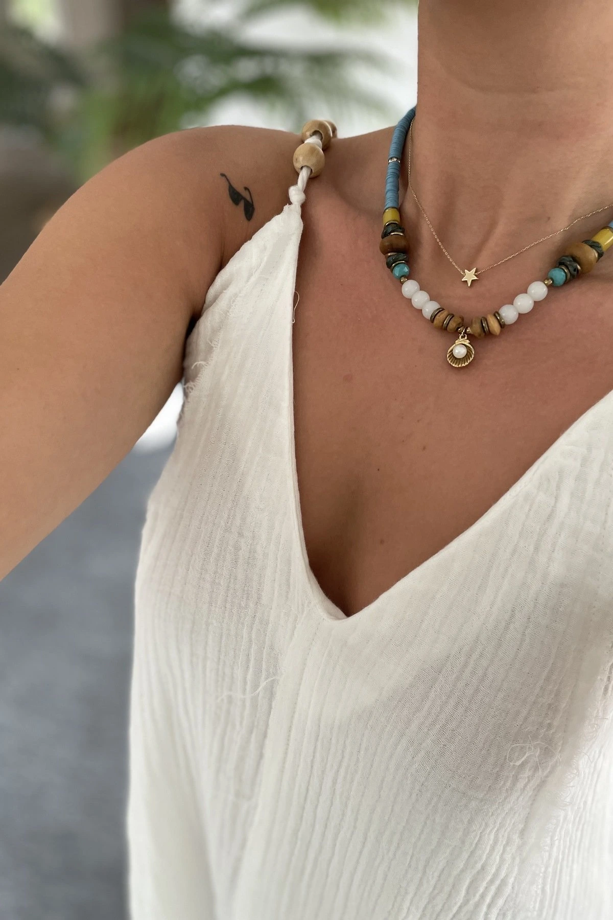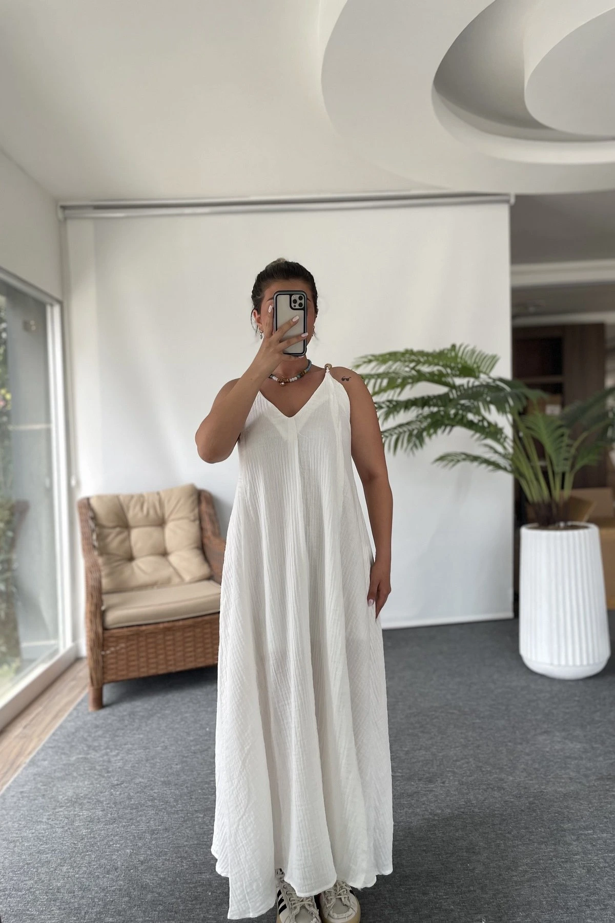 ASKI AHŞAP BONCUK ASTARLI PAMUK KETEN ELBİSE – BEYAZ