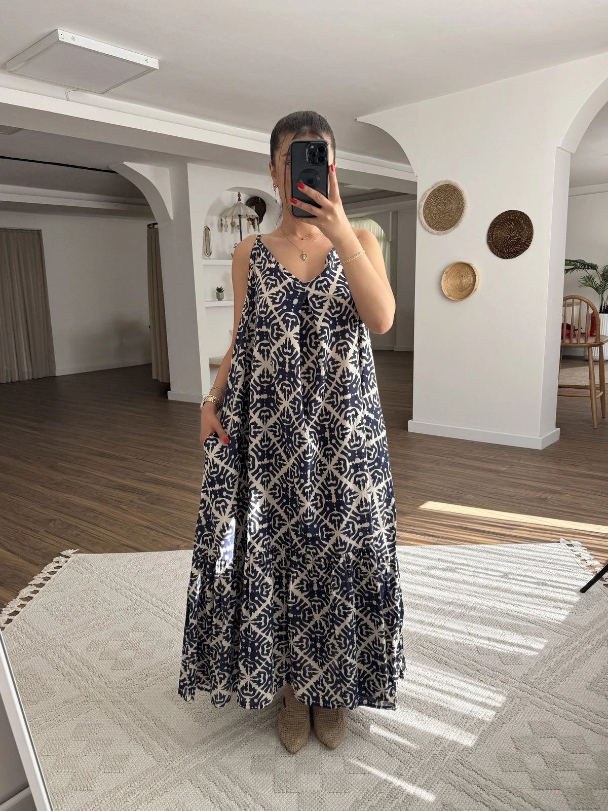 ASKI AYARLAMALI ARKA LASTİK CEPLİ SALAŞ PAMUK ELBİSE – LACİVERT