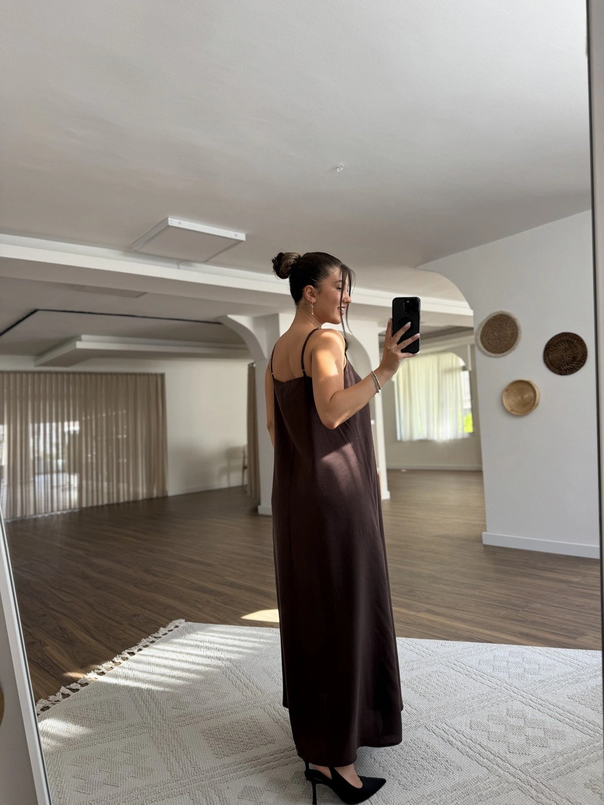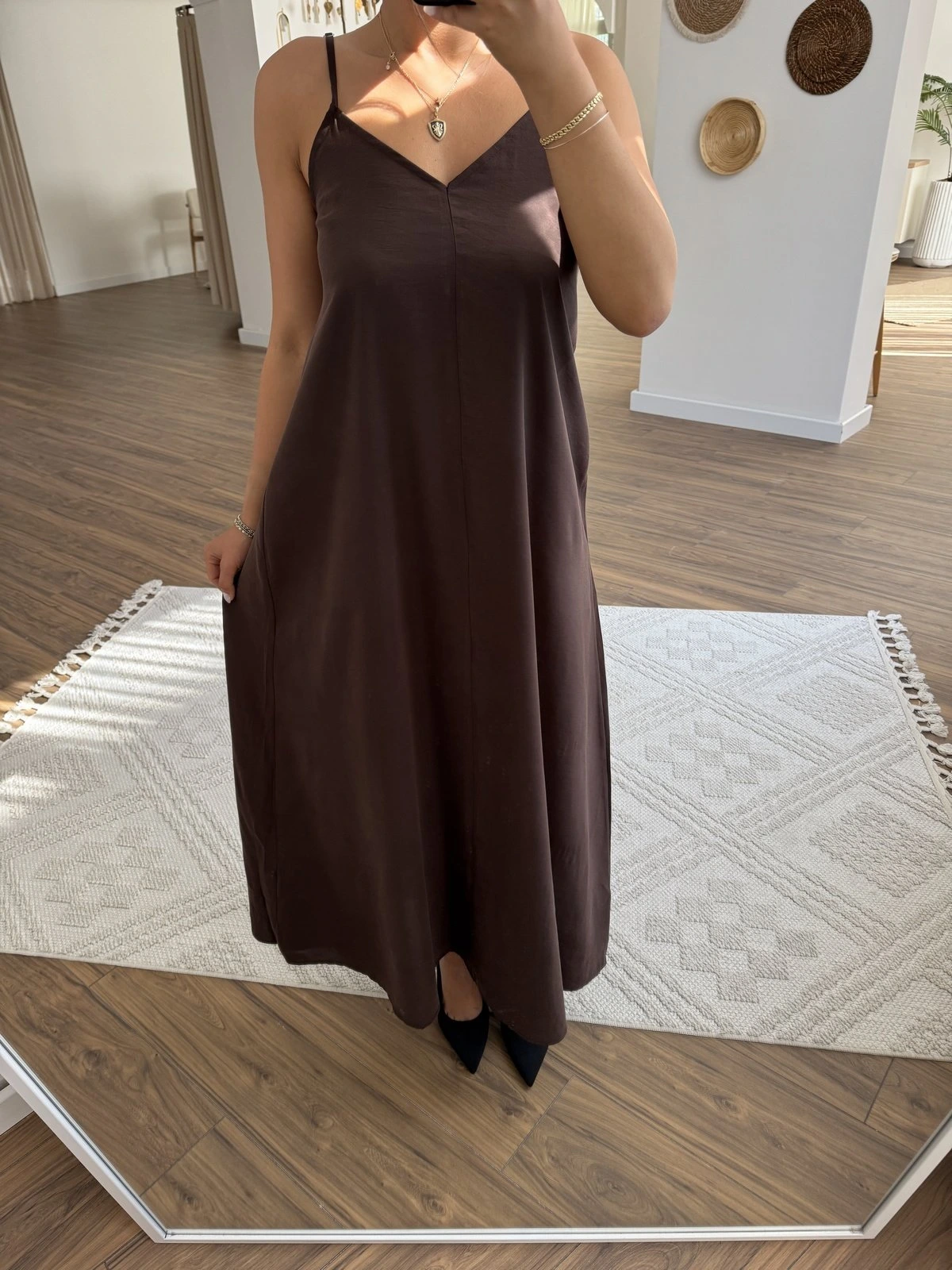 ASKI AYARLAMALI ETEĞİ VOLANLI TİRİL ELBİSE – KAHVE