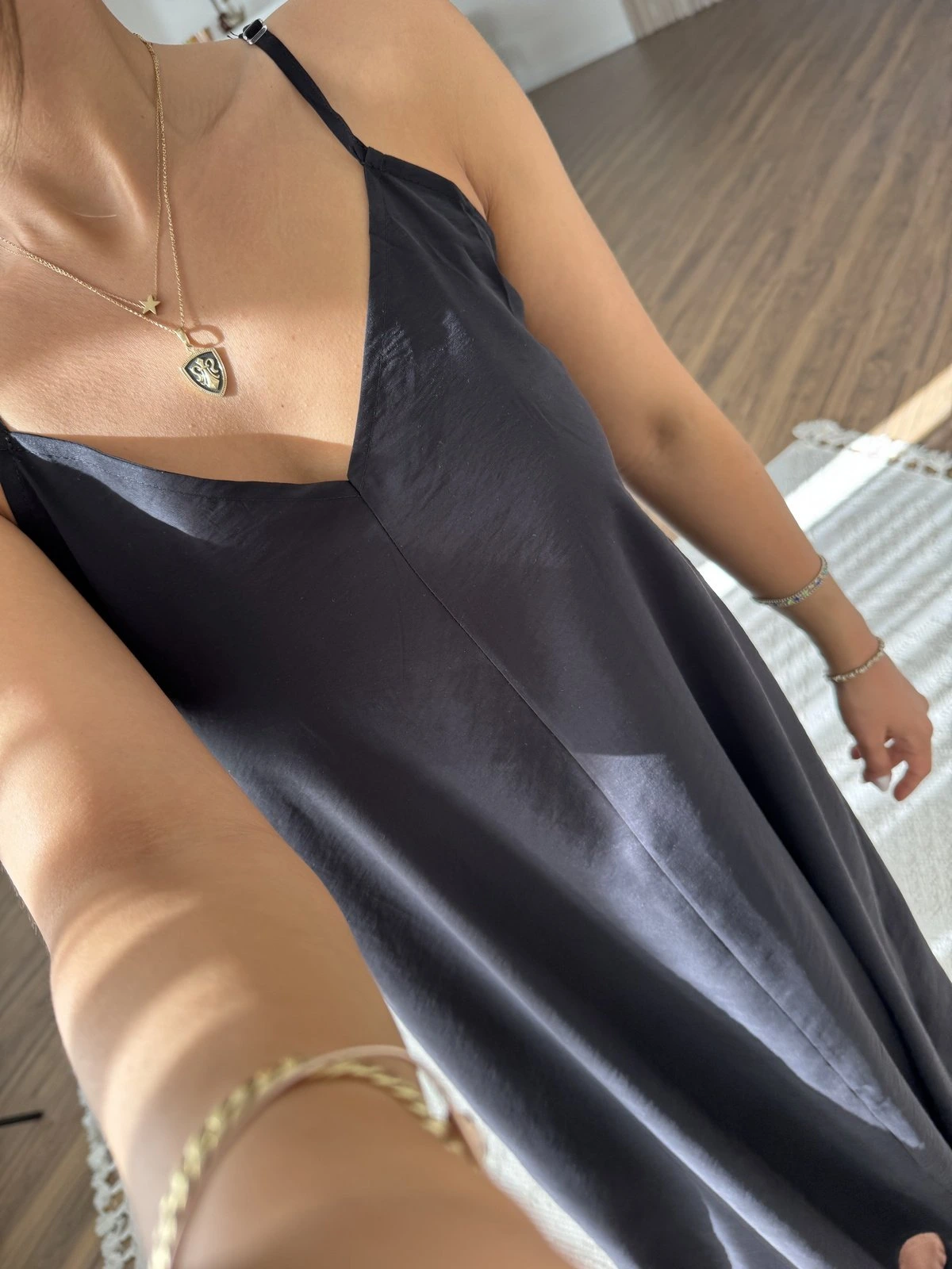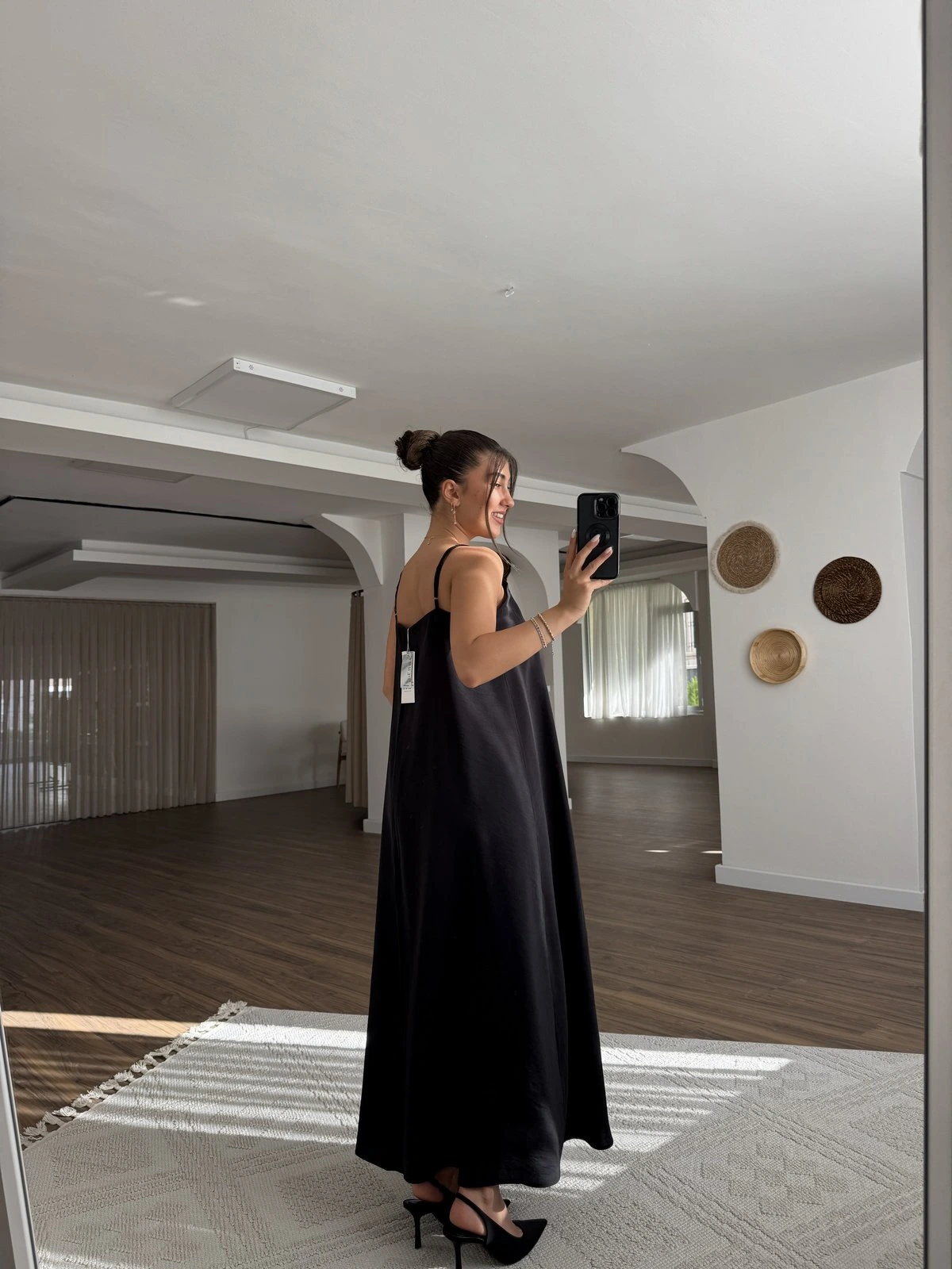 ASKI AYARLAMALI ETEĞİ VOLANLI TİRİL ELBİSE – SİYAH