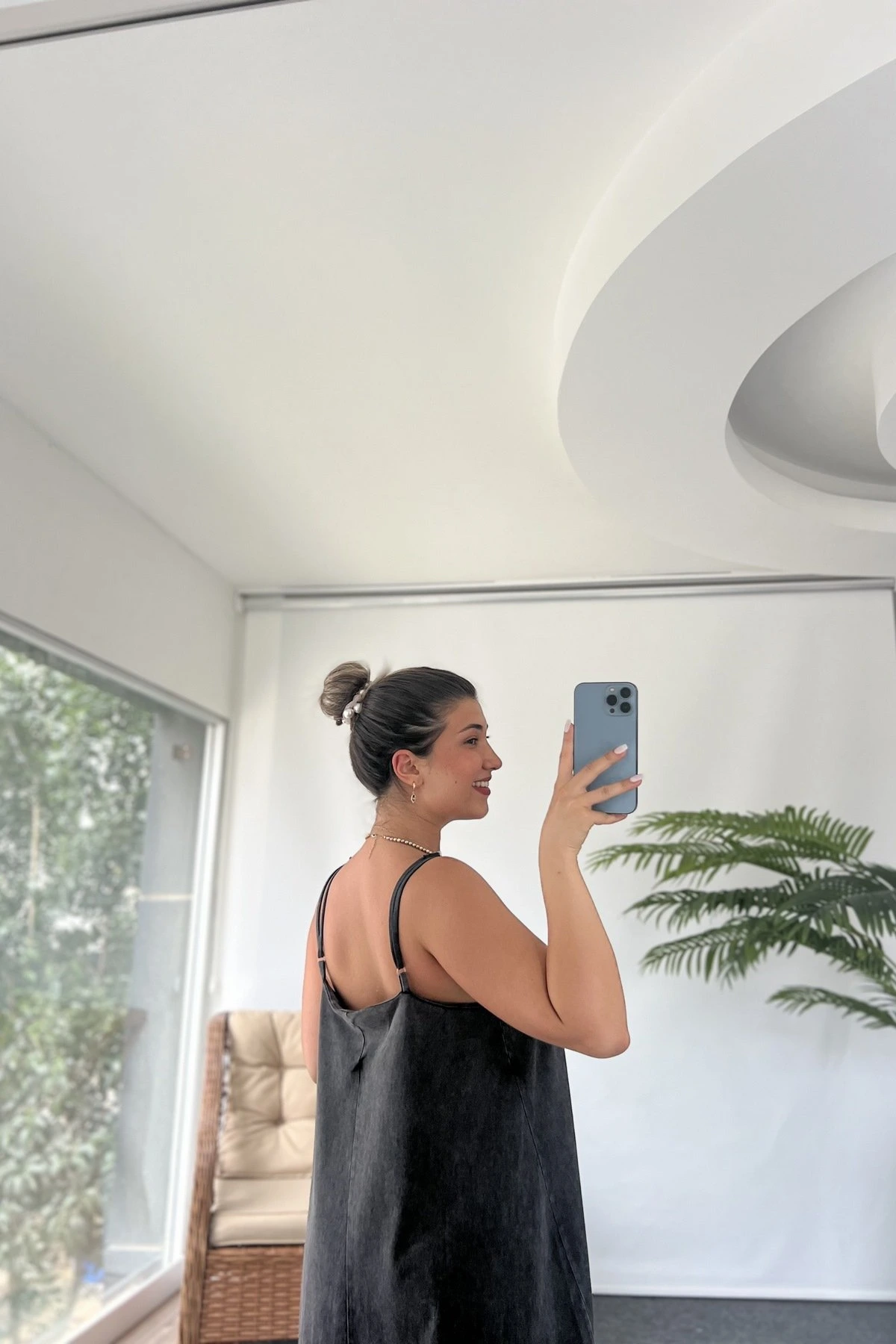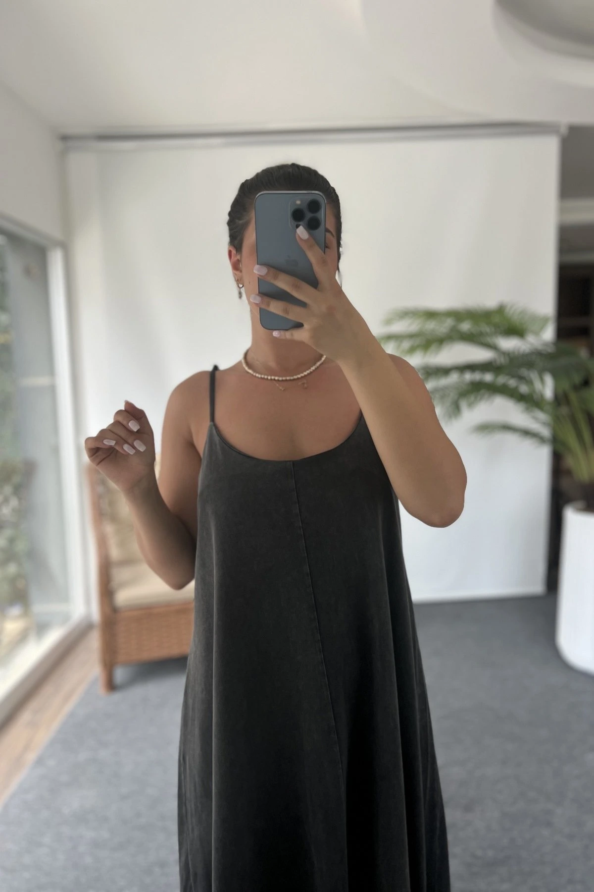 ASKI AYARLAMALI PAMUK LİKRA YIKAMALI SALAŞ ELBİSE – ANTRASİT