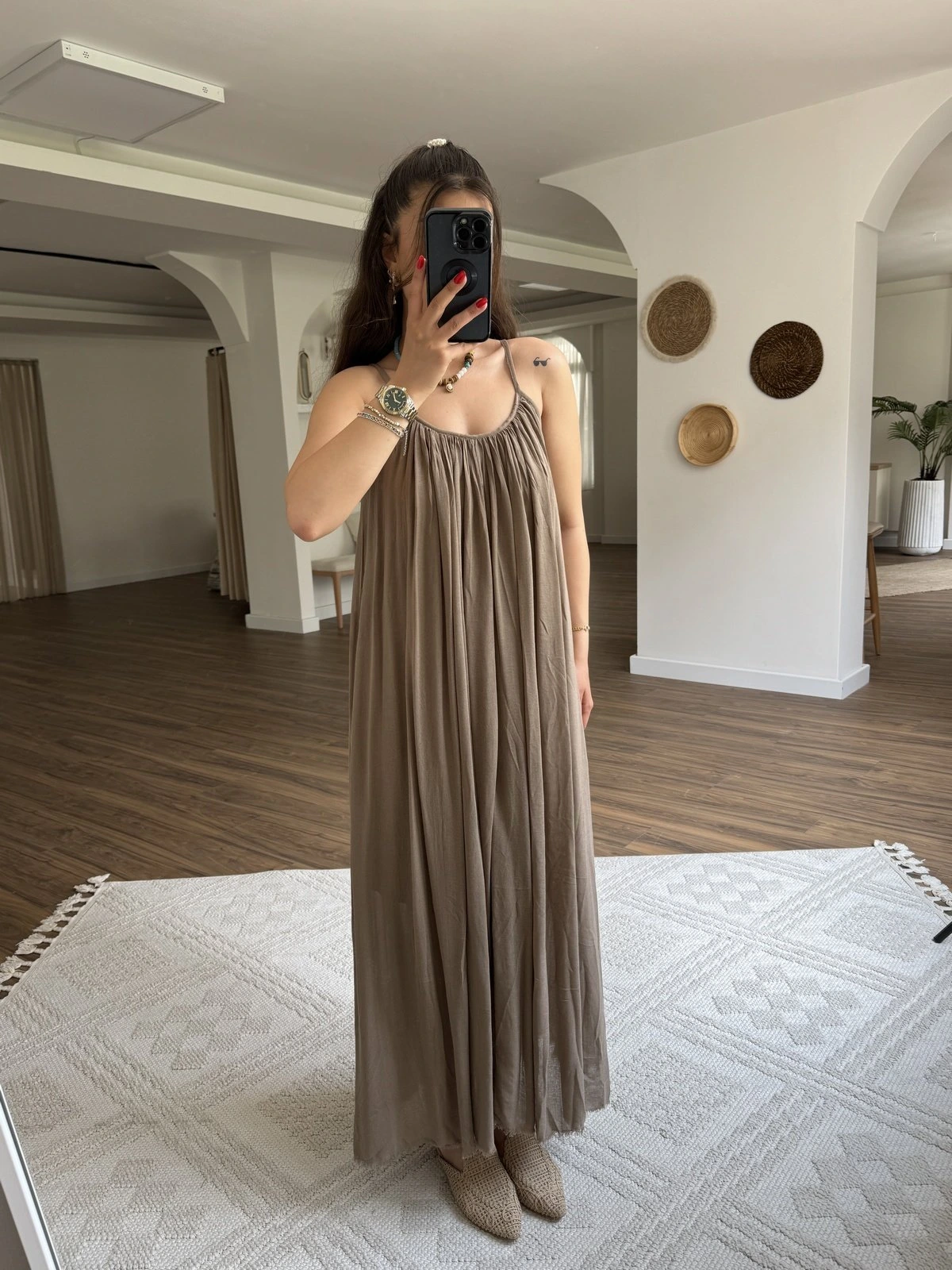 ASKI AYARLI PİLİLİ PÜSKÜL ETEK ASTARLI VİSKON ELBİSE – VİZON