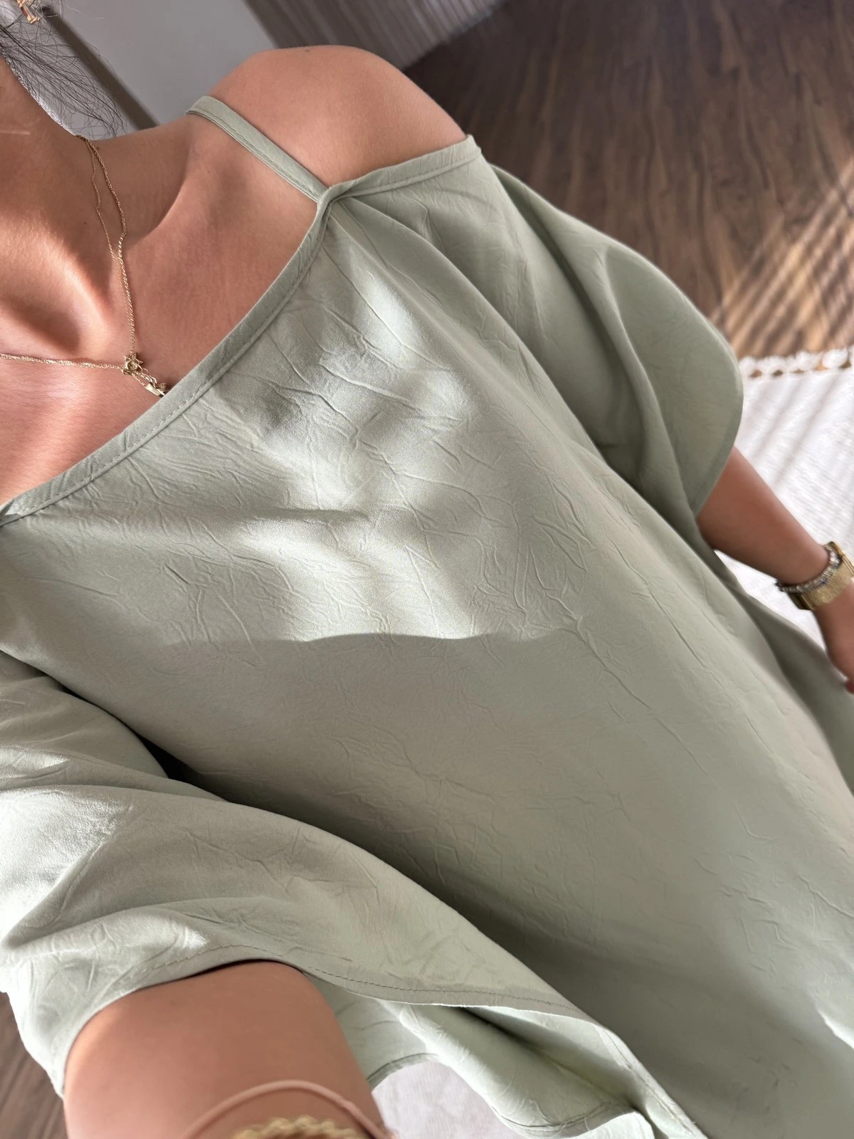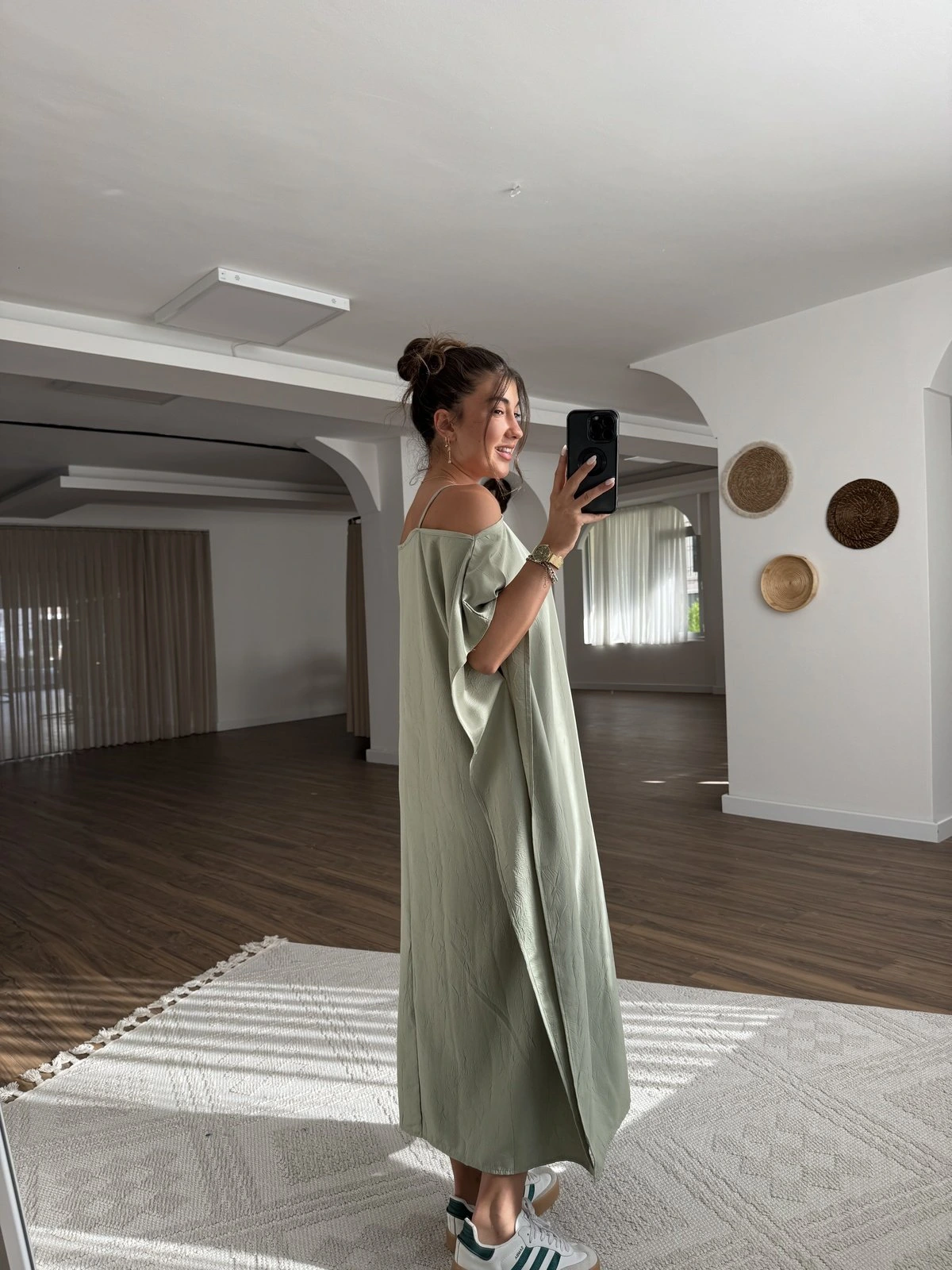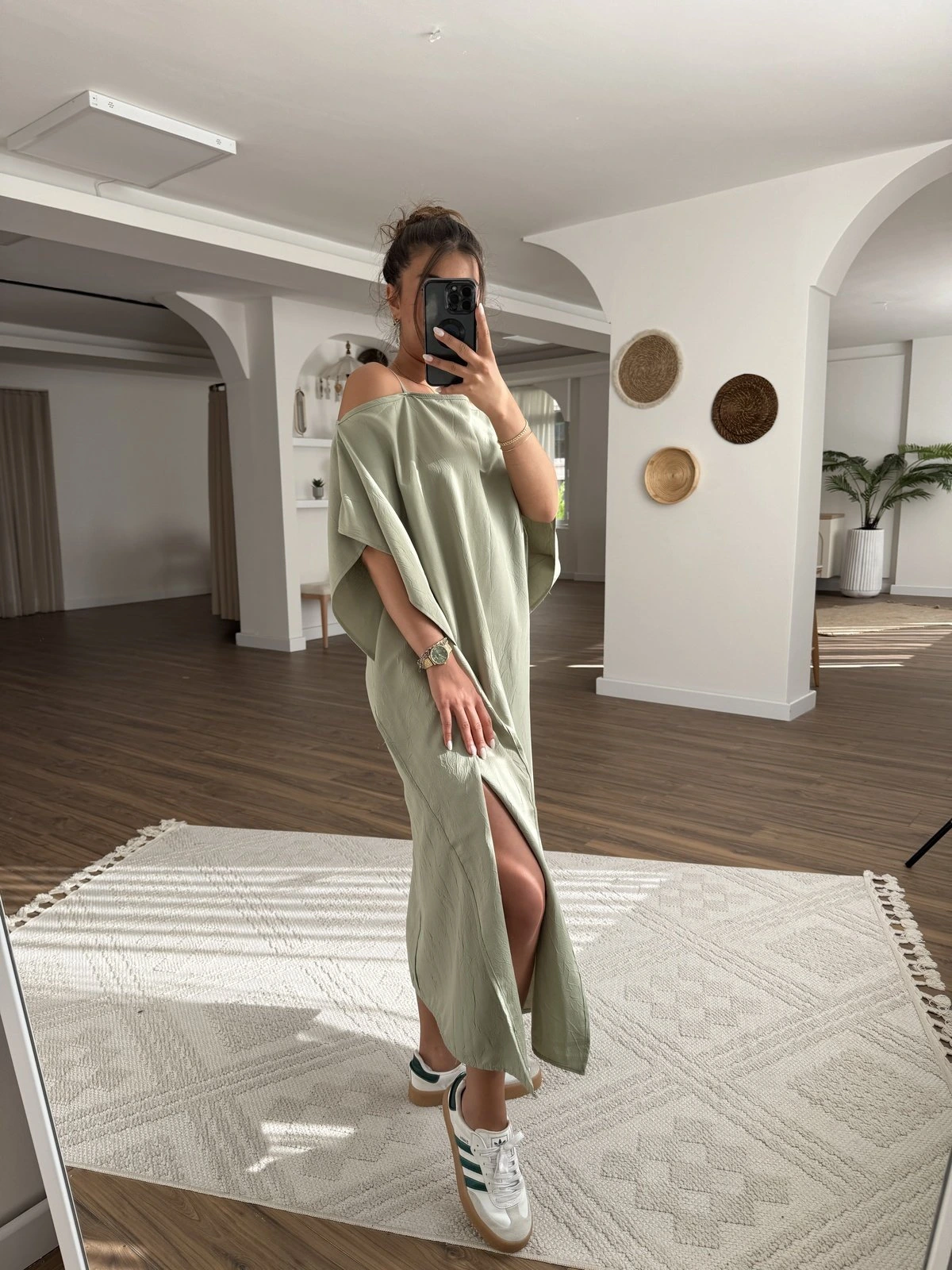 ASKILI OMUZ DEKOLTE YAN DİKİŞLİ YIRTMAÇLI ELBİSE – HAKİ