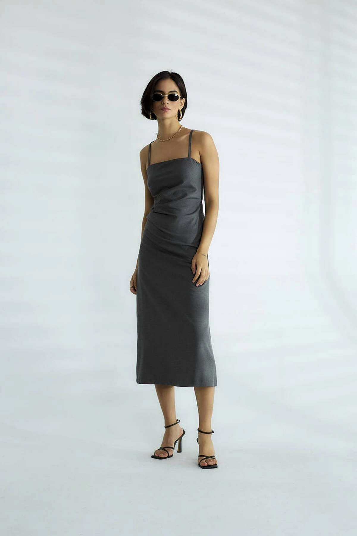 ASKILI YAN DRAPE MİDİ BOY VİSKON ELBİSE – ANTRASİT