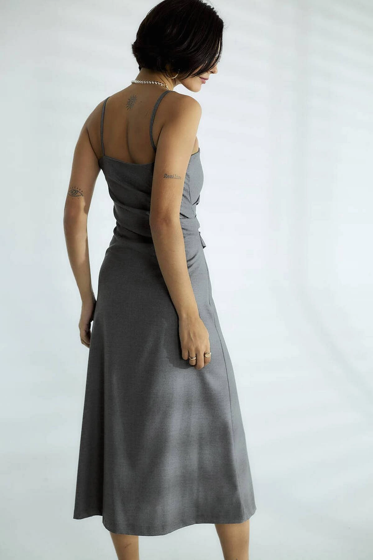 ASKILI YAN DRAPE MİDİ BOY VİSKON ELBİSE – GRİ