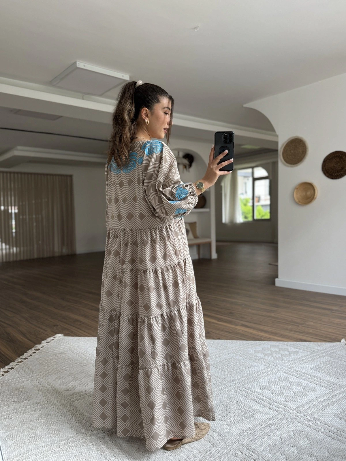 BALON KOL NAKIŞ DETAY UZUN PAMUK ELBİSE – BEJ