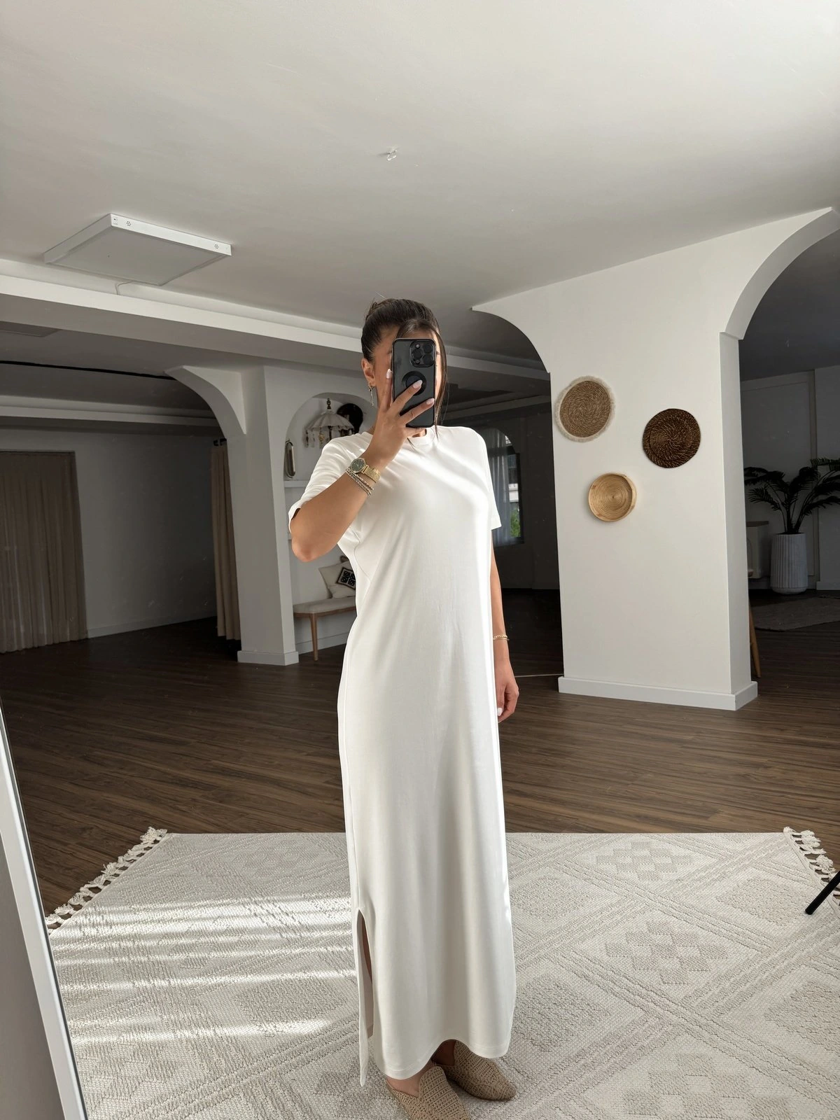 BİSİKLET YAKA KISA KOL MODAL UZUN ELBİSE – BEYAZ