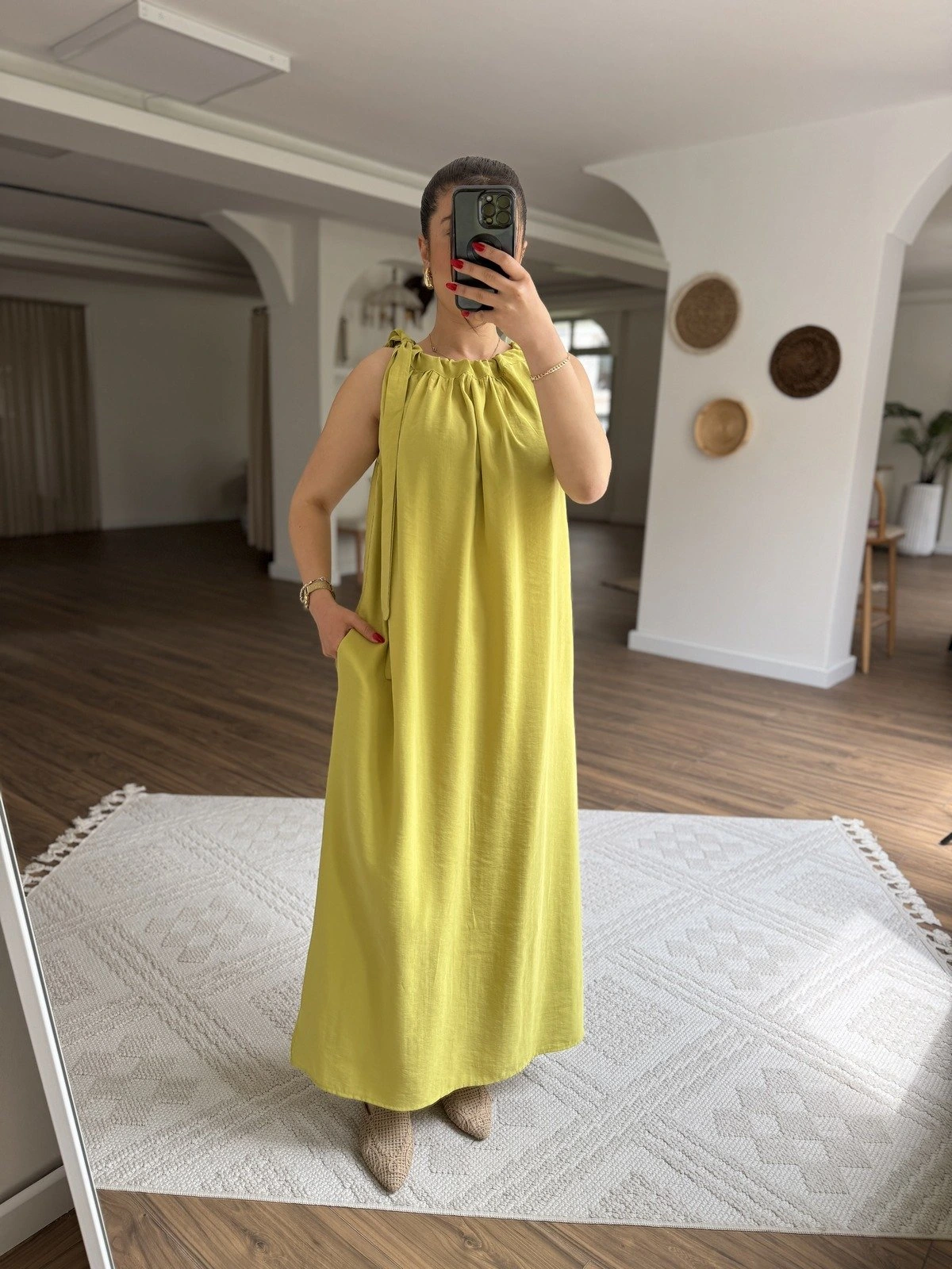 BOYUN BAĞ BÜZGÜ CEPLİ MODAL UZUN ELBİSE – FISTIK YEŞİLİ