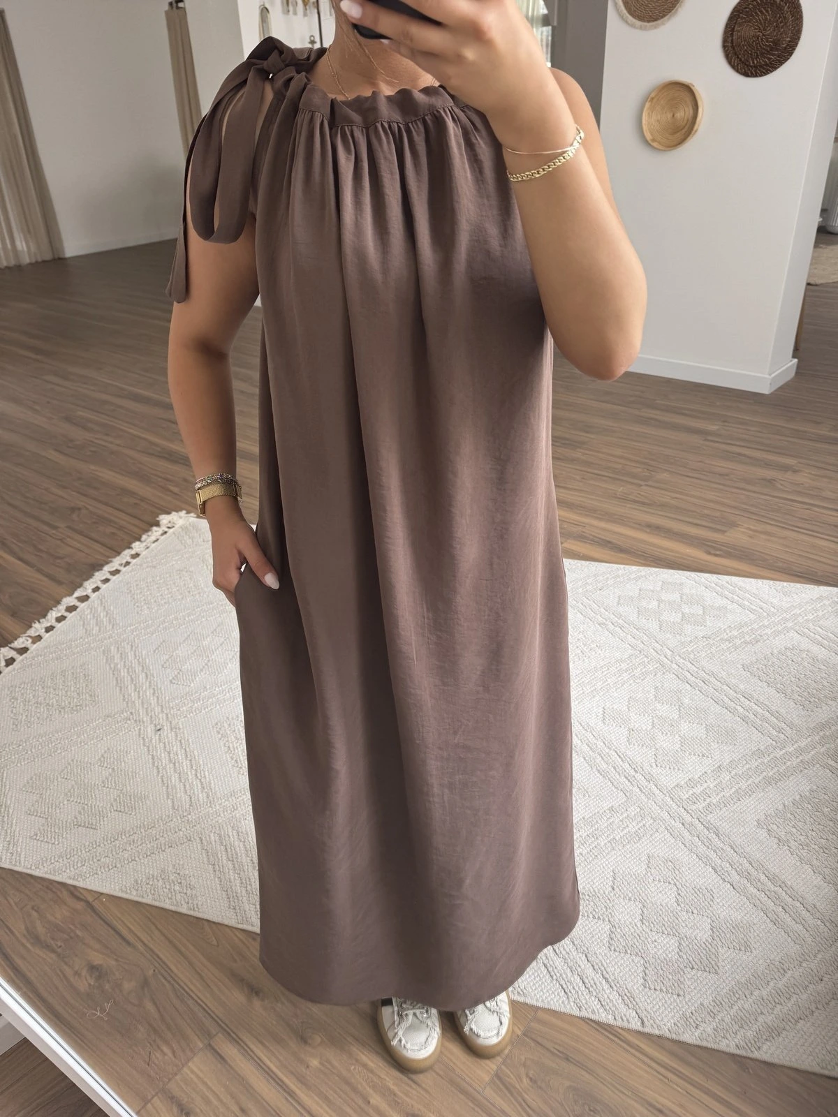 BOYUN BAĞ BÜZGÜ CEPLİ MODAL UZUN ELBİSE – KAHVE