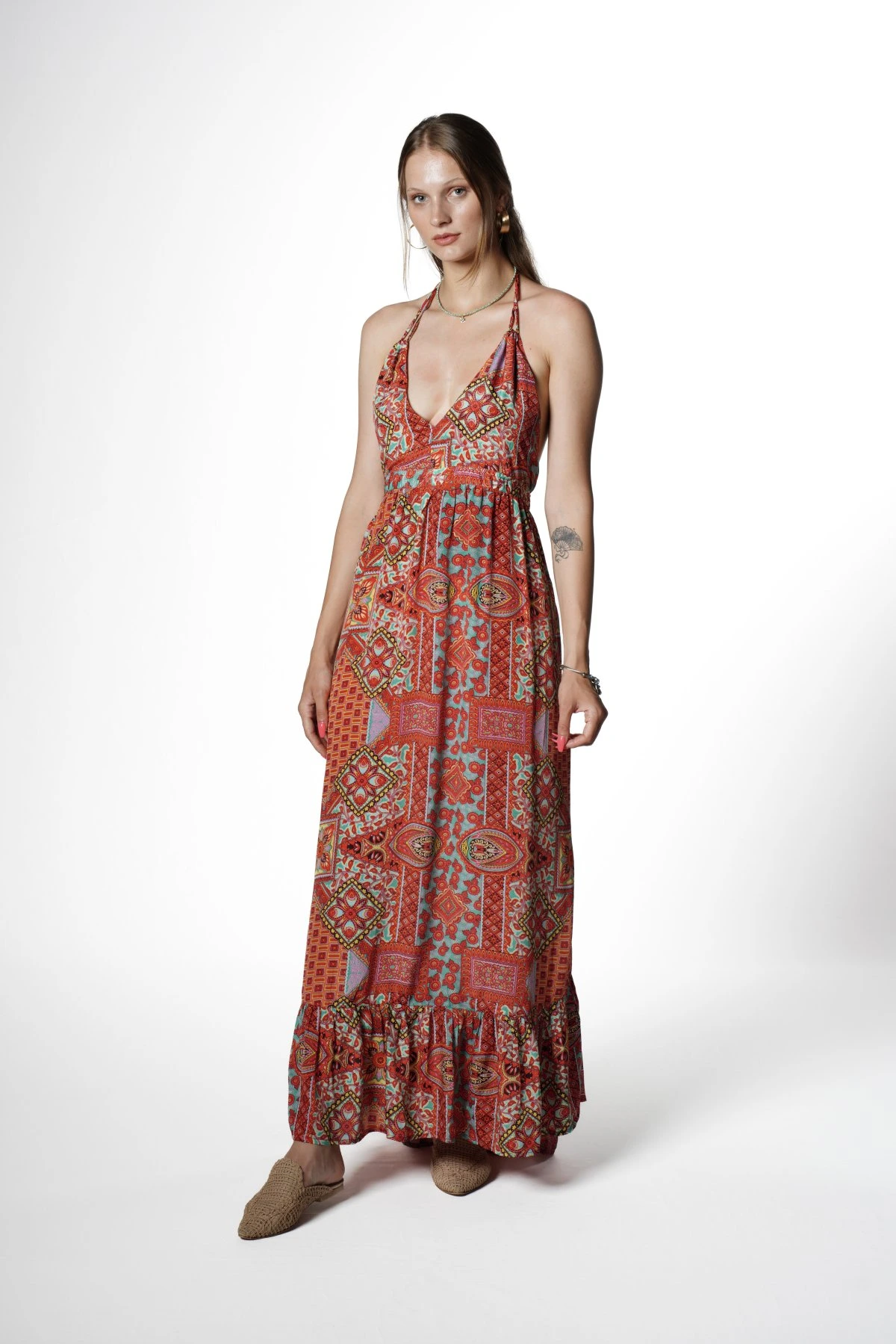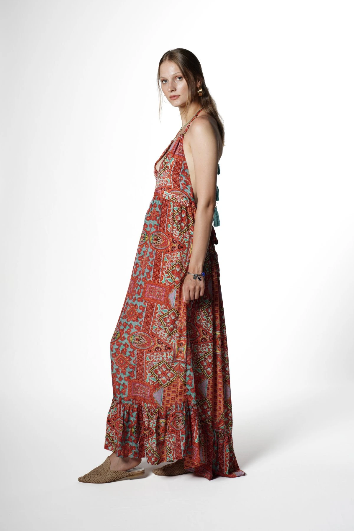 BOYUN VE SIRT BAĞLAMALI ETEĞİ FIRFIR RENKLİ ELBİSE – MERCAN