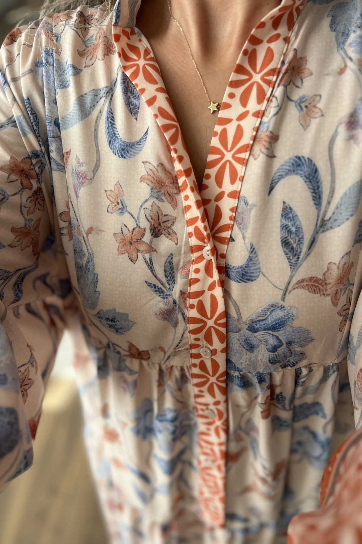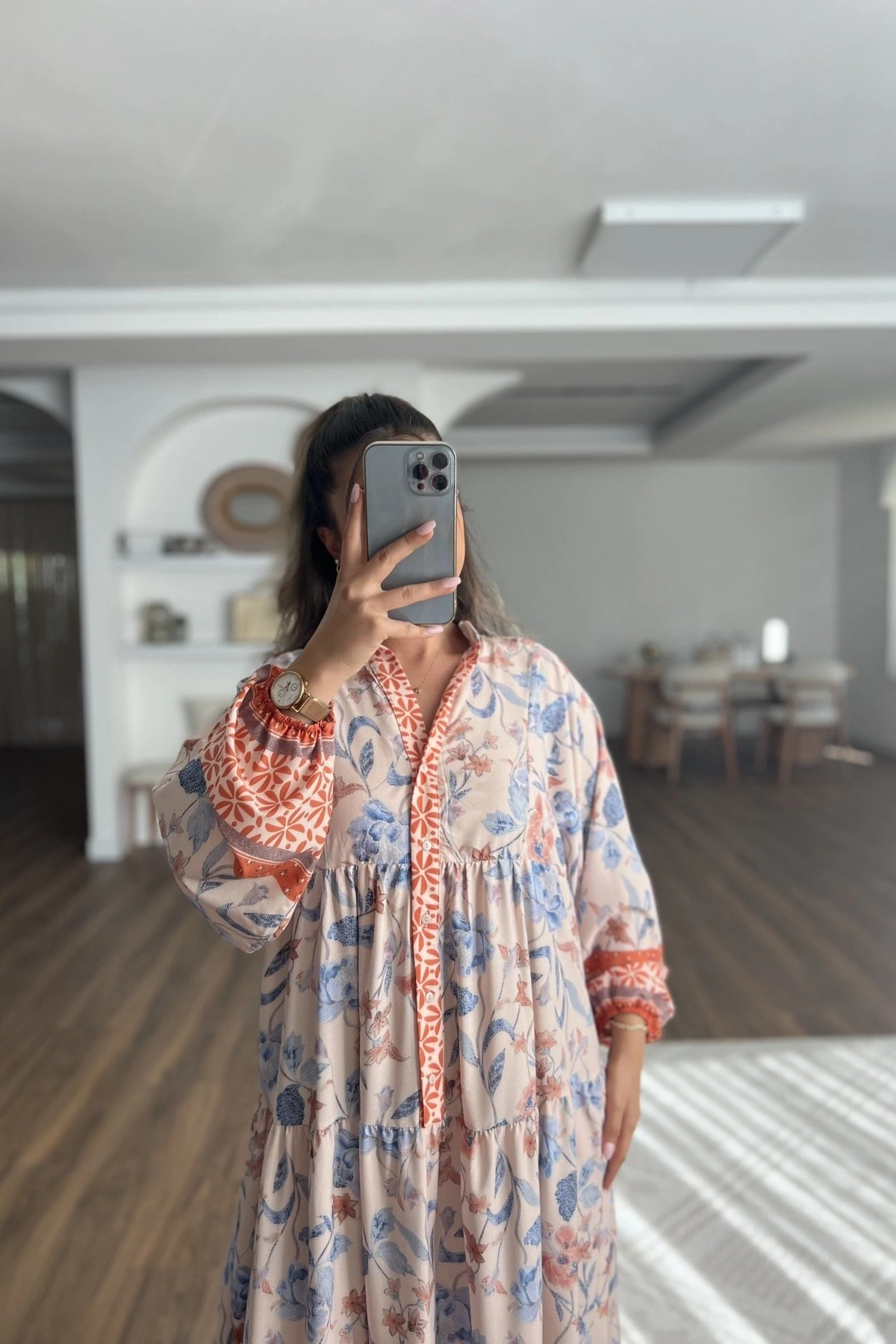 ÇİÇEK DESEN YARI PATLI TİRİL VİSKON UZUN ELBİSE – ORANGE