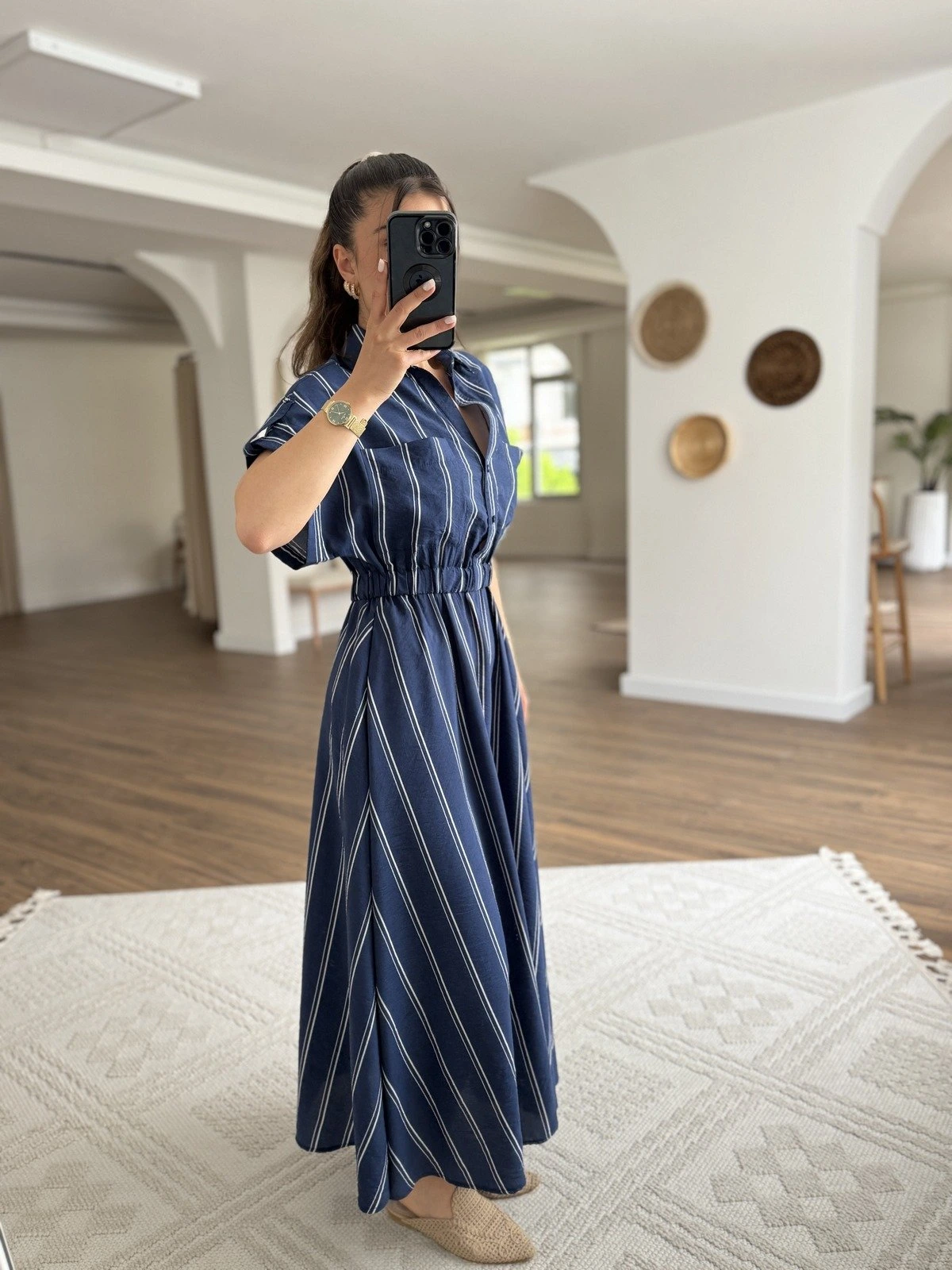 ÇİFT CEP BEL BÜZGÜ YARI PATLI UZUN VİSKON ÇİZGİLİ ELBİSE – LACİVERT EKRU