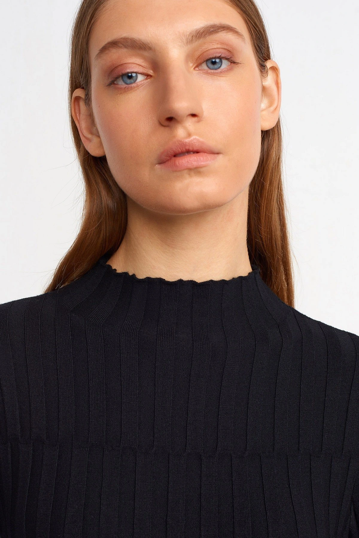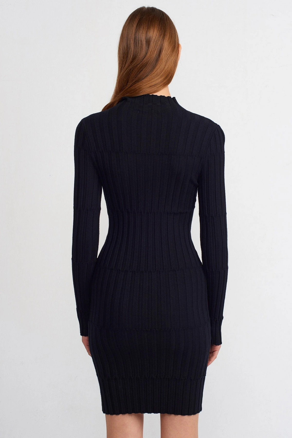 DİK YAKA FİTİLLİ VİSKON ELBİSE – SİYAH