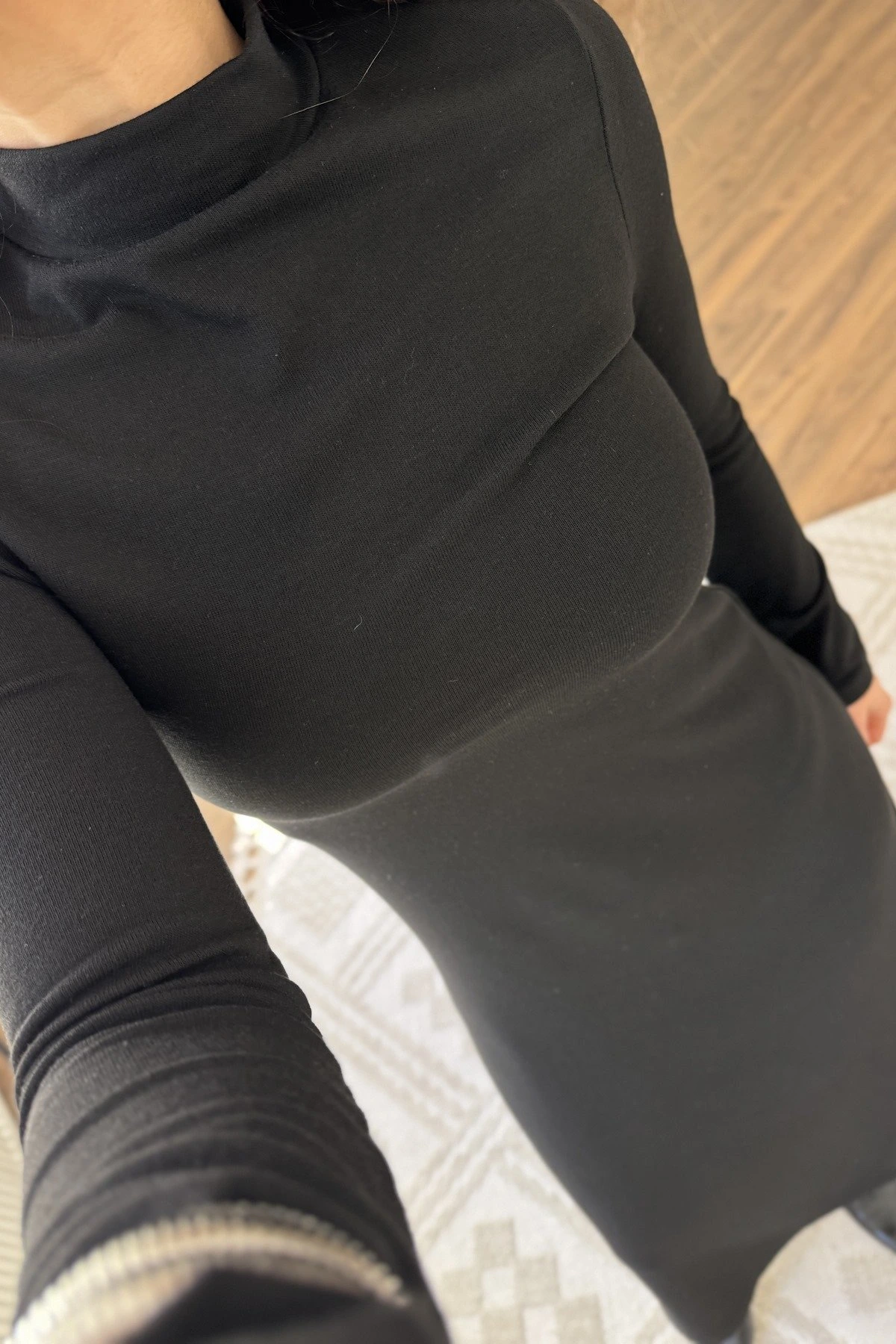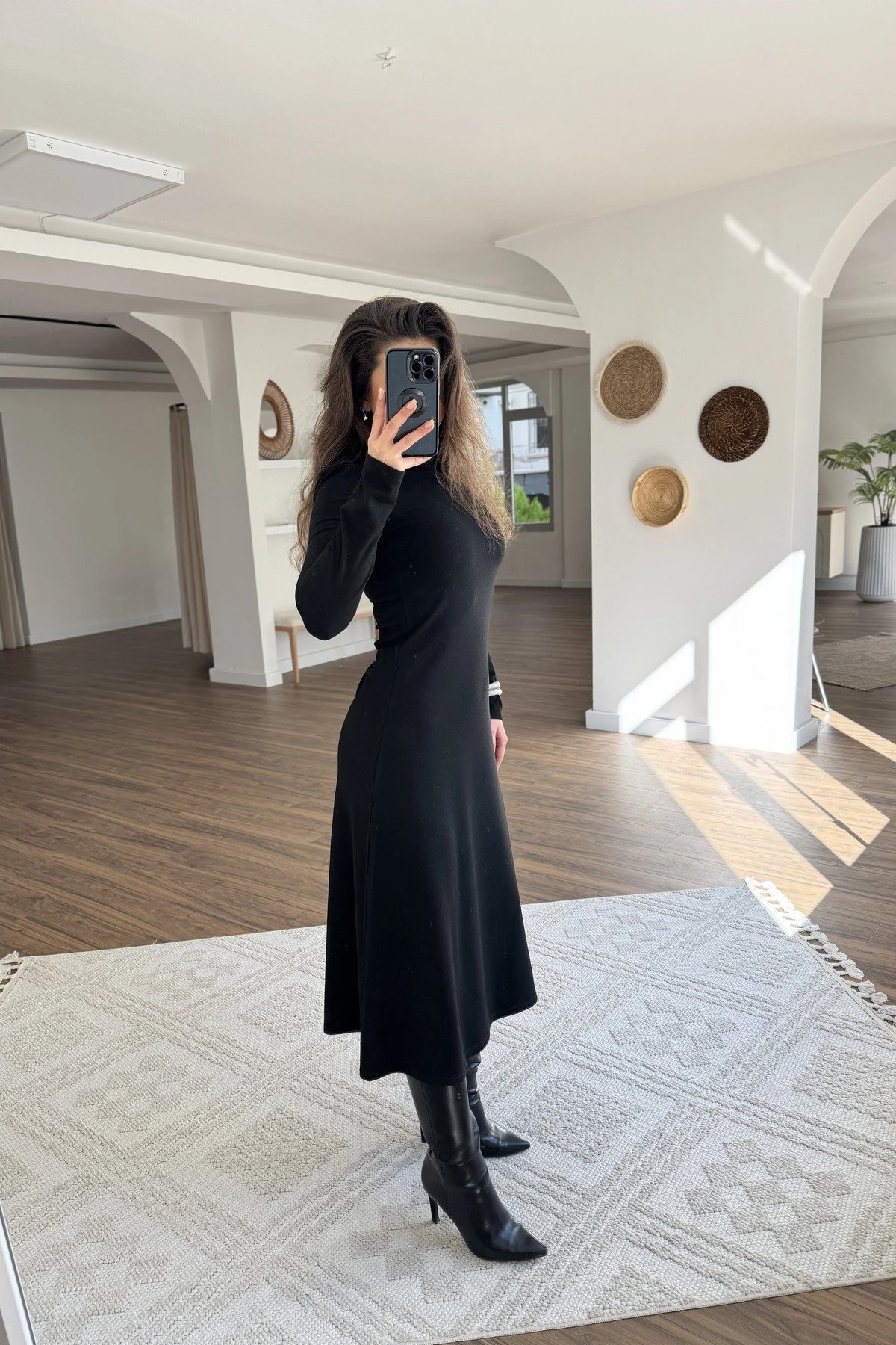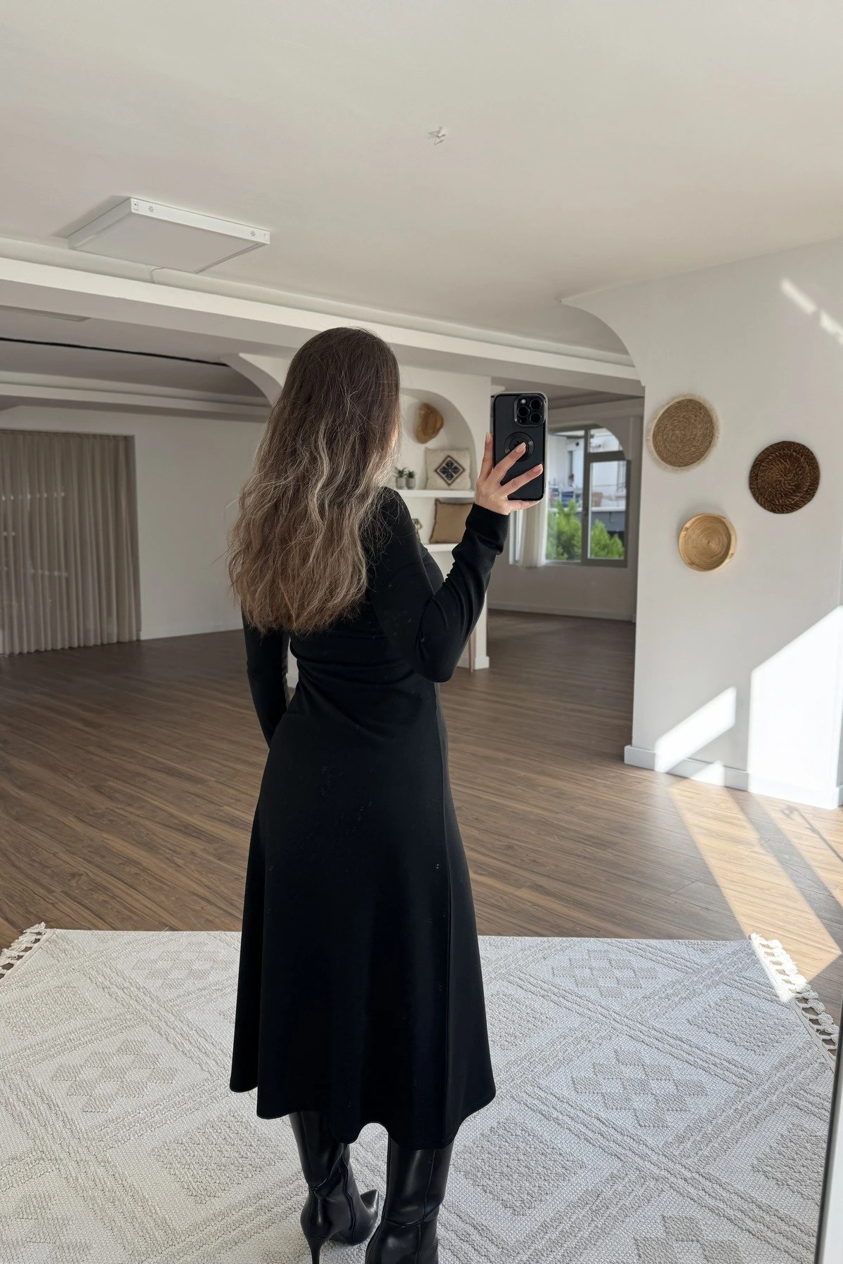 DİK YAKA VİSKON LİKRALI UZUN ELBİSE – SİYAH