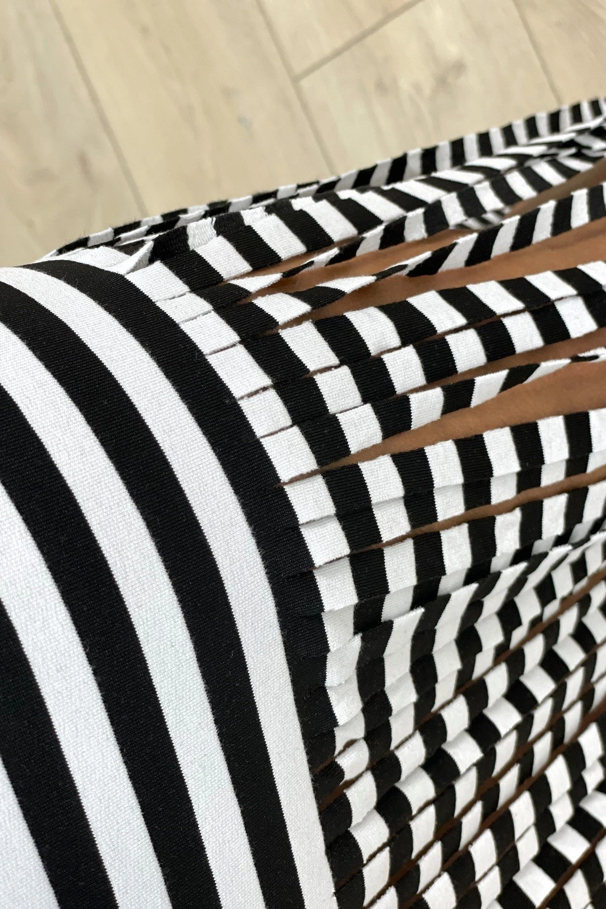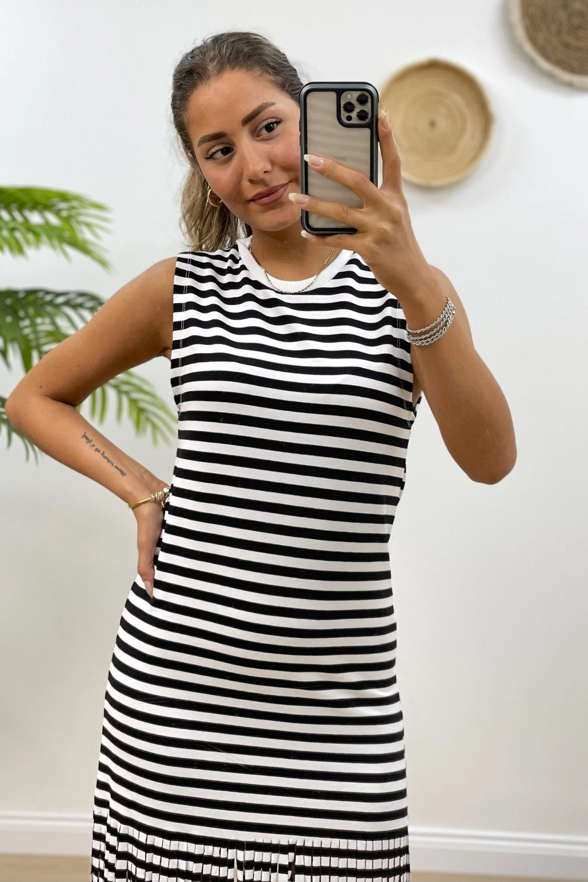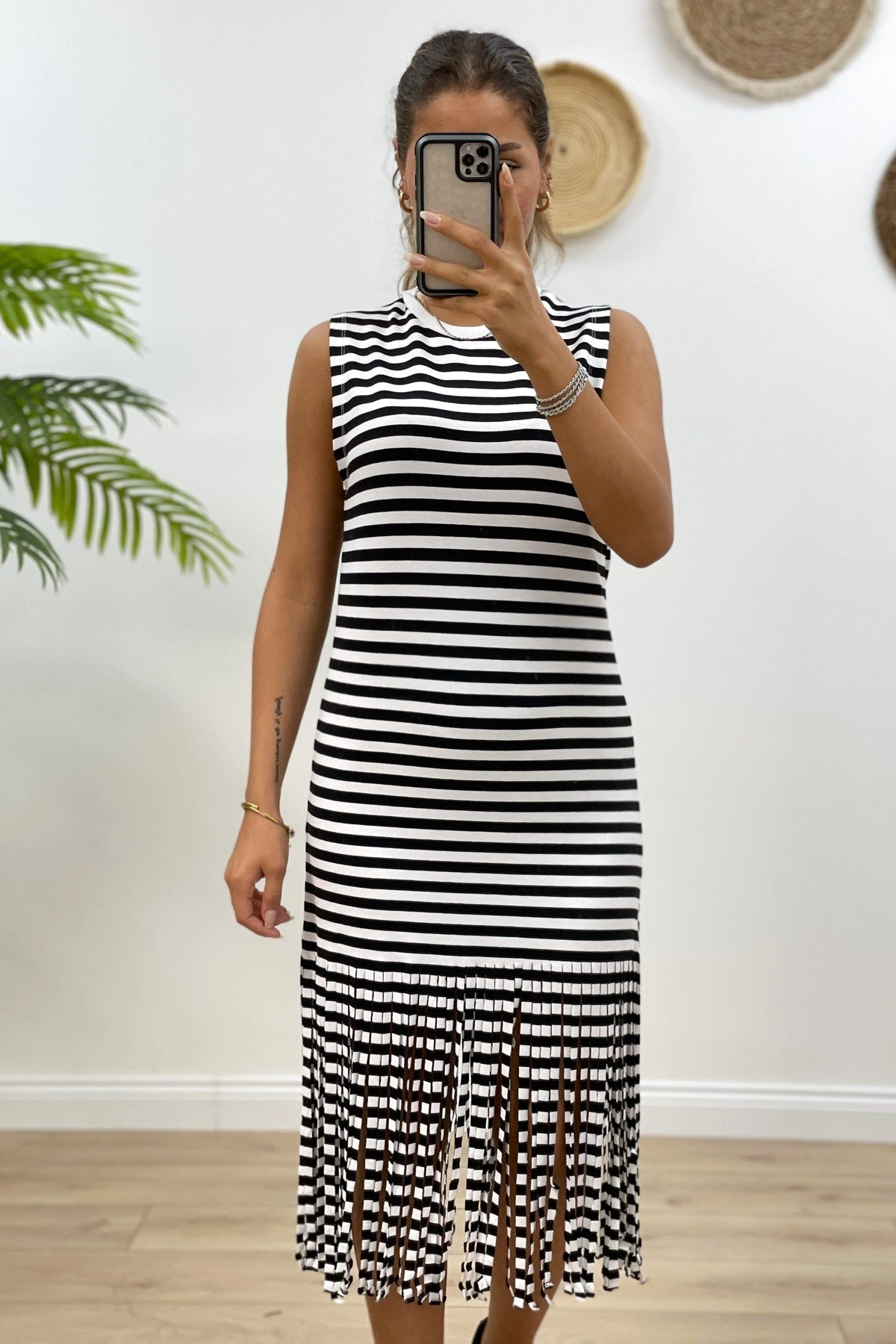 ETEĞİ PÜSKÜL ÇİZGİLİ DOKUMA ELBİSE – SİYAH