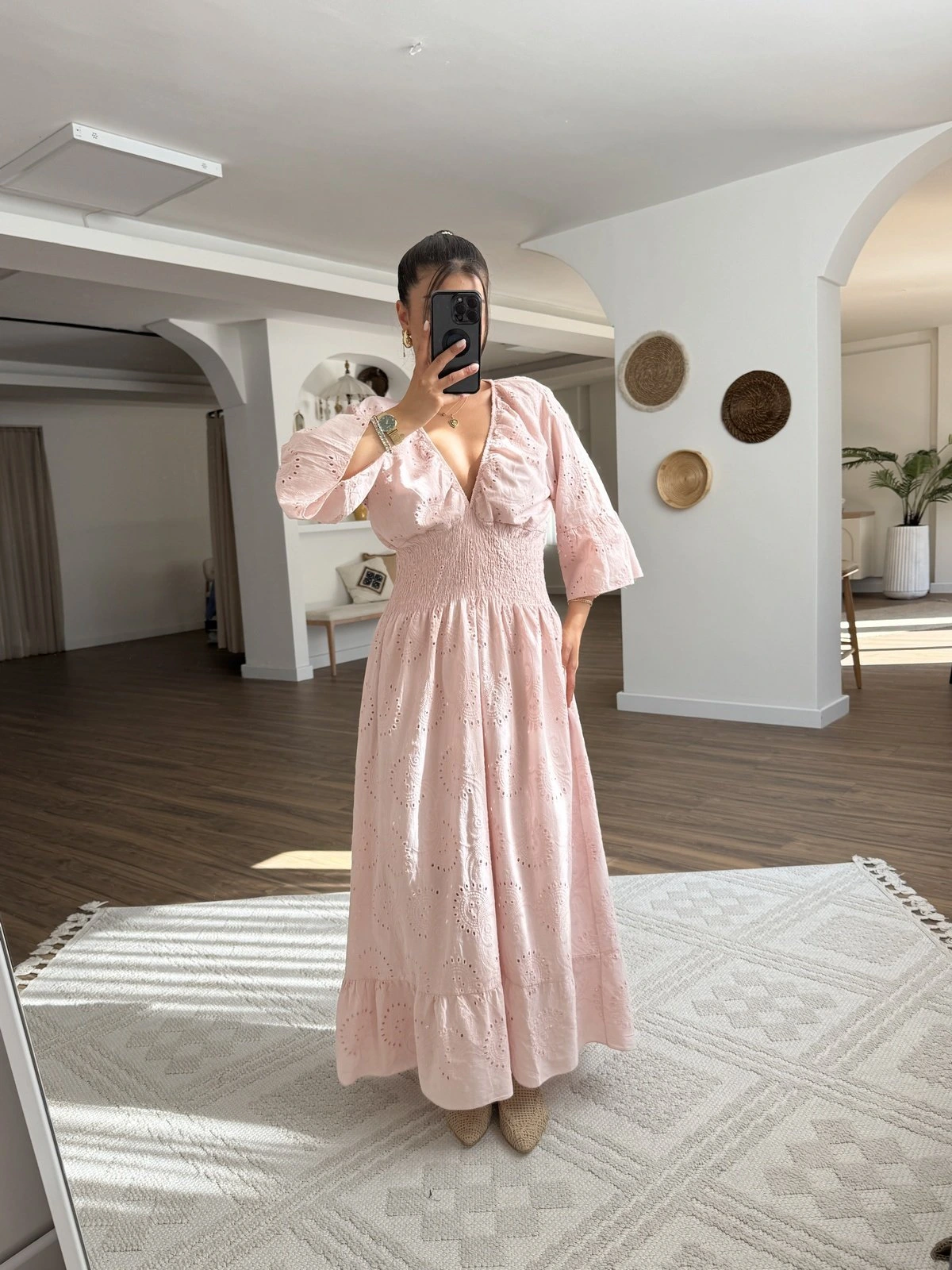 FİSTOLU BEL BÜZGÜ V YAKA ASTARLI PAMUK ELBİSE – PUDRA