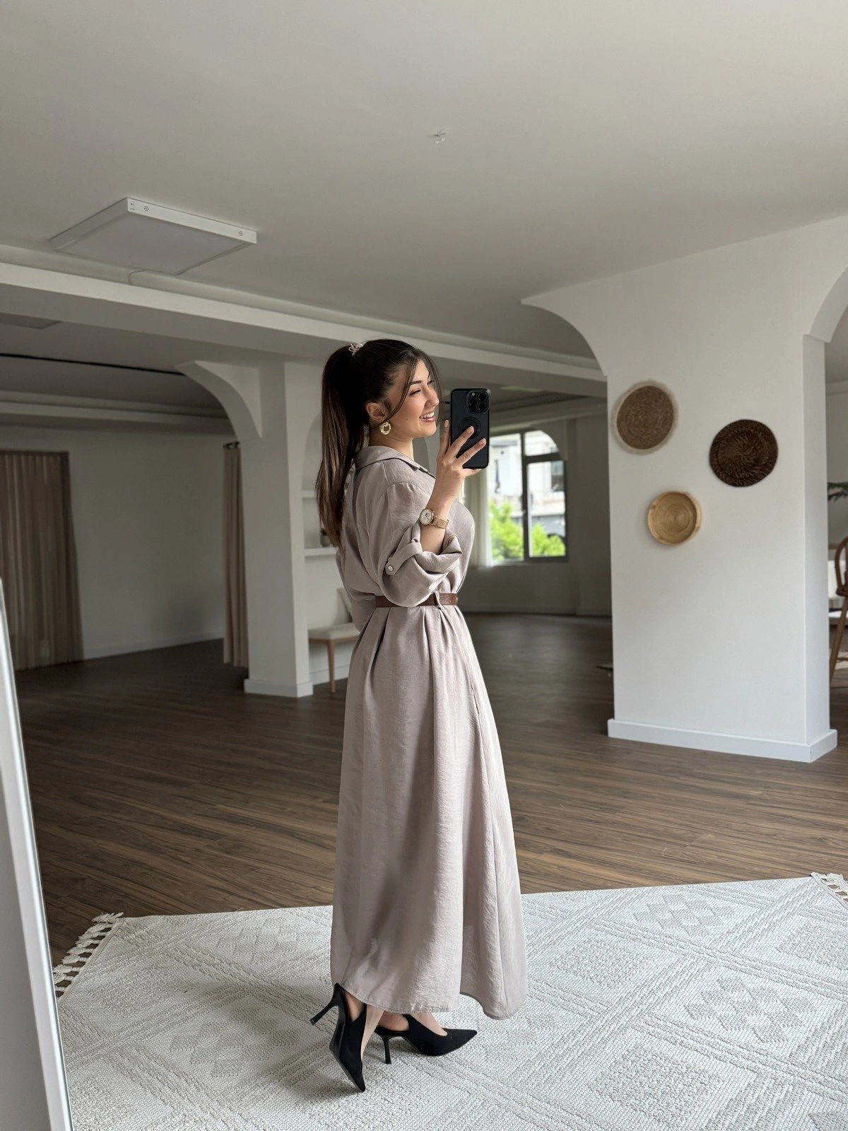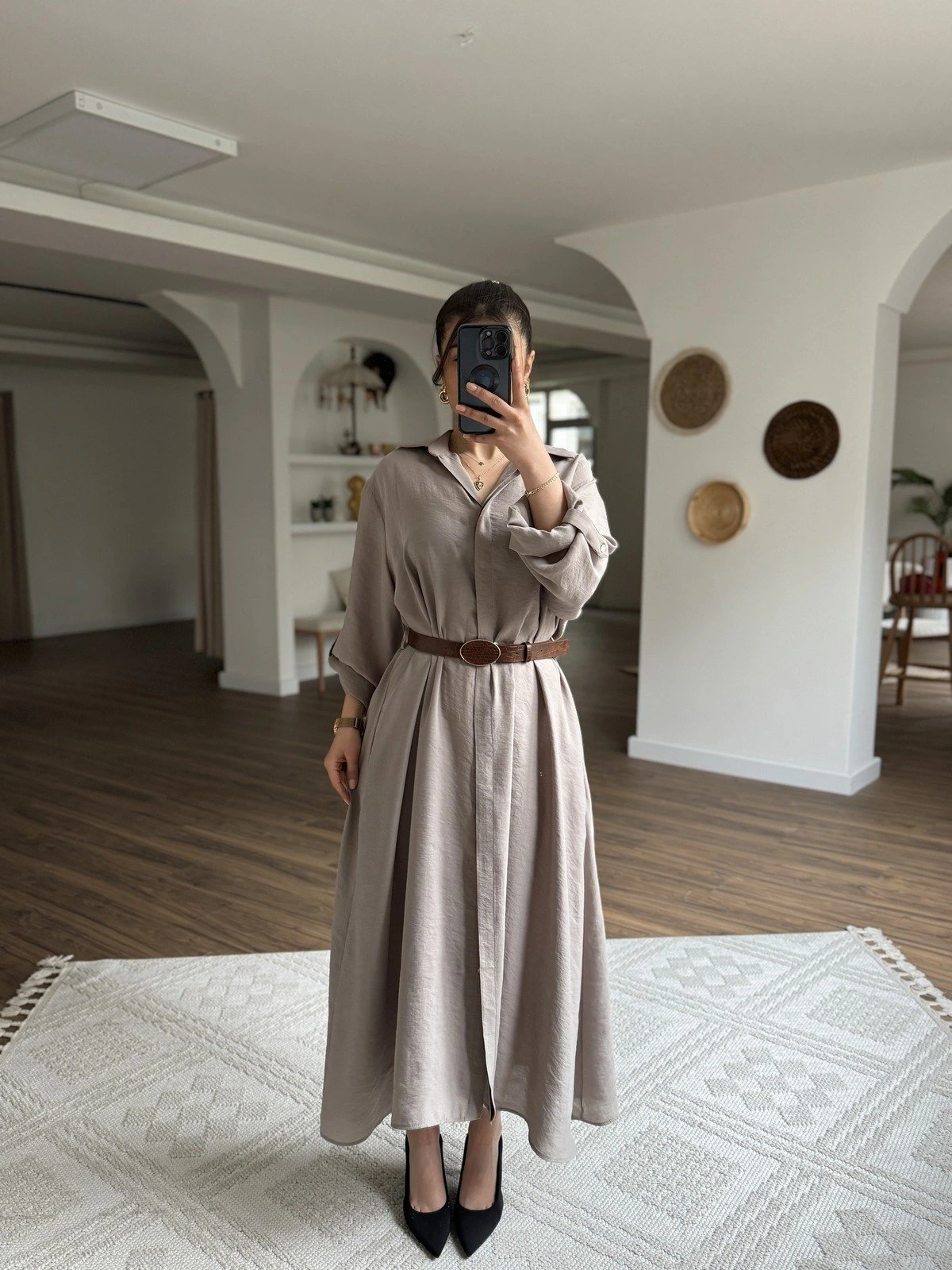 GİZLİ DÜĞME SALAŞ MODAL GÖMLEK UZUN ELBİSE – VİZON