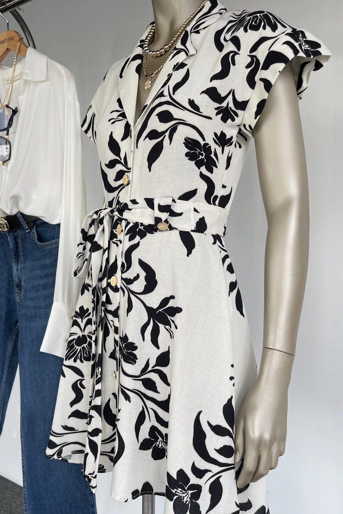 GOLD DÜĞME KISA KOL MİNİ ELBİSE – EKRU SİYAH