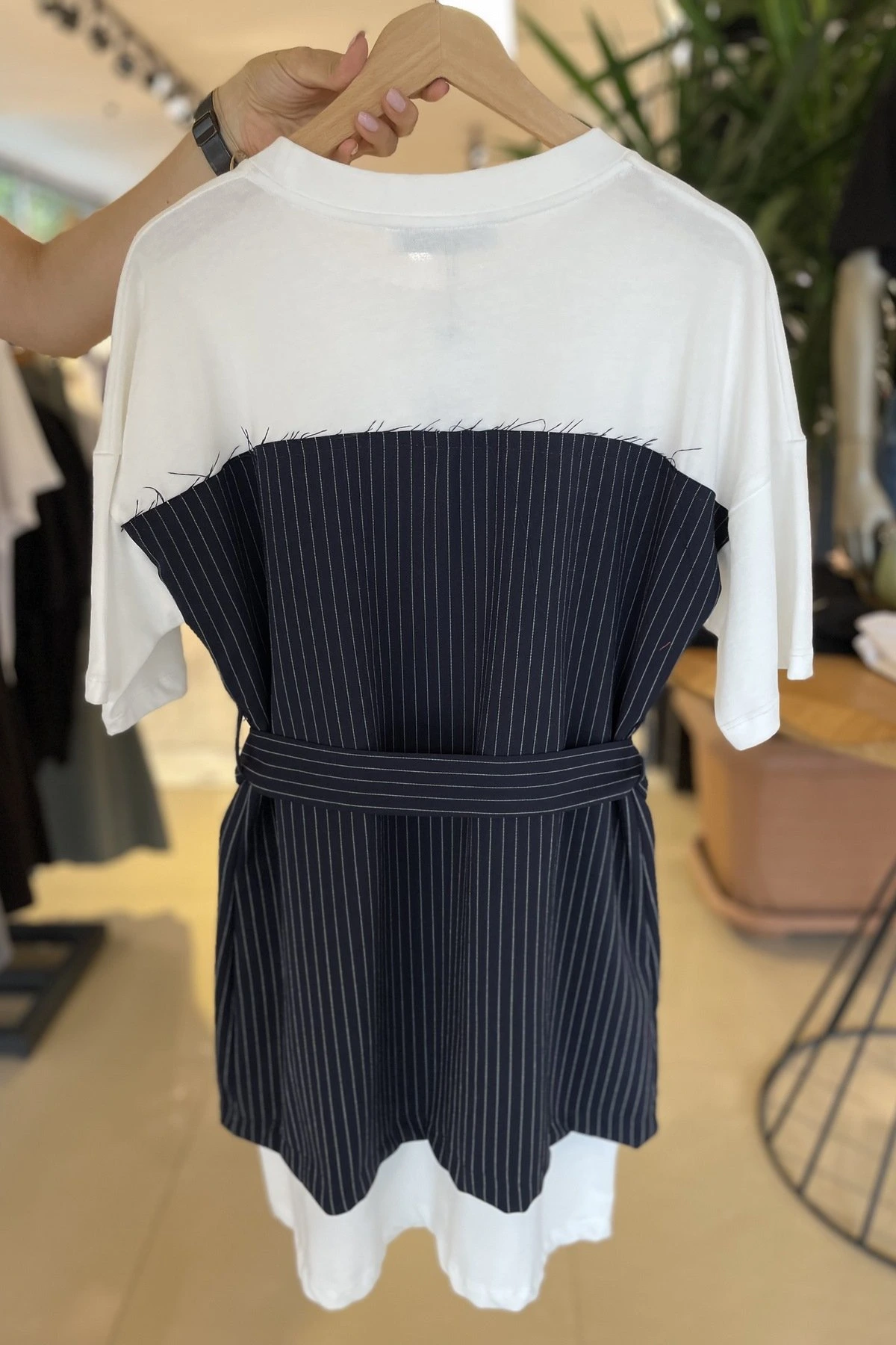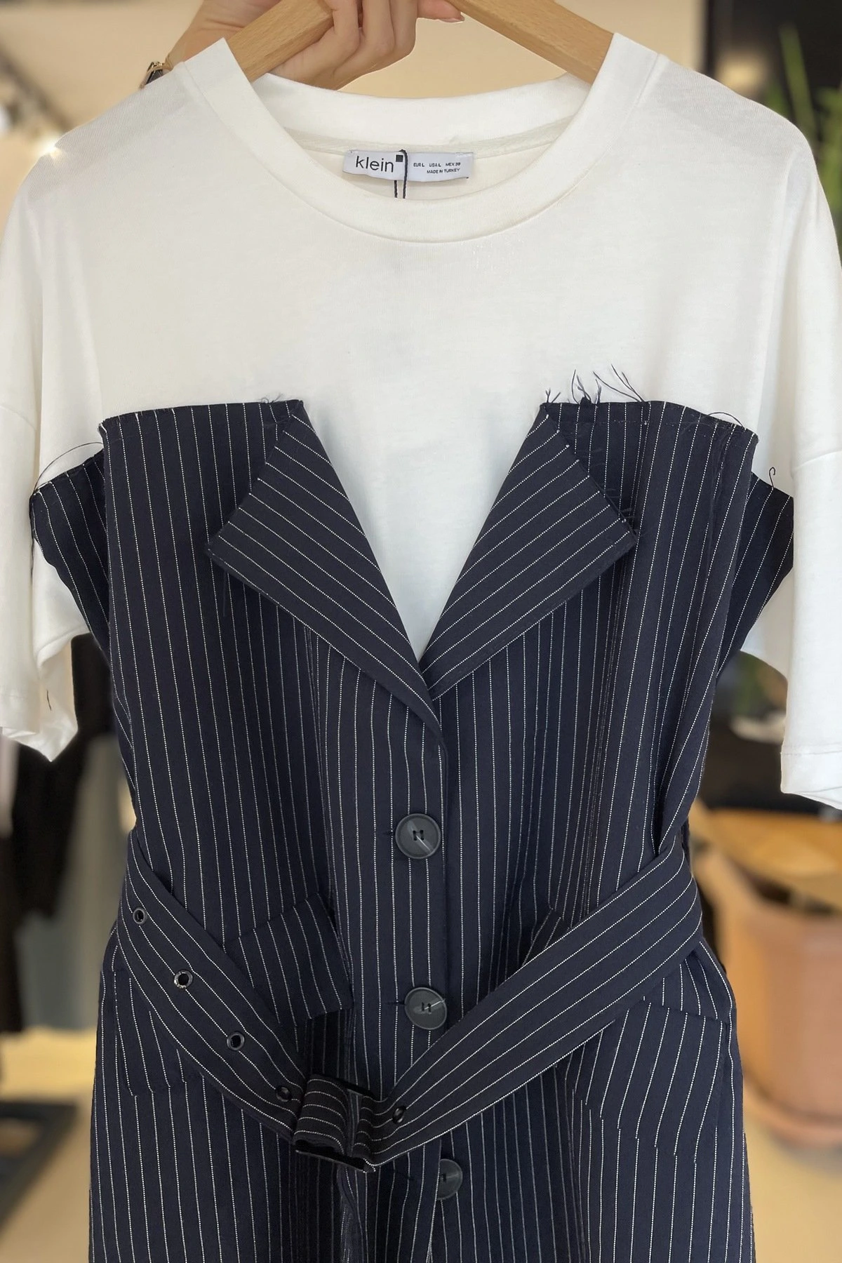 İÇİ PENYE DOKUMA ÇİZGİLİ PARÇALI KEMERLİ ELBİSE – LACİVERT EKRU