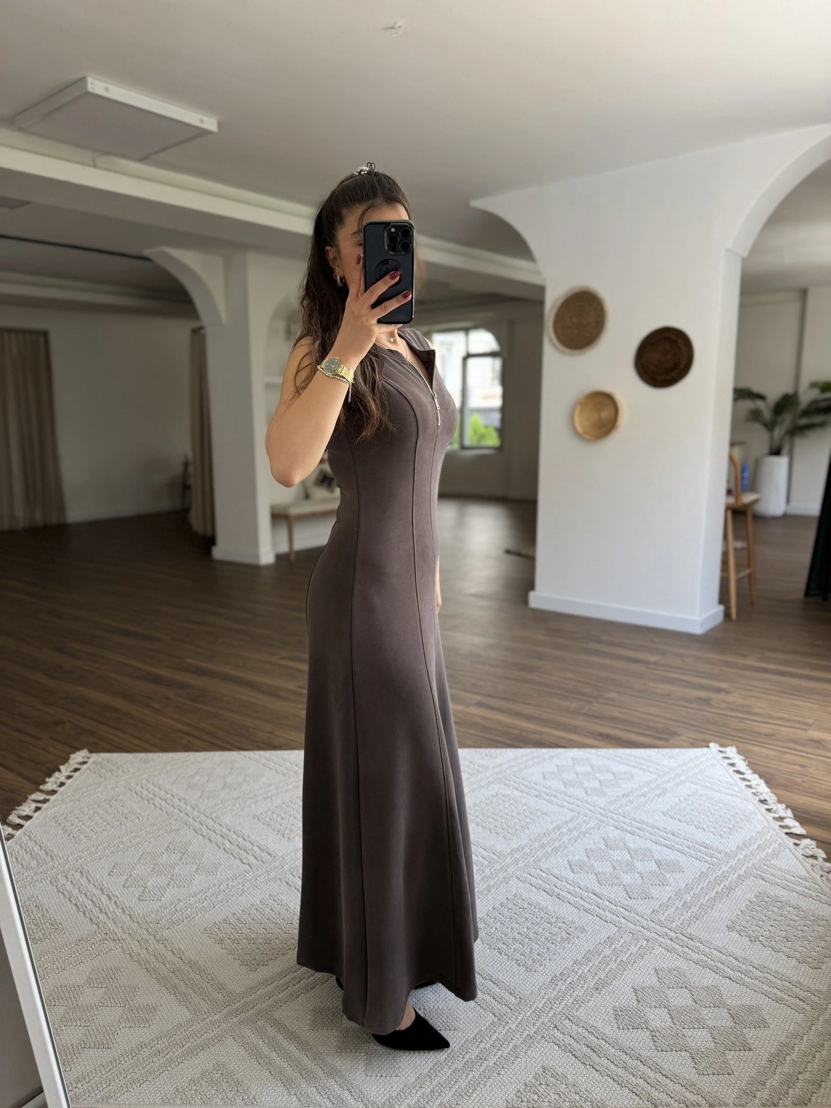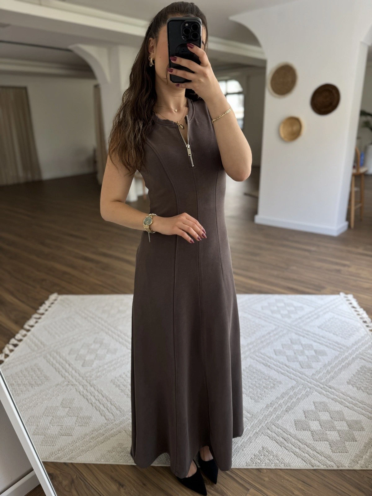 JAPONE KOL FERMUARLI PARÇA DİKİŞ UZUN PAMUK ELBİSE – KAHVE