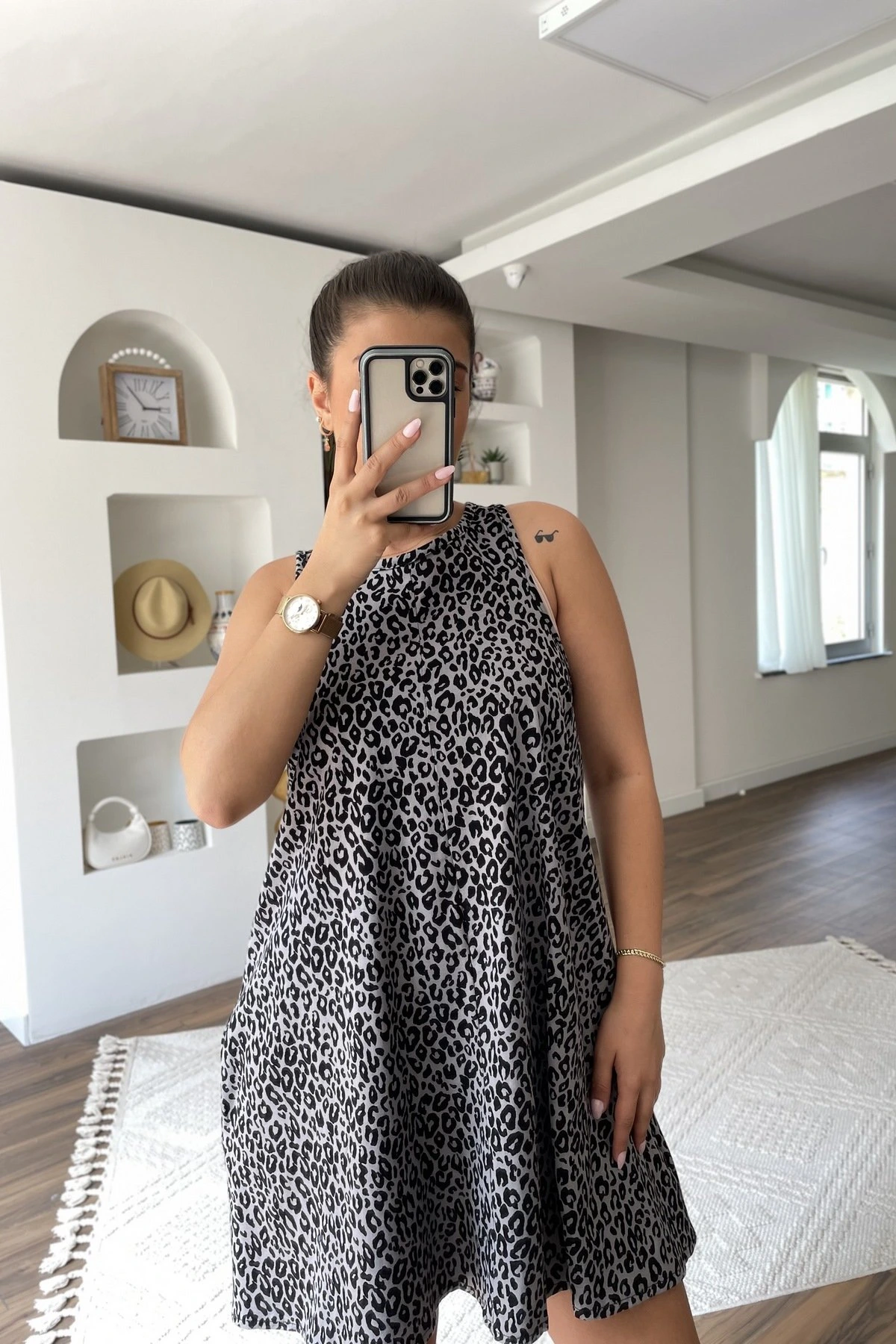 KALIN ASKI PENYE CEPLİ LEOPAR DESEN PAMUK ELBİSE – GRİ