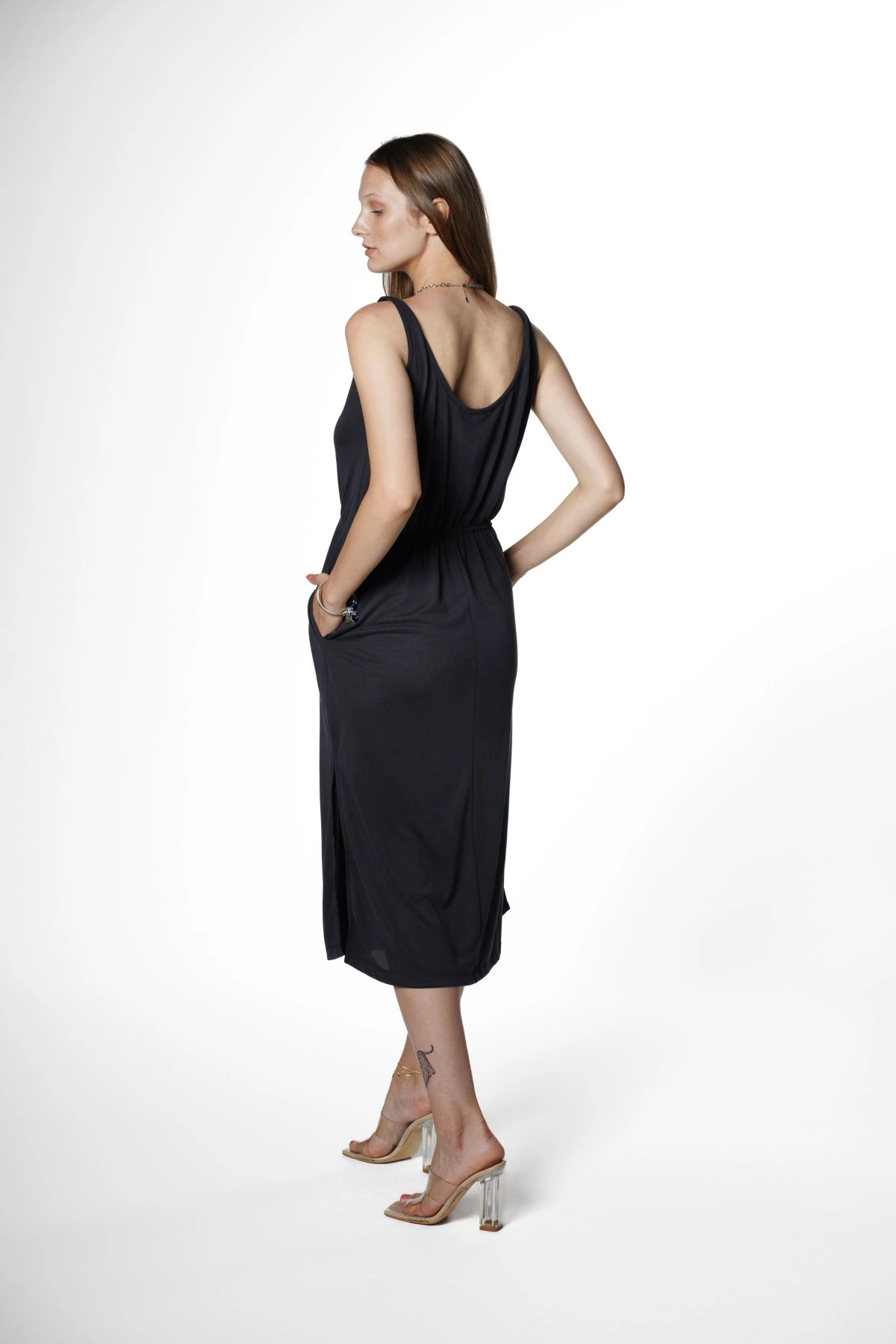 KALIN ASKILI BEL BÜZGÜLÜ YAN YIRTMAÇLI CEPLİ MODAL ELBİSE – SİYAH