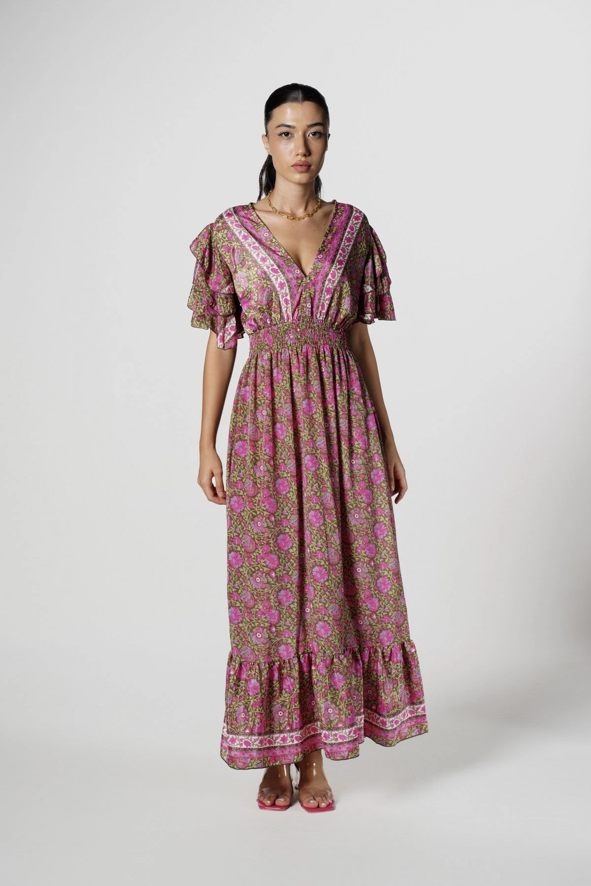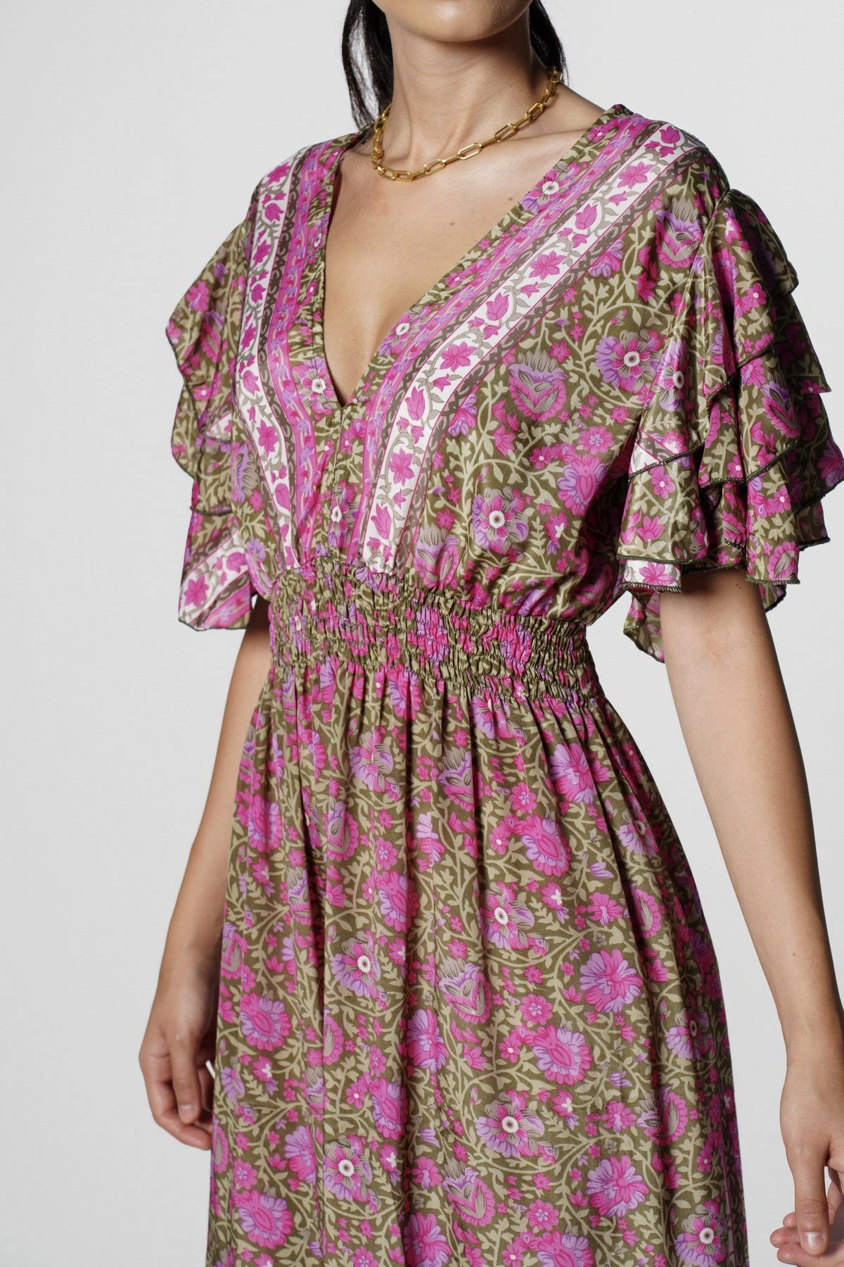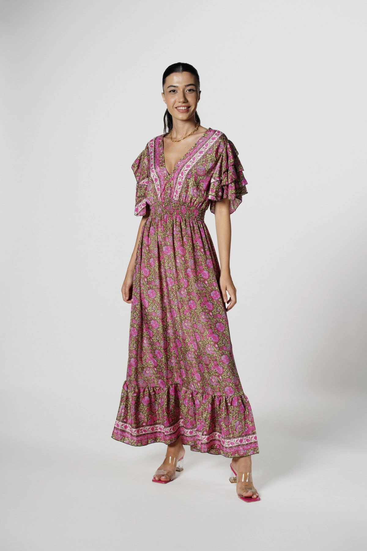 KOL VE ETEK UCU KATLI BEL LASTİKLİ ELBİSE – PEMBE