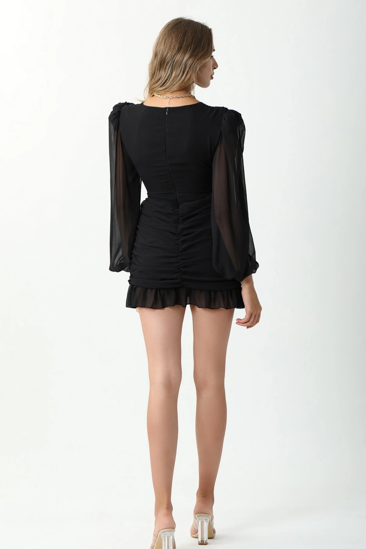 KRUVAZE YAKA BEL BÜZGÜLÜ ELBİSE – SİYAH